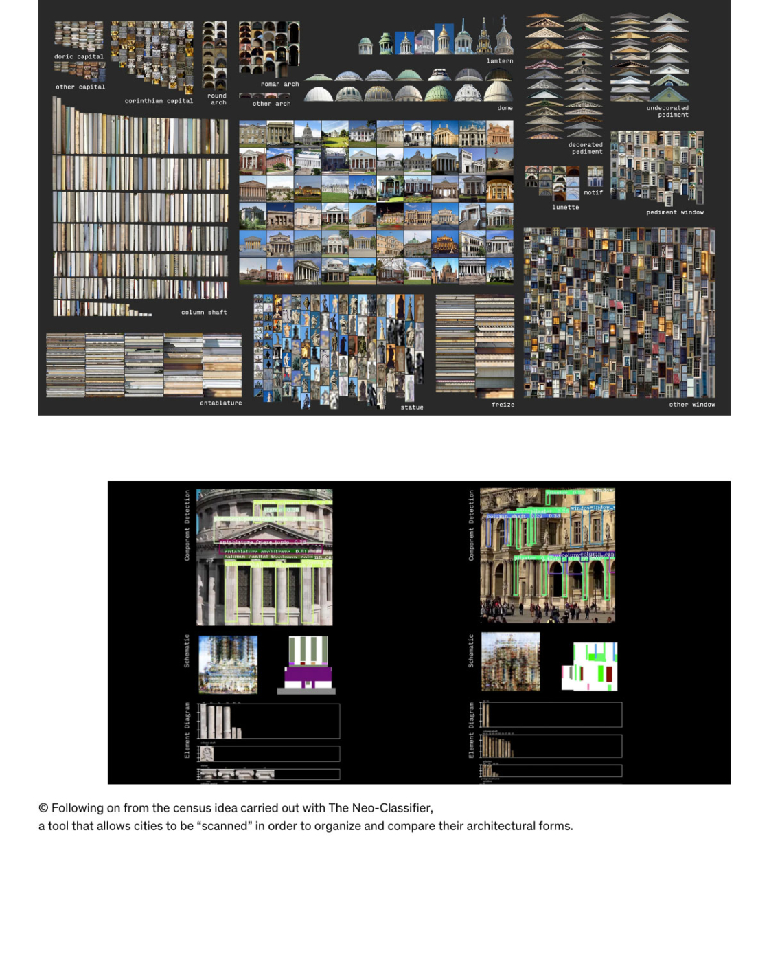 Andrew Witt, a professor at Harvard’s Graduate School of Design, illustrates the potential of AI in this field. Together with his students, he designed The Neo-classifier, a tool capable of recognizing and classifying neoclassical elements in the urban fabric, such as columns, pediments, and capitals, in order to establish a taxonomy and examine the place of neoclassicism in the city. Taking this idea further, Witt and his team have developed a system capable of “scanning” entire territories, such as in China, where this tool has made it possible to identify elements of traditional architecture with unparalleled speed and to establish an exhaustive map of cultural heritage to be preserved.