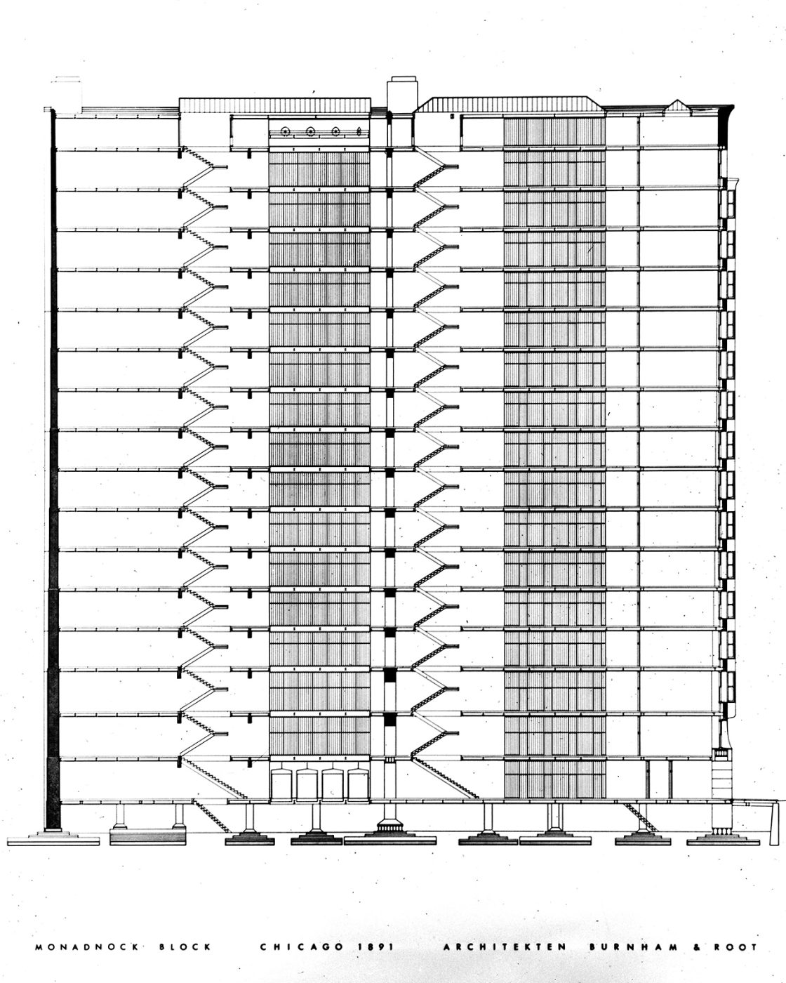Wanted-1st, a story below-ground, containing boilers, engines of various sorts, etc.,-in short, the plant for power, heating, lighting, etc. 2nd, a ground floor, so called, devoted to stores, banks, or other establishments requiring large area, ample spacing, ample light, and great freedom of access. 3rd, a second story readily accessible by stairways,-this space usually in large subdivisions, with corresponding liberality in structural spacing and expanse of glass and breadth of external openings. 4th, above this an indefinite number of stories of offices piled tier upon tier, one tier just like another tier, one office just like all the other offices,-an office being similar to a cell in a honey-comb, merely a compartment, nothing more. 5th and last, at the top of this pile is placed a space or story that, as related to the life and usefulness of the structure, is purely physiological in its nature,-namely, the attic. In this the circulatory system completes itself and makes its grand turn, ascending and descending. The space is filled with tanks, pipes, valves, sheaves, and mechanical et cetera that supplement and complement the force originating plant hidden below-ground in the cellar. Finally, or at the beginning rather, there must be on the ground floor a main aperture or entrance common to all the occupants or patrons of the building.