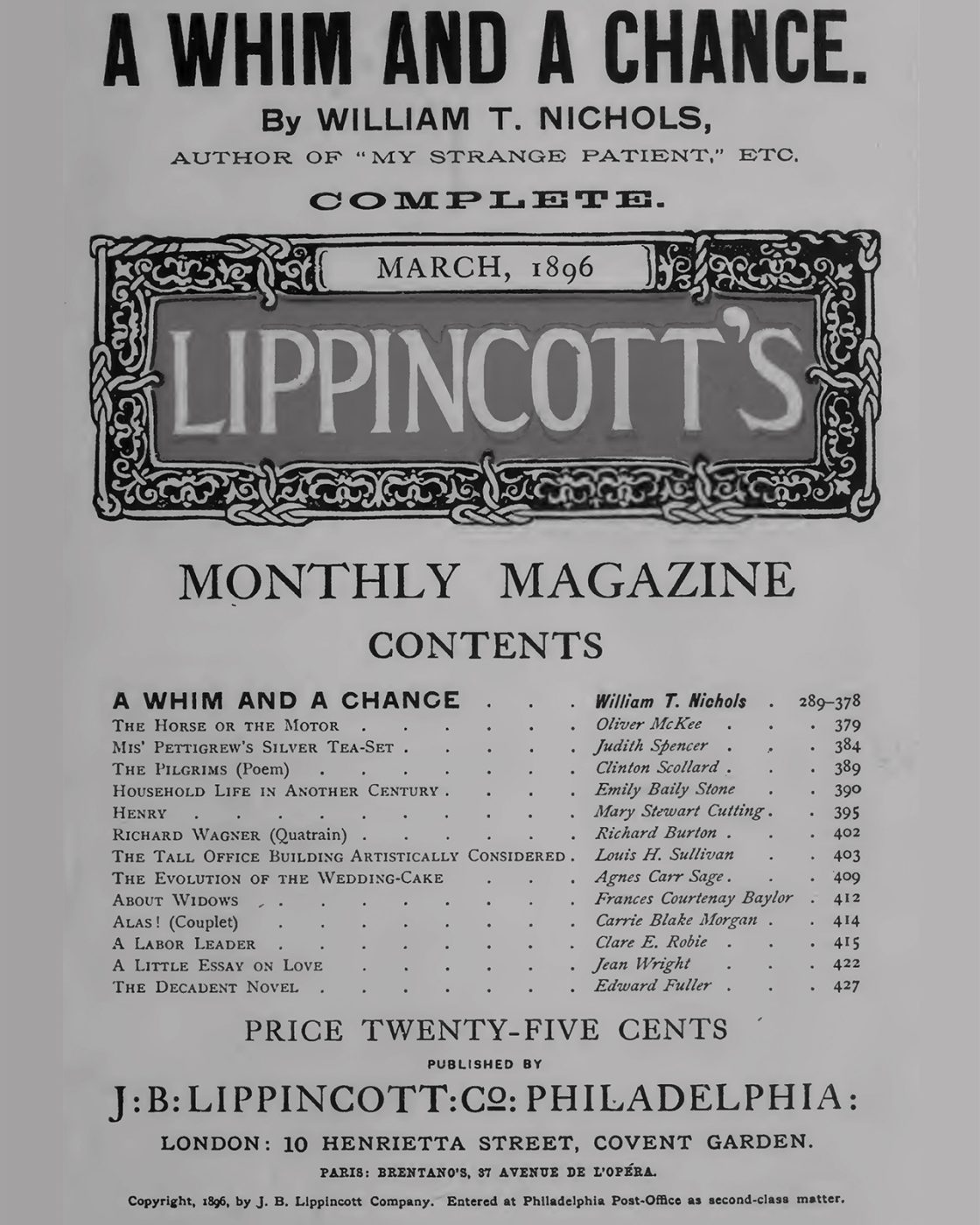 I assume now that in the study of our problem we have passed through the various stages of inquiry, as follows: 1st, the social basis of the demand for tall office buildings; 2nd, its literal material satisfaction; 3rd, elevation of the question from considerations of literal planning, construction, and equipment, to the plane of elementary architecture as a direct outgrowth of sound, sensible building; 4th, the question again elevated from an elementary architecture to the beginnings of true architectural expression, through the addition of a certain quality and quantity of sentiment.