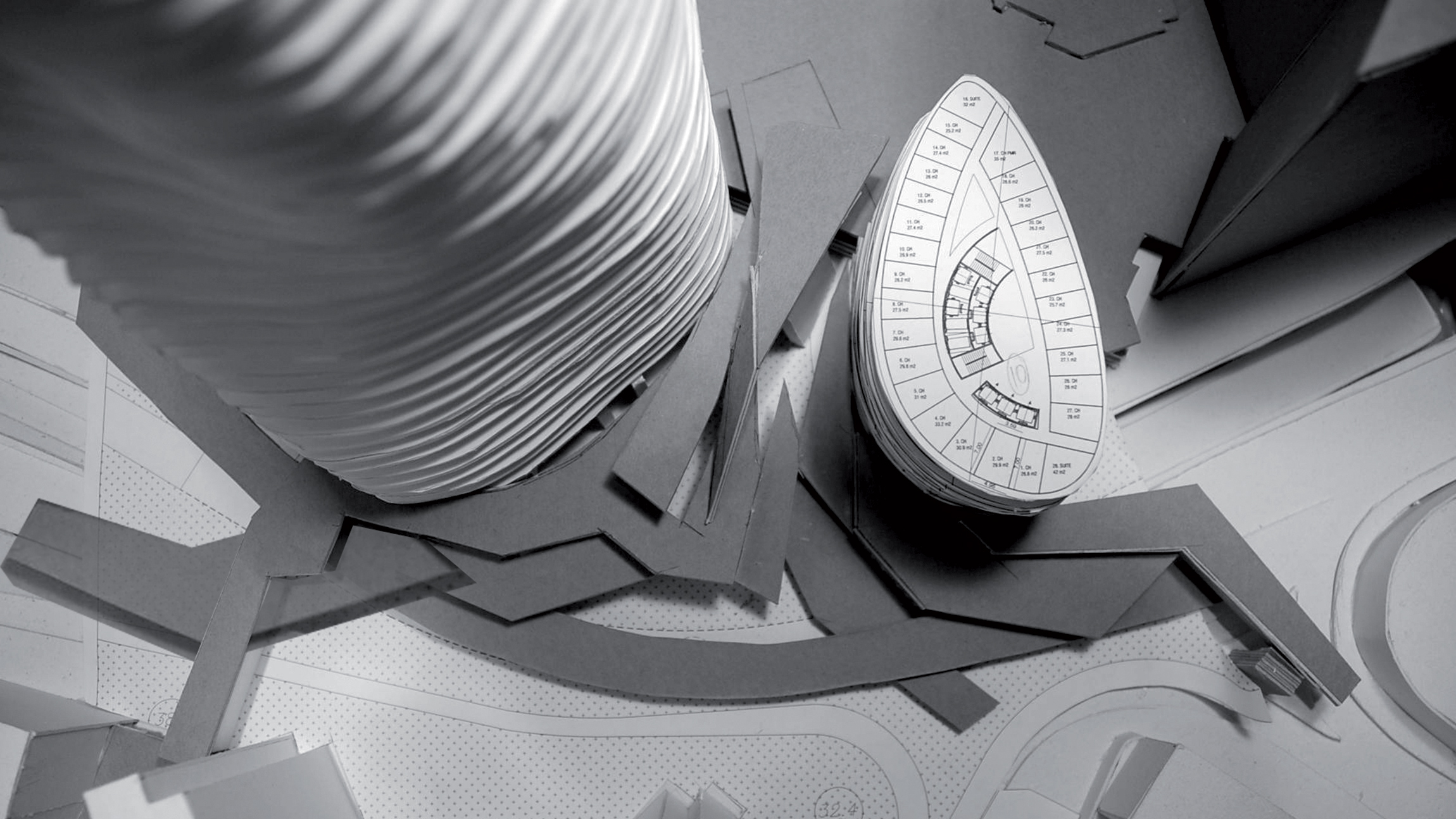 In the context of a revitalization of La Défense, PCA-STREAM has imagined a complex form that grows through morphogenesis. The two towers of different sizes, 235 meters and 145 meters, represent 90,000m² and 45,000m² respectively, with around 8,000m² of facilities and commercial spaces at the foot of the towers. This configuration, preferred to a larger single tower, allows for a larger exploitable surface and, more importantly, to embody a programmatic ambition: the first tower houses offices, a daytime activity while the second contains accommodation and a hotel, used at night. A dynamic emerges between the two towers through their base, an element of urban interlacing in public space.