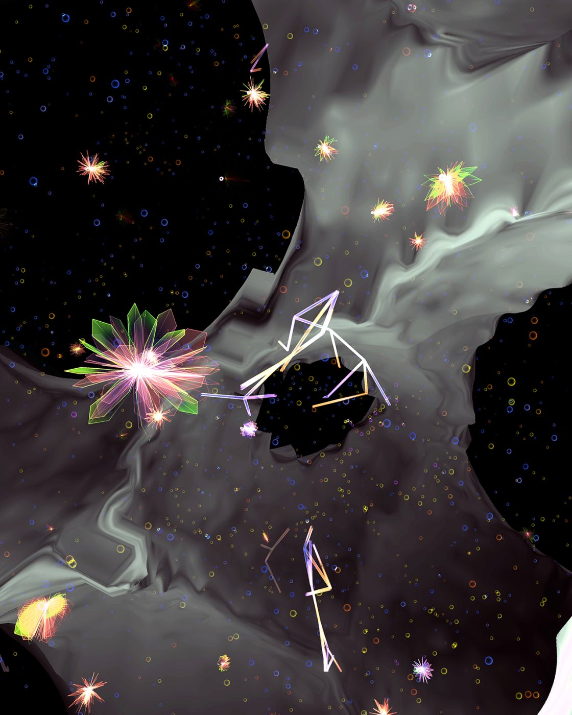 Each world begins with multiple intensive and dynamic fields: flows, fluids, topographies, temperatures, chemical concentrations, waves, illuminations, etc. All life must find its resources in this environment, and will leave traces upon it. Metabolic systems must maintain sufficient energy to survive, and every activity expends some of this energy, including growth and even metabolism itself. Creatures may also communicate via the environment, such as leaving trails of “pheromones” for others to follow. More generally, we believe that any new aspect added to the world must fully integrate with multiple other aspects (including humans), affecting them and being affected by them in a continuous interplay.