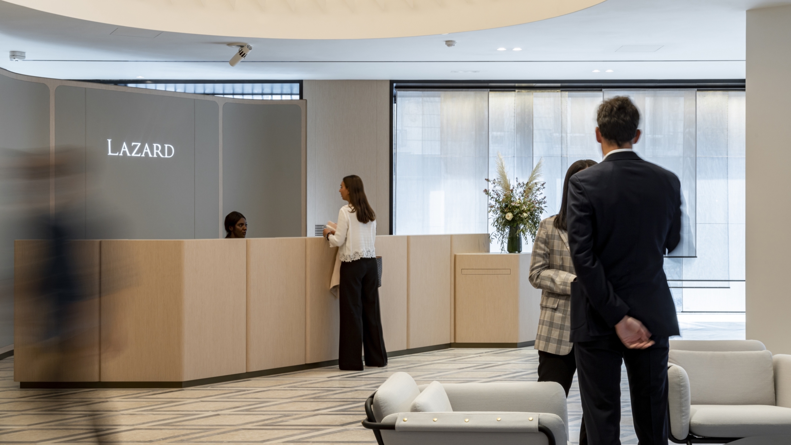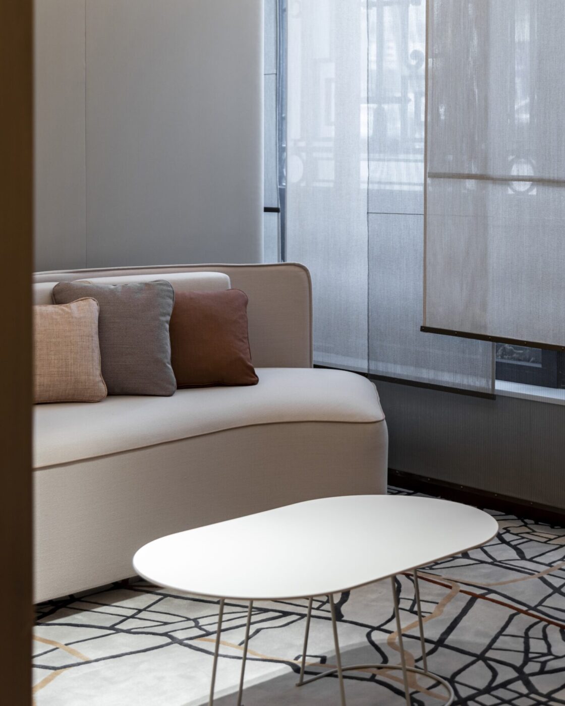 The reception area features a lobby, followed by a number of VIP lounges named after the cities in which Lazard operates, reflecting the global dimension of its business. On the floor, custom-made carpets stylize the maps of the cities in question. To maximize comfort, the lounges feature indirect lighting, walls draped in fabrics that are acoustically comfortable, or custom-made banquettes that contribute to the feeling of a hushed, elegant and comfortable atmosphere. All furnishings are custom-made and handcrafted in Europe. The project favors noble natural materials – stone, wood, wool, linen, metal… – which always have both a functional and aesthetic role.