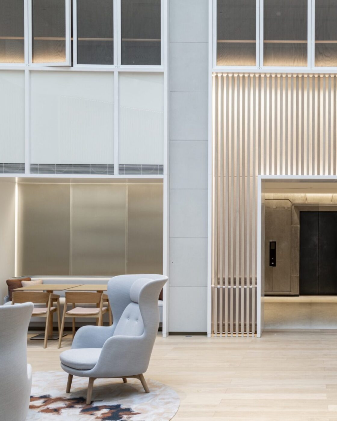 Corridors and lounges feature carpentry work that emphasizes the quality of detail: remarkable finishes, curtained doors, matching skirting boards, curves and hollow joints… The project as a whole develops a perfect integration of technology with custom-made fittings. The lobby floor is treated with marble tiles, a motif repeated in the chandelier in the main reception area and the tiles in the glass roof. The elevator platforms have stone floors, with reconstituted stone walls featuring Haussmann-style moldings, while the walls of the main core graphically echo the chains of the exterior railings. This consistency of motifs and materials contributes to the uniqueness of Maison Lazard’s new image.
