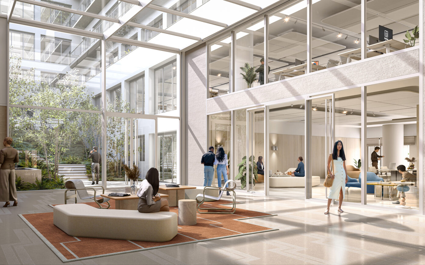 Beyond the building’s name, the team wanted to spatially embody this approach with the Stream Café, which takes on both a symbolic and practical dimension, as a welcome to the office program, occupied by OVH, a French leader in cloud computing. In the center of the building, at the foot of the vegetation gap, the main entrance leads directly to a third place, the Stream Café, in place of the reception desk of a traditional office program. Designed by the agency’s interior architecture department, its layout is based on a choice of comfortable furnishings in warm tones and textures, in wood, leather or felt, giving it a pleasant, domestic feel far removed from the formal codes of the office.