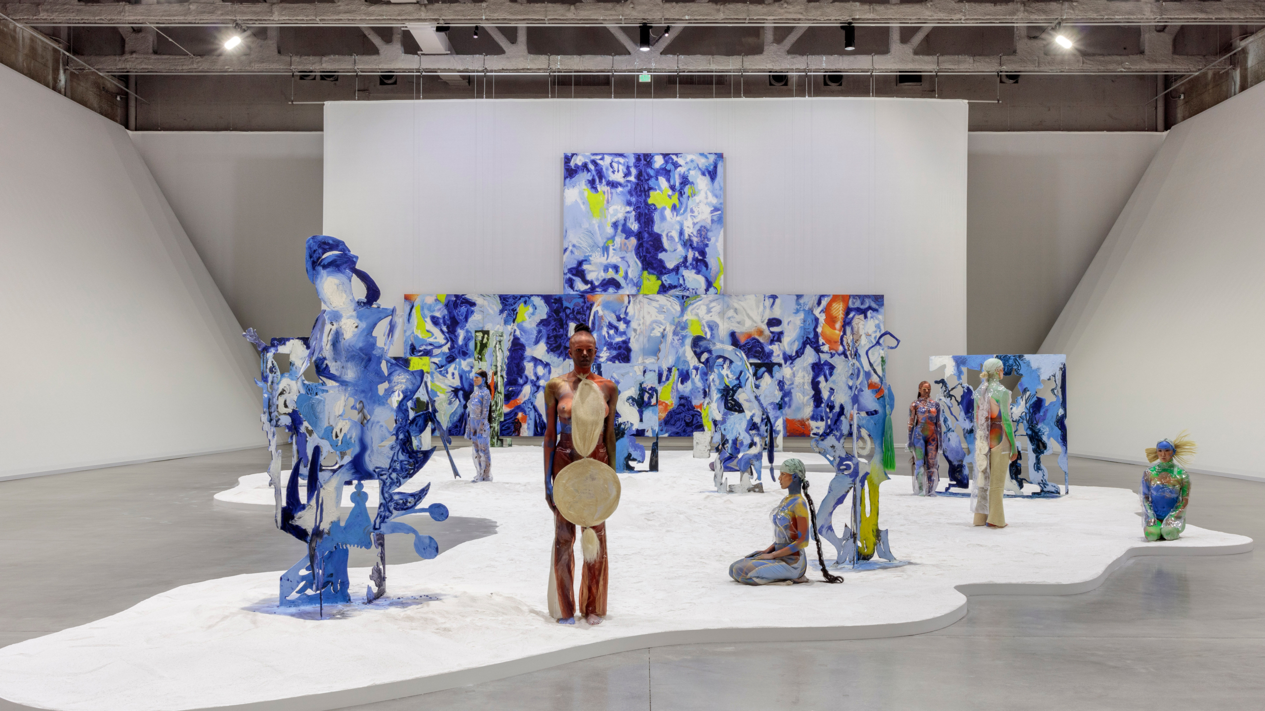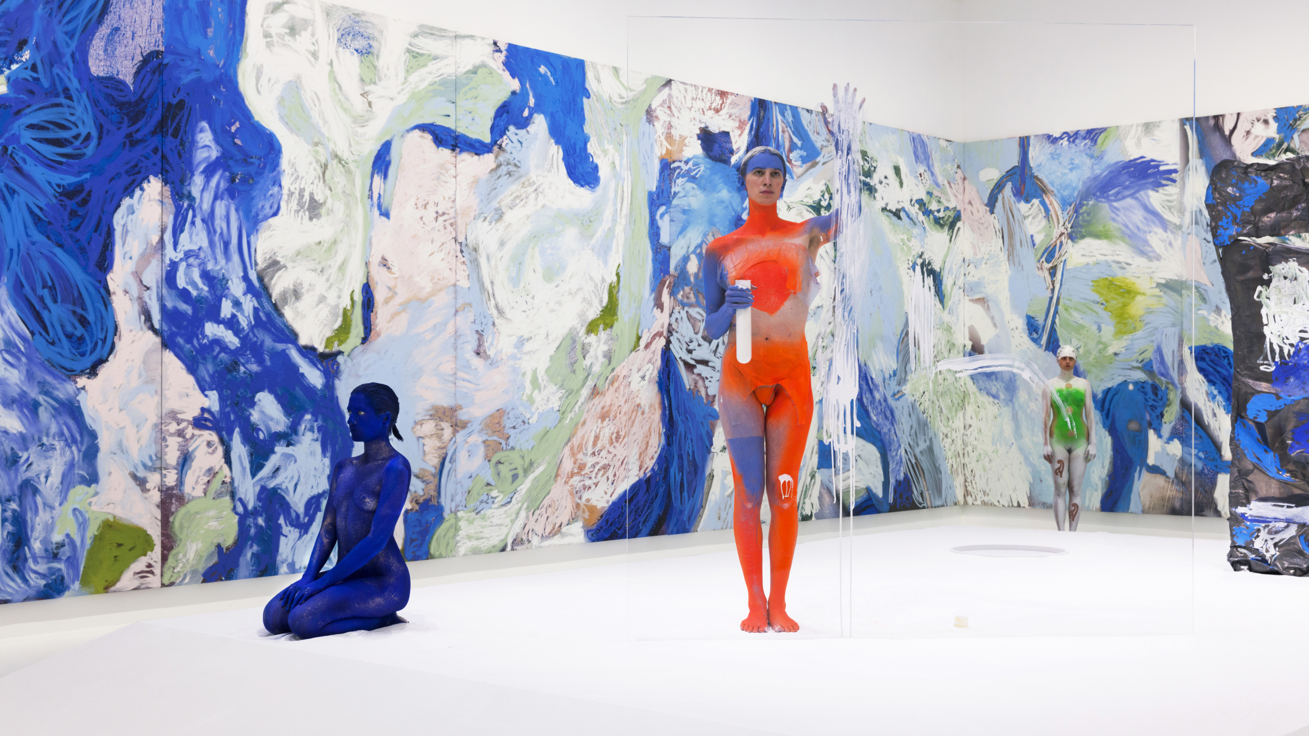 Donna Huanca questionne les systèmes de connaissance, puisant dans l’imaginaire indigène et la croyance animiste en la présence dans toute forme d’existence d’une force vitale d’affect. Dans des scénarios futuristes–préhistoriques, les corps fluctuent librement dans une chorégraphie au rythme lent, faite de méditations et de rituels privés qui sont partagés au sein du groupe. Les peintures, sculptures et interprètes sont tous imprégnés de pigments cosmétiques, unifiant l’animé avec l’inanimé, l’humain avec le minéral, l’organique avec le synthétique. Lorsqu’il lui a été demandé si le bleu éclatant dans son oeuvre faisait référence au bleu Klein, Huanca s’est refusée à positionner son travail au sein des chronologies de l’histoire de l’art. Son rôle consiste plutôt à faire l’expérience de visions de ce à quoi pourrait ressembler un futur féminisé, de ce que celui-ci valoriserait. « Pour moi, il ressemblerait à la prévenance, la confiance, la communauté, le monde naturel, et le caractère interconnecté et d’interdépendance des corps au sein du monde naturel. »