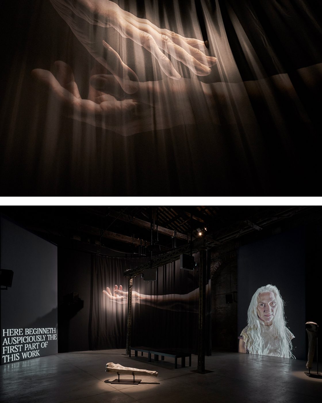 Avec une installation multisensorielle intitulée Tremblez Tremblez [Tremble Tremble], Jesse Jones réveille la voix de Lucy, notre ancêtre fossile australopithèque d’il y a trois millions d’années, les voix des procès en sorcellerie du seizième siècle et des voix contemporaines issues des débats autour de la législation sur l’avortement en Irlande. Jones puise dans ses recherches sur la manière dont la loi perpétue la mémoire au fil des générations et souffle une histoire alternative des origines pour les femmes sous The Law of In Utera Gigantæ [La Loi d’in utera gigantæ], un corps symbolique gigantesque qui place le corps maternel complètement au-dessus de la loi et de l’État. « Avant que le livre de la loi n’ait été écrit dans des langues terrestres, il existait une autre loi, transmise de génération en génération, de fille en fille. Elle était tracée en lettres de lait et véhiculée par murmures. »