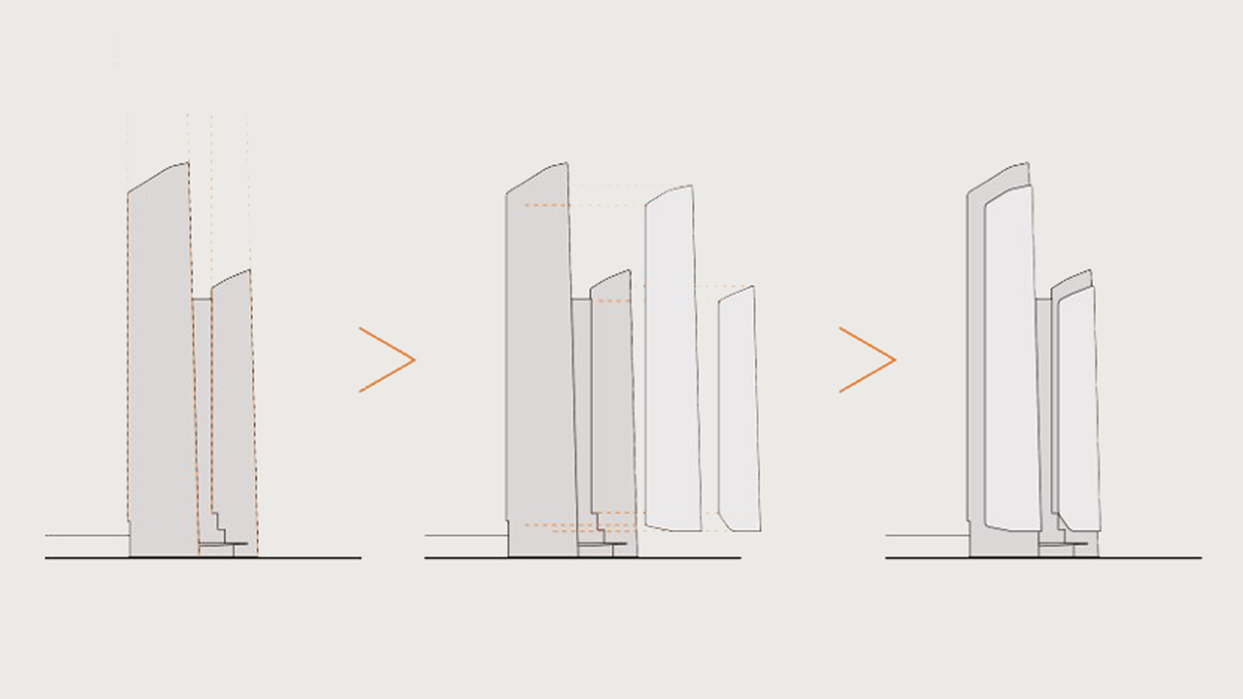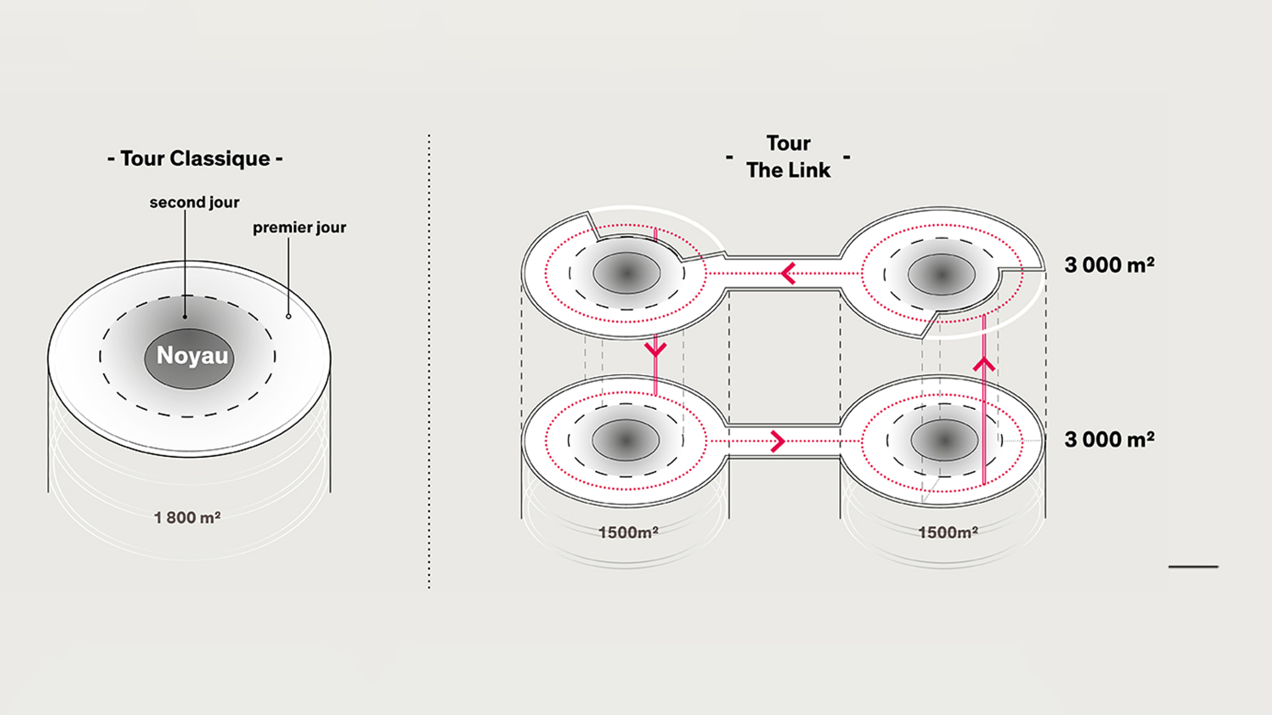 Pour véhiculer la lumière naturelle au plus loin dans les espaces intérieurs, la forme archétypale de la tour est remise en question. The Link, composée de deux noyaux reliés en huit, accroît ainsi les surfaces d’échanges avec l’extérieur et permet d’offrir de plus vastes paliers exposés au premier jour, là où généralement le centre aveugle de la tour est réservé aux ascenseurs.