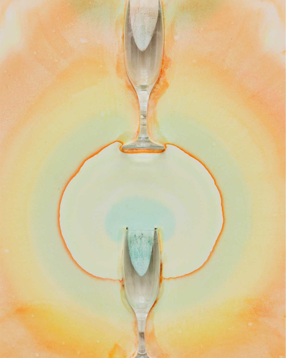 Quoi qu’il en soit, l’œuvre est vouée à évoluer. J’utilise des colorants alimentaires – semblables aux colorants utilisés en microscopie – pour colorer les amibes présentes dans l’eau. Plus on verse régulièrement des gouttes sur le support de plâtre qui sert d’exosquelette, plus l’auréole colorée révélant l’accumulation locale des amibes sera foncée. En revanche, si on ne fait rien, les colorants sensibles aux UV verront leurs couleurs se faner, rendant compte du passage du temps. Si l’on ne veut pas que la pièce dépérisse, il faudra donc l’alimenter de temps à autre, mais je n’impose pas un protocole de deux repas par jour.