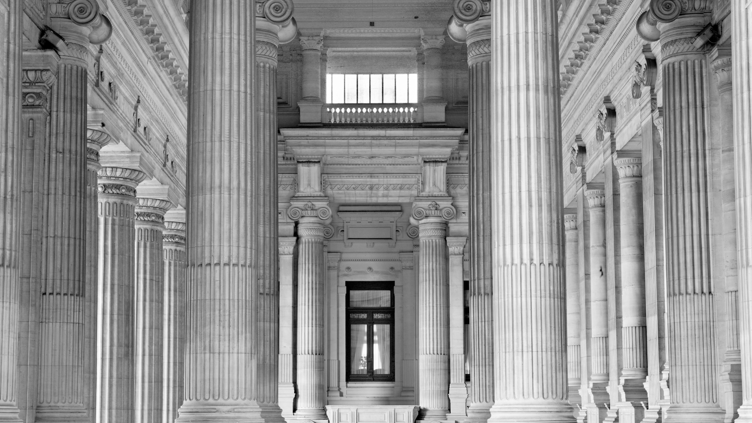 Selon une séquence architecturale qui semble immuable, le palais de justice déploie un emmarchement, donnant sur un péristyle à colonnes, surmonté d’un fronton triangulaire, d’une colonnade, et, depuis le perron d’une lourde porte, au cœur d’un mur massif souvent aveugle, ouvre sur une salle des pas perdus volumineuse et austère. La principale salle d’audience se situe dans son axe, ses lambris bois rappellent les enceintes végétales originelles, la lumière souvent zénithale lui confère une solennité empreinte de mystère… C’est une architecture parlante, qui se donne également en récit à travers un décorum de statues et peintures allégoriques.