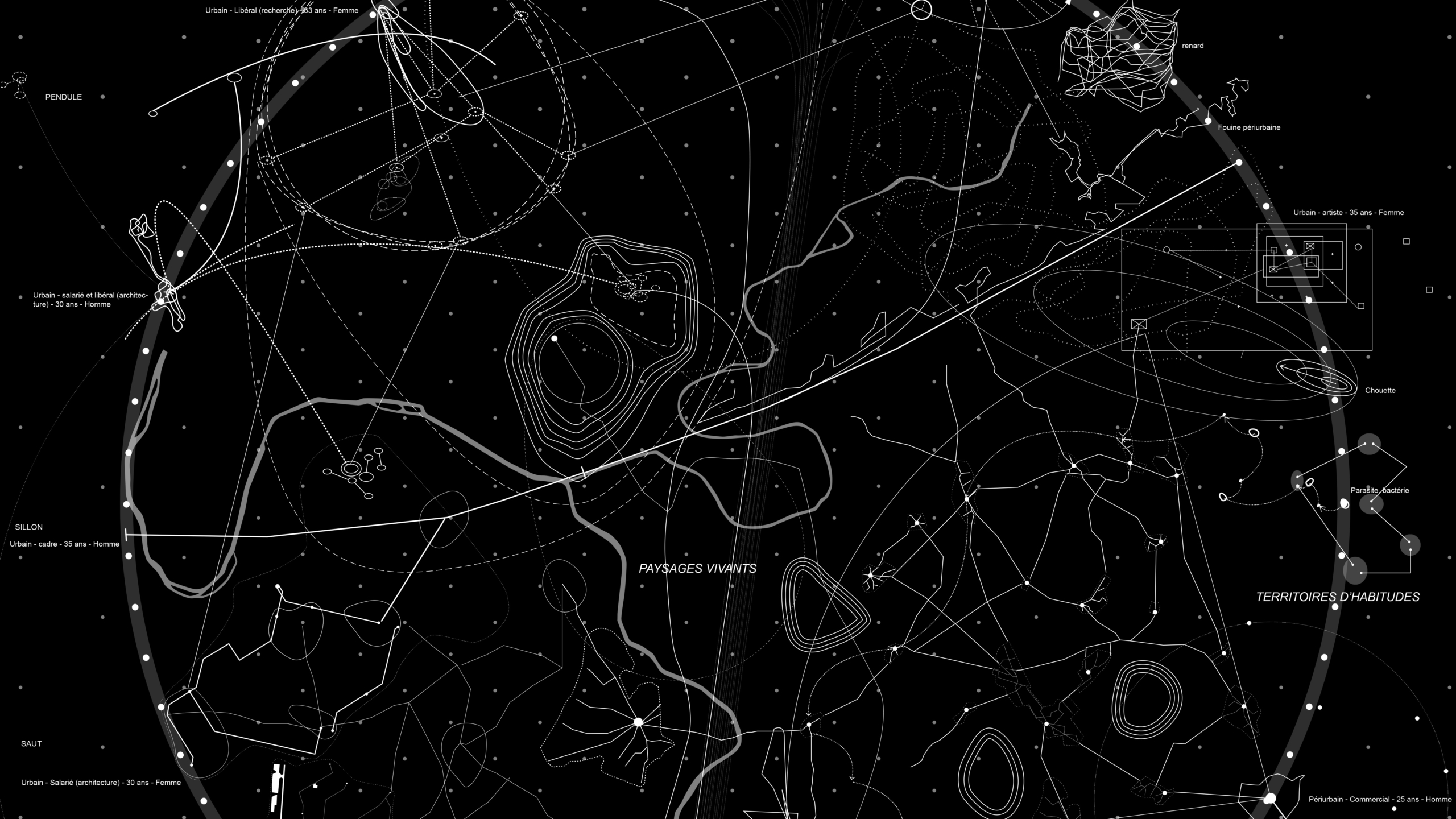 La collaboration avec des architectes a été fondamentale dans la réalisation d’un tel projet. Là où je proposais des modèles empruntés à l’histoire, Alexandra et Axelle me proposaient des outils de représentation empruntés à l’architecture ou au paysage. L’atlas a ainsi été conçu par un processus de va-et-vient constant entre chaque ligne écrite et chaque ligne dessinée. D’autres outils ont également été empruntés aux sciences dites « dures », puisque rien de ce qui est tracé n’est subjectif ou inventé, ce qui distingue ces cartographies des cartes dites « sensibles ». Toutes les informations représentées ont été mesurées et quantifiées scientifiquement. Des modèles épidémiologiques ont révélé le parcours d’un virus, celui du chat sauvage a été établi grâce à des capteurs lors d’une recherche d’Alexandra, et le trajet quotidien d’une infirmière a été extrait d’une enquête sociologique, par exemple. Notre originalité était donc de croiser ces données de domaines éloignés en se libérant des échelles pour proposer d’autres façons de donner à voir des données.