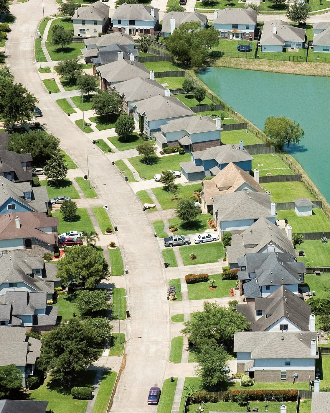 Le neveu de Tom DeLay (l’ancien exterminateur malveillant et déshonoré, devenu politicien et créateur du redécoupage électoralLe redécoupage entraîne une redéfinition des circonscriptions électorales et profite à un parti politique précis ; ici, les Républicains.) bénéficie du soutien de la riche élite de la ville qui s’organise rapidement pour “redécouper” la ville entière en détruisant les quartiers anciennement occupés par les pauvres et instaure une « restriction générale sur tous les titres de propriété »Les restrictions sur les titres de propriété ont à Houston remplacé le zonage pour permettre aux catégories les plus aisées de garder leurs valeurs foncières en imposant des restrictions sur l’acte ou titre de propriété, tels une surface de lot minimum ou l’occupation limitée à une maison individuelle., en rachetant tous les terrains abandonnés et créant simultanément un archipel de communautés ghettoisées. Le système du Conseil municipal et du Maire est immédiatement abandonné et remplacé par des Superviseurs de comté, sous l’égide d’un Juge de comté uniquement motivé par l’accessibilité au Nouveau Marché. Il en résulte un paysage suburbain séquestré, avec des communautés voulues et dont les membres vont des investisseurs en fonds aux fanatiques de golf. Une figure à la Robert Moses orchestre tous les aménagements permettant à la machine de la propriété foncière (intérêts de l’immobilier) de faire fonctionner ses « projets ». Le Texas, désormais constitué d’un nouveau parti appelé tout simplement le Nouveau Suburbain, crée une gigantesque super banlieue qui refuse de payer la taxe fédérale. À son avantage, le Texas est abandonné par le pays et devient un État d’esprit.