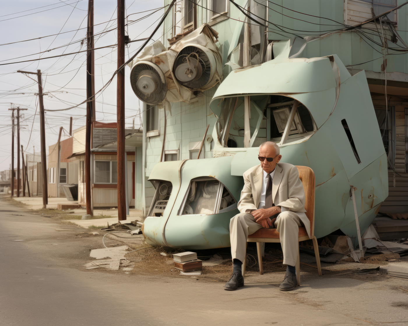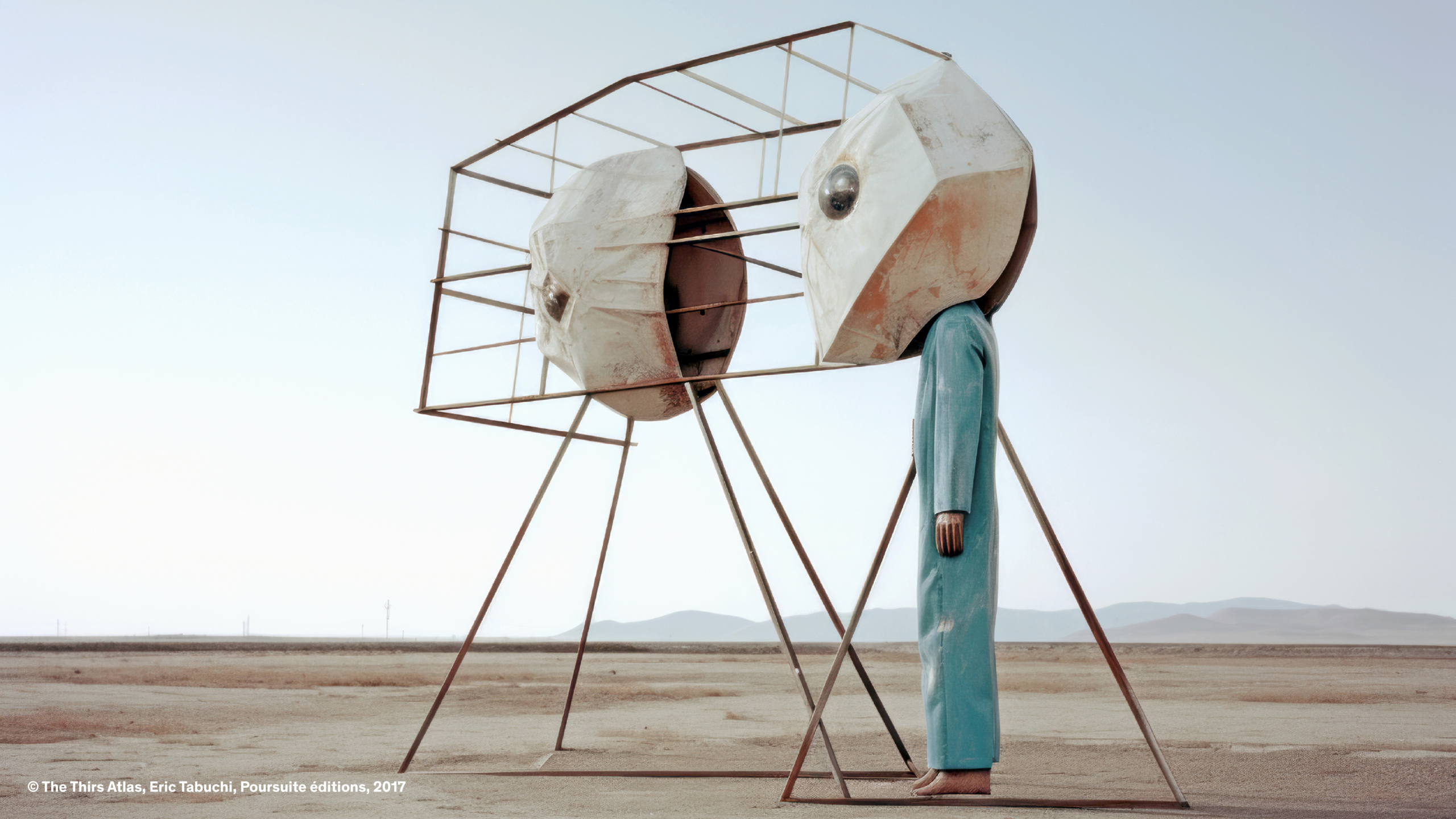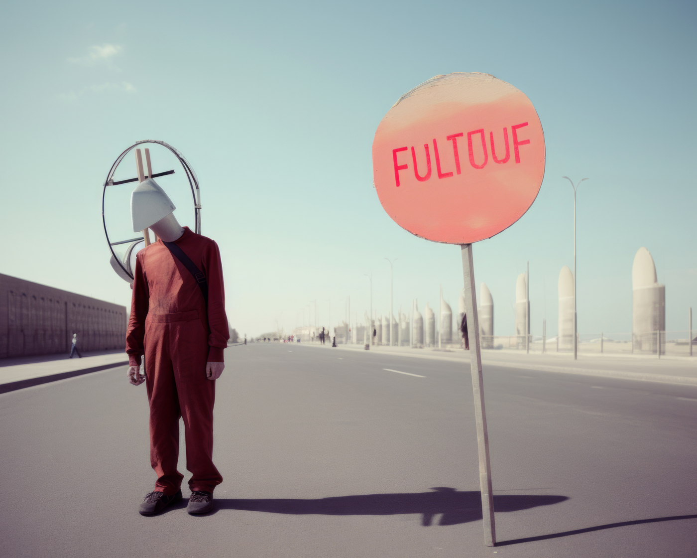 C’est le cas d’Éric Tabuchi, photographe explorant depuis vingt ans les formes architecturales. Dans The Third Atlas, il expérimente Midjourney pour produire des formes inédites, tapant parfois des lettres aléatoires ou des acronymes impossibles à matérialiser. Les résultats, imprévisibles, échappent à toute logique rationnelle : un prompt présentant les lettres « LIE » fait apparaître des personnages masqués comme traductions de l’idée de mensonge ; des panneaux couverts de signes abstraits émergent là où un message chargé de sens était attendu, révélant les limites d’un outil incapable d’écrire. Il transforme ainsi l’IA en instrument créatif autonome, libérant le photographe de la tutelle du réel pour le transformer en romancier d’espaces ; en curateur de formes et de situations.