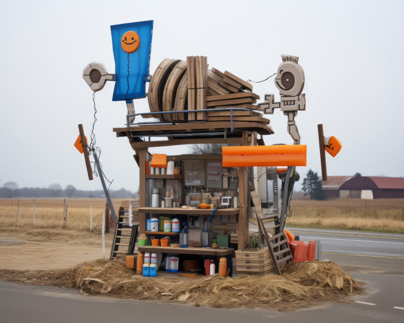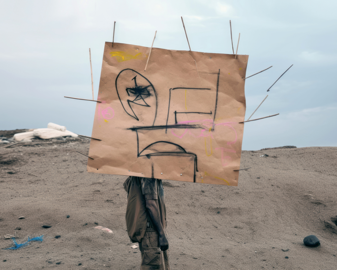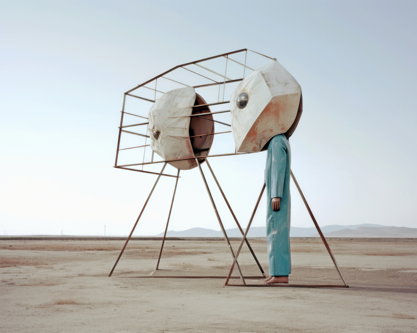 C’est le cas d’Éric Tabuchi, photographe explorant depuis vingt ans les formes architecturales. Dans The Third Atlas, il expérimente Midjourney pour produire des formes inédites, tapant parfois des lettres aléatoires ou des acronymes impossibles à matérialiser. Les résultats, imprévisibles, échappent à toute logique rationnelle : un prompt présentant les lettres « LIE » fait apparaître des personnages masqués comme traductions de l’idée de mensonge ; des panneaux couverts de signes abstraits émergent là où un message chargé de sens était attendu, révélant les limites d’un outil incapable d’écrire. Il transforme ainsi l’IA en instrument créatif autonome, libérant le photographe de la tutelle du réel pour le transformer en romancier d’espaces ; en curateur de formes et de situations.