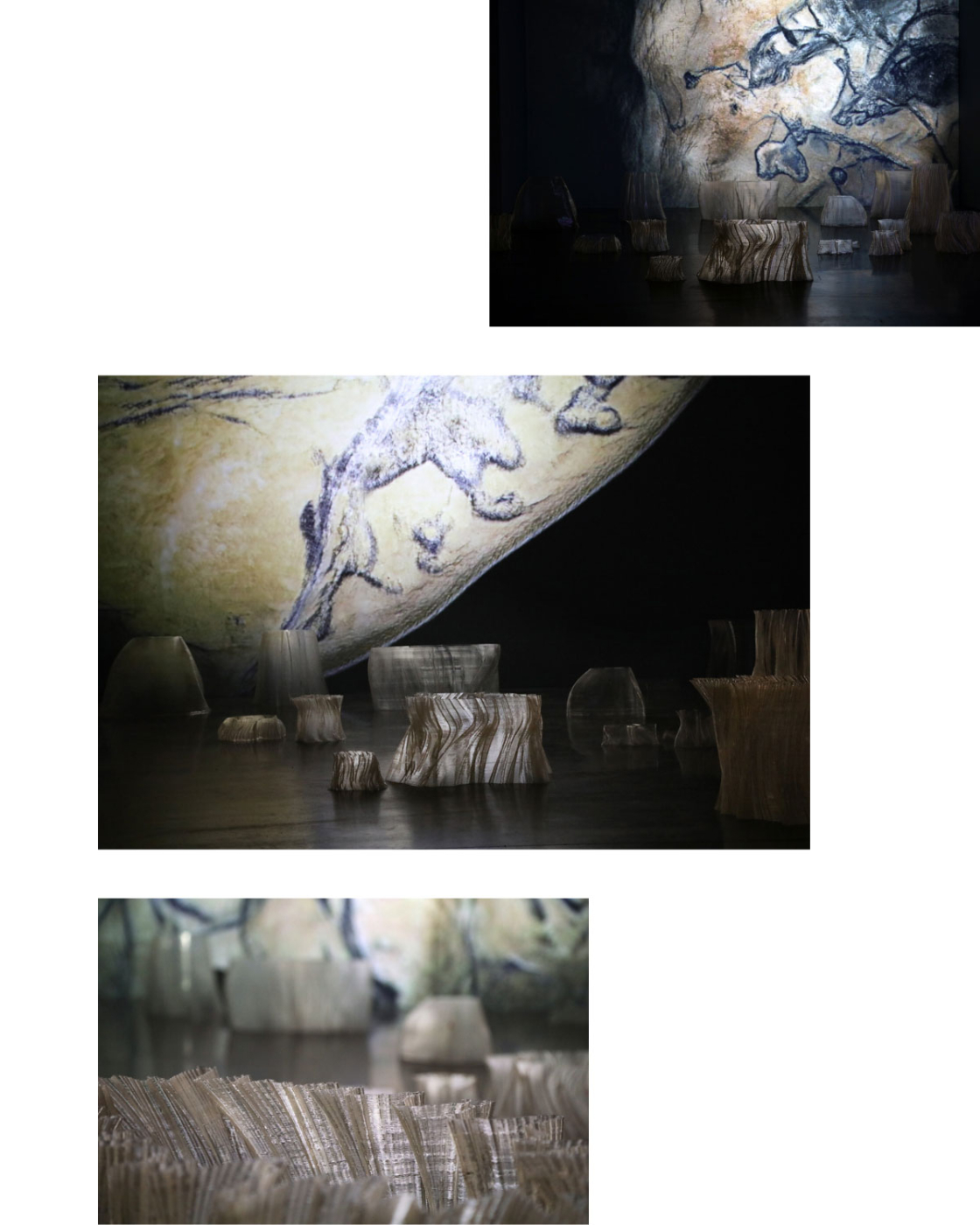 Ces traces : griffures, empreintes, pigments soufflés, combinées aux données neuronales constituent une base que la machine utilise afin de créer de nouvelles formes, offrant ainsi une atmosphère et une expérience plutôt qu’une simple image reproduite.