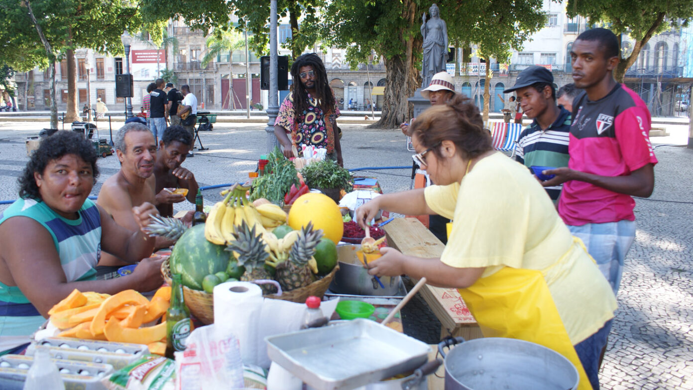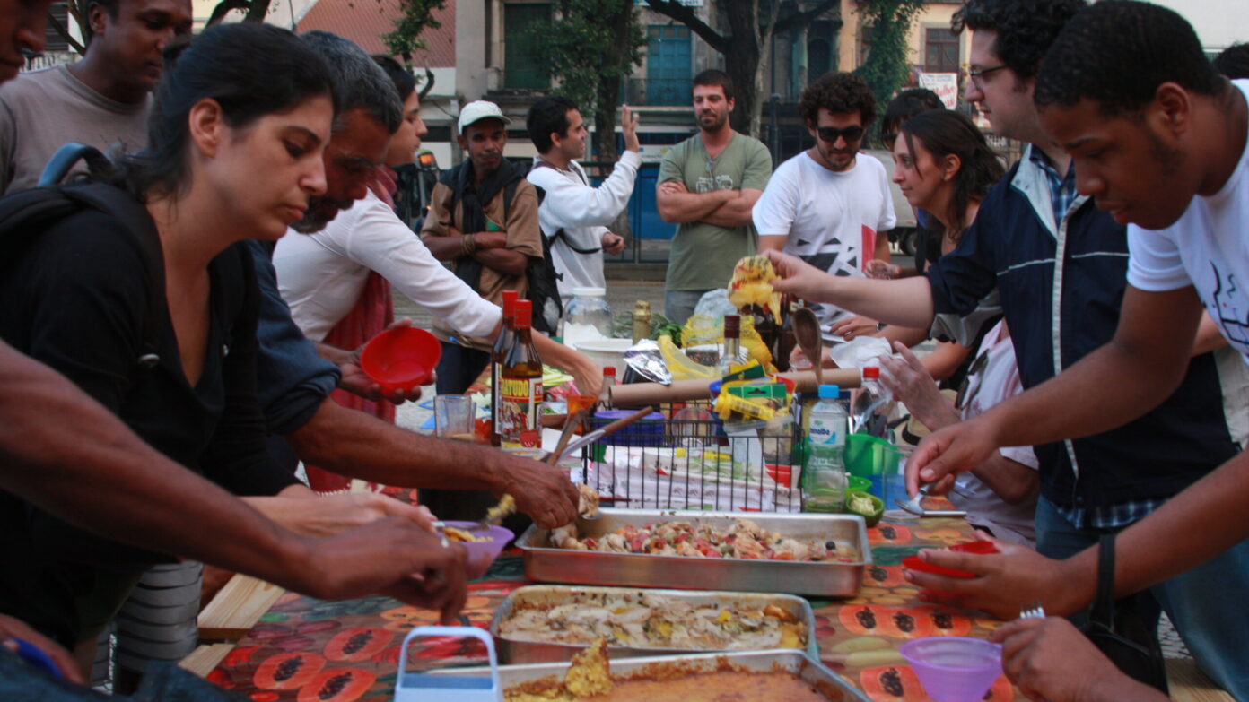 Opavivará : Oui, il y a cette confusion qui est dans l’identité même de Rio, mais on travaille aussi dans des espaces privés, institutionnels, qui ont leurs règles propres, que l’on met aussi en tension. On joue constamment sur ce qui peut arriver ou pas dans un endroit. Le musée d’Art moderne de São Paulo nous avait par exemple invités pour une rencontre mêlant art et gastronomie ; ils s’attendaient à voir des chefs, alors qu’on voulait faire une cuisine ouverte au public, ce qui les inquiétait beaucoup, pour des raisons sanitaires entre autres. Nous avons dû négocier pied à pied, parce que leur vision institutionnelle allait à l’encontre de notre conception d’une œuvre d’art en interaction avec le public.