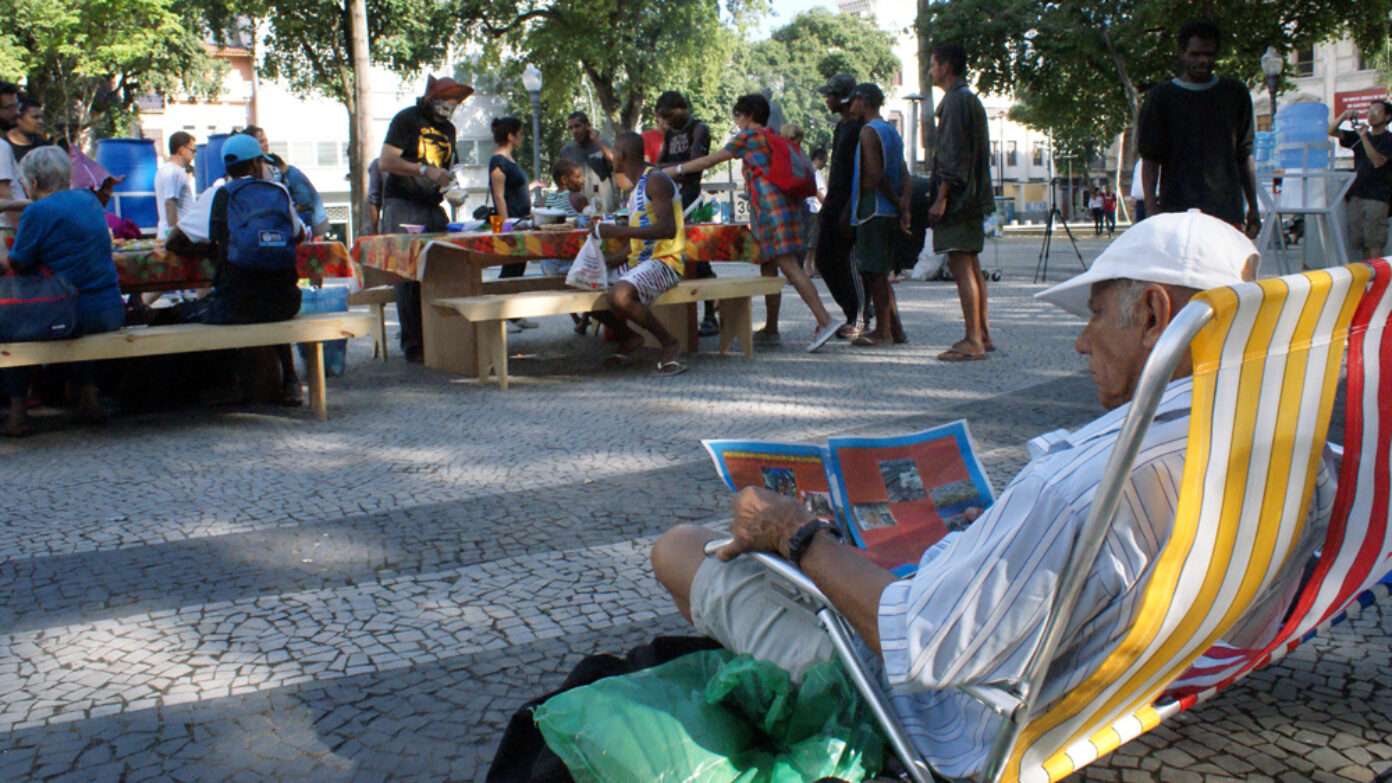 Il y a différentes strates dans l’œuvre : on choisit un espace public de la ville et on y insère un dispositif, assez minimal ou très complexe, mais qui ne se substitue pas aux gens qui circulent dans ce lieu. Parfois même le dispositif est camouflé dans le tissu de la ville et ne prend vie qu’au contact des gens. Le public fait partie intégrante de l’œuvre. Par exemple Cozinha Coletiva était décrite ainsi : « Table, gazinière, chaises, assiettes, nourriture et personnes. » Les individus sont le mortier de l’architecture de nos œuvres. D’une certaine façon, cela s’oppose à la pensée moderne, à une vision de l’urbanisme très concrète, où la ville est un empilement d’éléments architecturaux, de béton, etc. Notre architecture repose sur le ciment vivant.