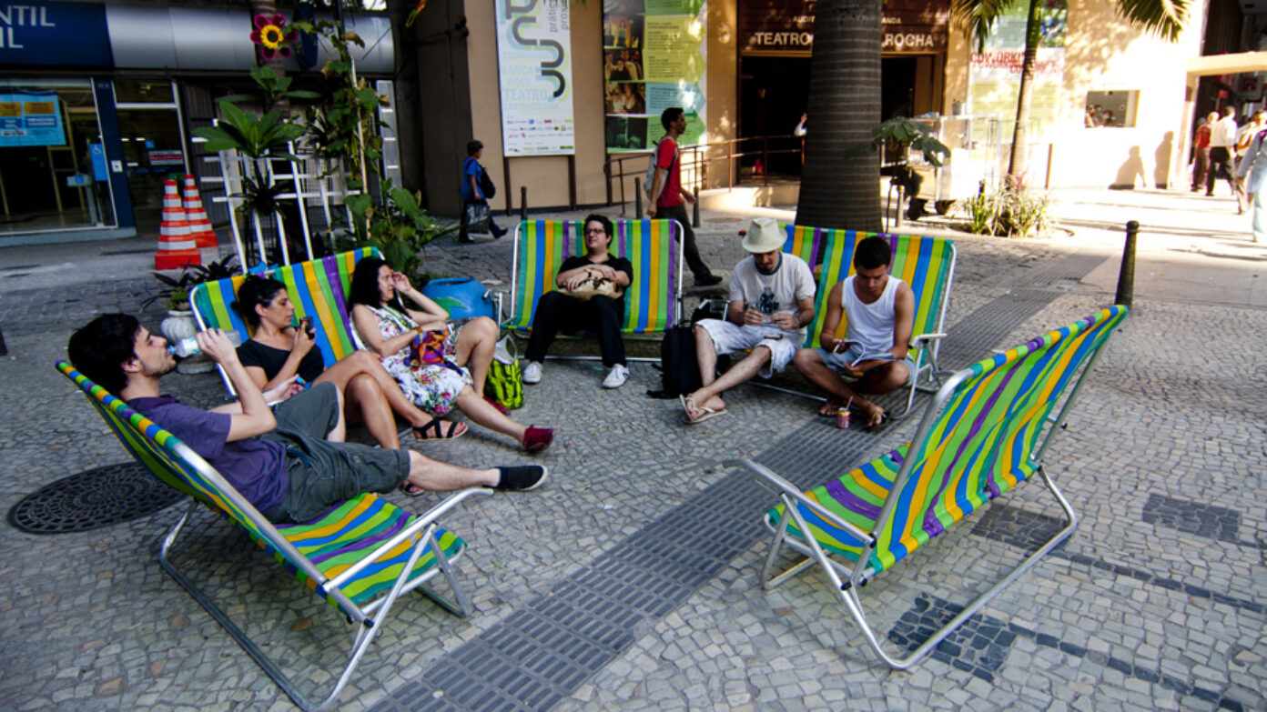 Opavivará : Plus que de lieux, il s’agit de « situ-actions » Situ-ação dans le texte original. le lieu se donne par une action dans l’espace. On crée une enveloppe qui reçoit une action, un espace pensé pour les relations d’intimité qui s’y établissent, une membrane entre l’espace public et l’espace intime. C’est une expérience sociale. Les relations entre les choses et les gens fondent donc davantage le lieu que son architecture ou sa végétation. Dans nos interventions, l’espace reste ouvert au possible, à ce qui peut arriver ou non. Pour qu’il soit réellement public, l’espace doit garder cette ouverture.