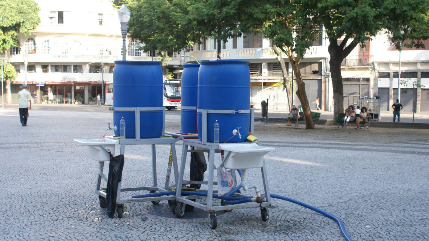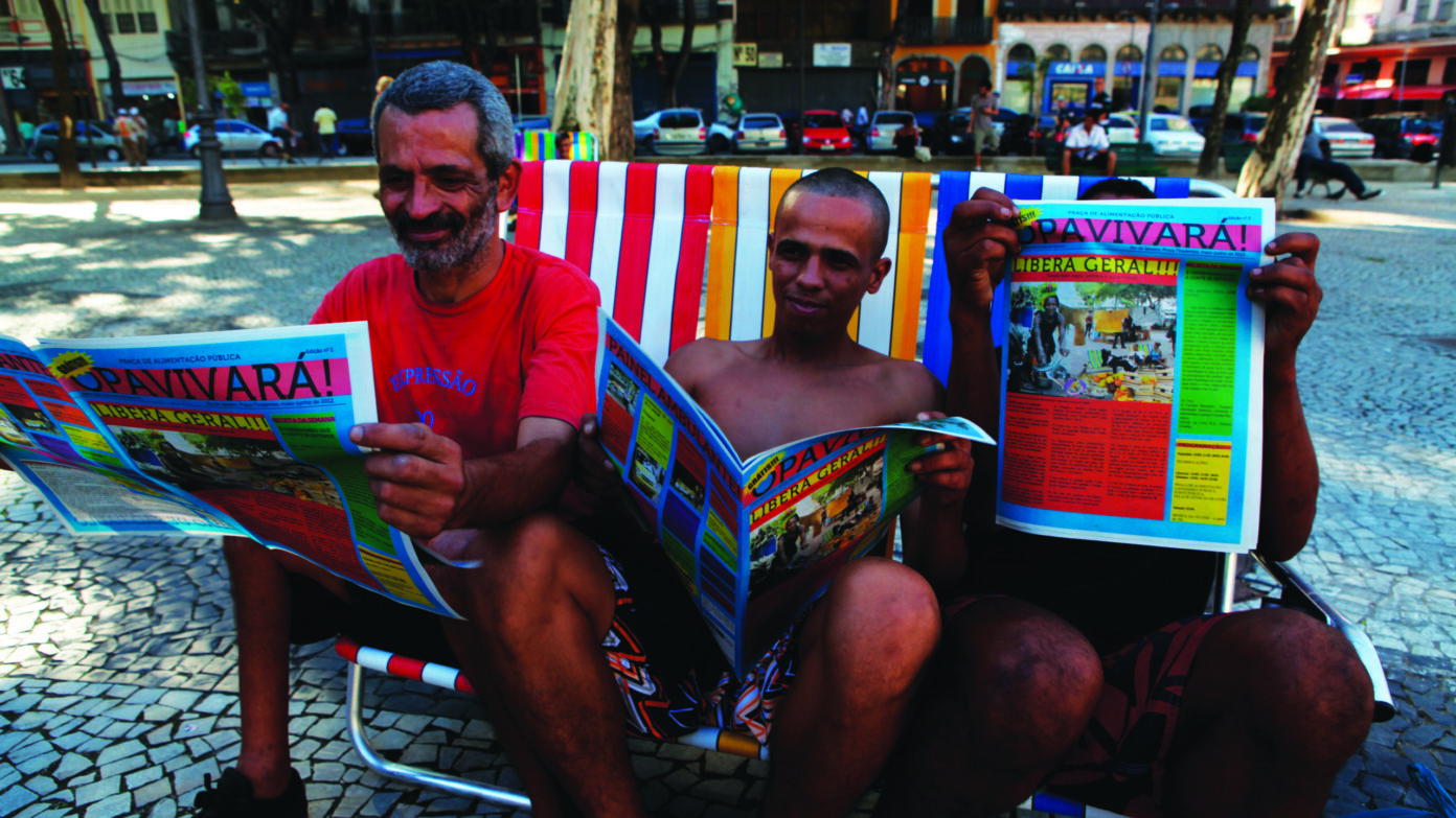 Opavivará : On réfléchit beaucoup à cette dimension. Par exemple pour l’installation de la cuisine de la place Tiradentes, l’œuvre s’appelait Opavivará Ao Vivo, mais la cuisine elle-même Praça de Alimentação Pública, en référence directe au moyen d’alimentation du centre commercial, une appellation ironique pour un espace où les personnes vont se rencontrer et échanger. Mais il y a beaucoup de choses dans nos actions qui relèvent de la coïncidence, par exemple le travail sur le camelô. La base fondamentale de notre travail, c’est de communiquer avec la population, parce qu’on intervient dans l’espace public et qu’on veut toucher une audience aussi large et variée que possible. On cherche un langage du camouflage pour se mêler au langage de la ville. Cela n’aurait aucun sens d’arriver avec un projet construit et achevé dans ce lieu qui est une folie, un mélange de langages. Opavivará ressemble à un théâtre de revue : on s’approprie les grands sujets du moment, ou des choses qu’on attrape en l’air, et qui d’un coup passent à la Une.