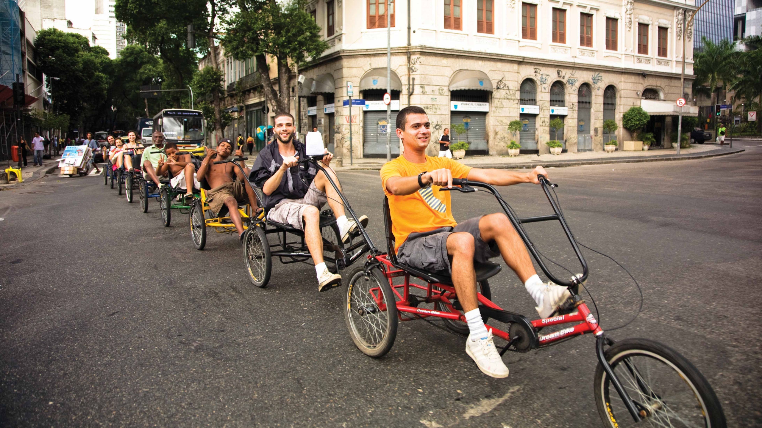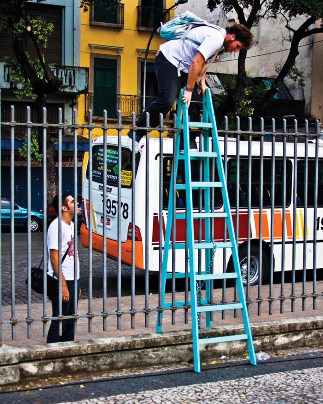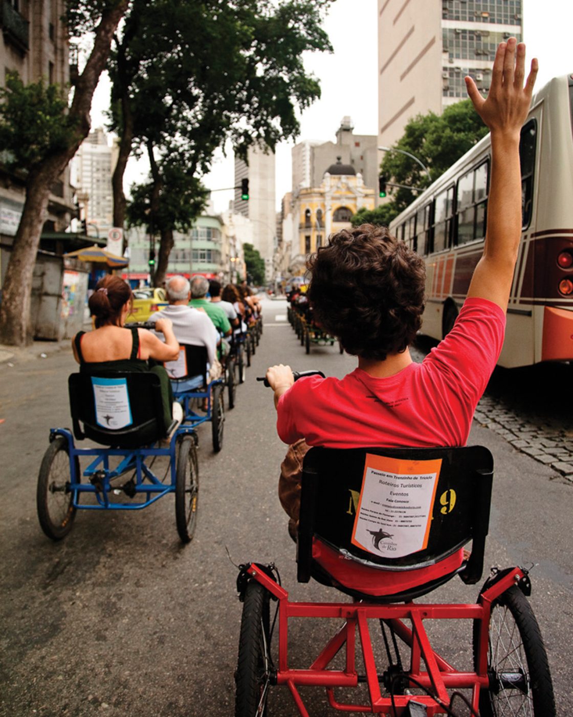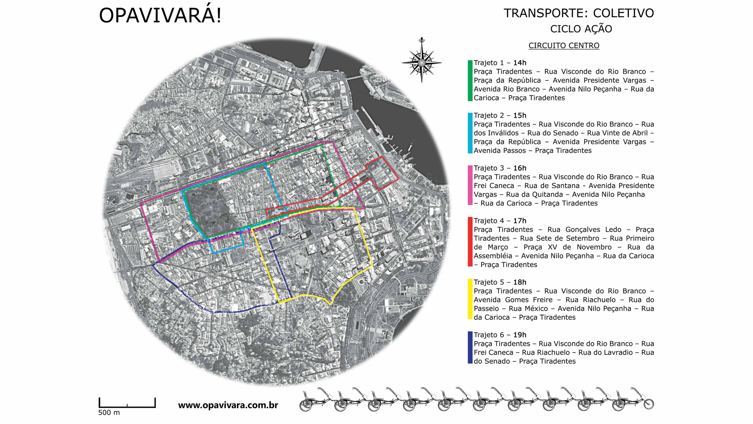 Opavivará : C’est une œuvre qui a été conçue comme une proposition de transport public et qui doit vraiment être expérimentée pour être comprise. Ainsi, vous percevez la ville de façon différente, vous n’avez plus de vitre de protection et davantage de temps. Ce travail met en tension l’idée même de la mobilité et de l’espace public, parce qu’en plus c’est un transport ouvert et gratuit, qui va dans des endroits où le bus n’a pas accès. On a beaucoup réfléchi sur la ville pour créer un parcours qui permette de la voir d’un œil neuf, particulièrement le centre-ville, avec l’idée de la considérer comme un tout. On a créé plusieurs boucles, au départ de la place Tiradentes. On voulait aussi voir comment les gens s’organiseraient avec un chauffeur devant et différents conducteurs intermédiaires. Il y a un aspect de cette œuvre que les gens n’ont pas compris, car ils étaient persuadés que nous avions construit ces tricycles, mais en fait ils existaient déjà, on peut les emprunter le week-end sur l’Aterro do Flamengo Aterro do Flamengo est une aire de loisir entre la ville et la mer dans la partie sud de la ville (Zona Sul) entre le centre-ville et le quartier du Botafogo.pour faire des tours et s’amuser. C’est donc un travail éphémère aussi au sens où c’est un ready-made, le déplacement d’une structure existante, à dimension purement ludique, dans un autre contexte, où cela devient un instrument d’observation de la ville. Cela crée aussi un choc avec la ville, on entre en guerre avec les autobus, mais avec des armes un peu bizarres… Au final on s’empare d’un instrument de loisir, on l’amène dans un contexte urbain de façon assez ludique et quand on met ça au milieu de la rue, les conducteurs de bus descendent pédaler avec nous.