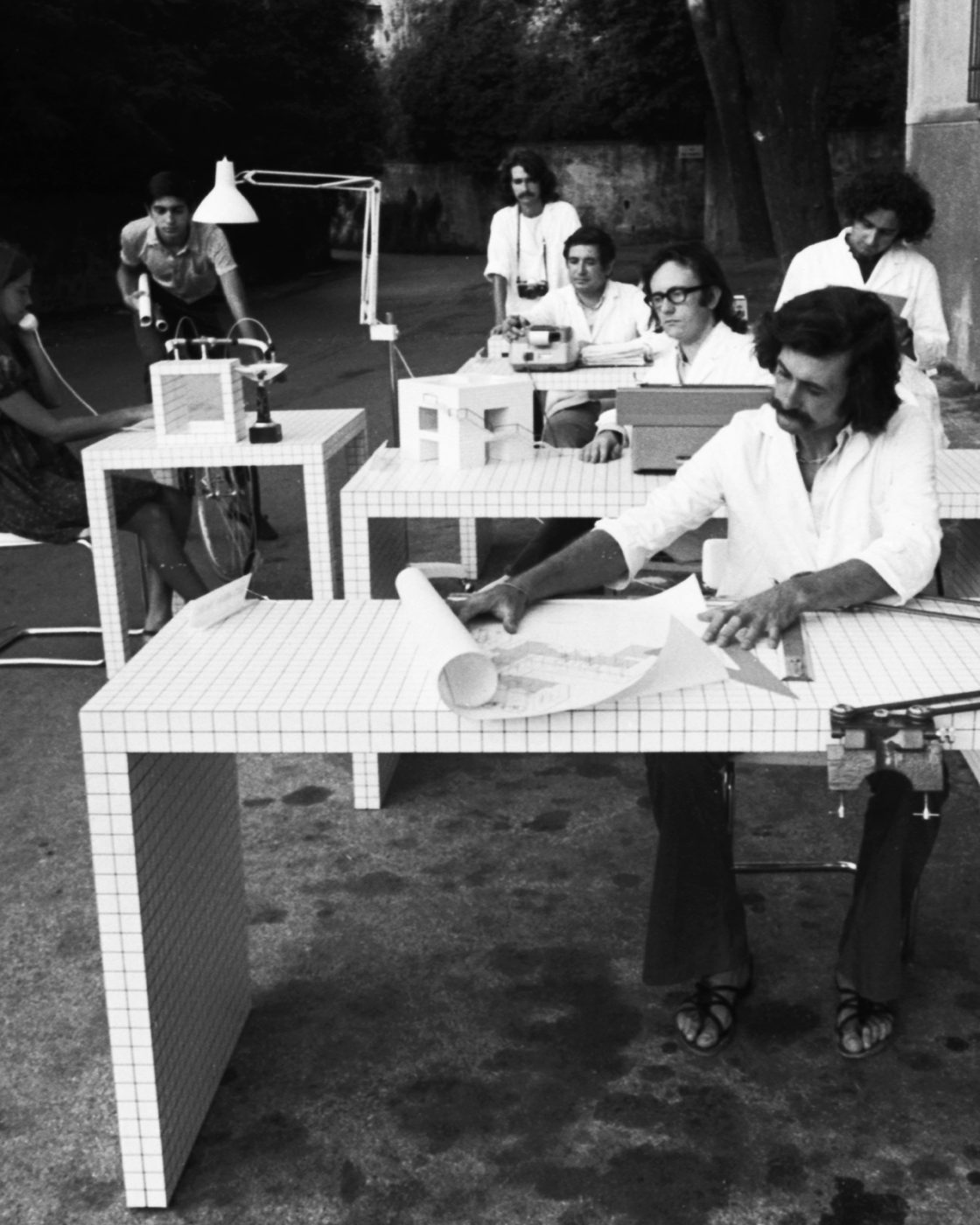 Les architectes du groupe Superstudio (1966-1978) conçoivent en 1969 le Monument continu, « modèle architectural d’urbanisation totale » dans lequel une grille ininterrompue parcourt la terre. La grille recouvre tout – territoire, architecture, ville. Superstudio pousse jusqu’à une extrémité absurde la notion d’architecture comme projection. À la tridimension-nalité de l’architecture se substitue la notion de « supersurfaceSuperstudio, “Supersuperficie”, in Casabella, XXXVI, n. 366, Milan, Juin 1972. ». Cette « réduction de l’objet architectonique » témoigne d’une volonté déclarée de « destruction de l’objet » au profit de la vie, du comportement créatif. Les modèles projectuels font place au « modèle d’une attitude mentaleSuperstudio, Storie con figure 1966-1973, sous la dir. d’Adolfo Natalini, Galleria Vera Biondi, Florence, 1979, p. 46.». Pour Superstudio, l’architecture radicale n’équivaut pas à la production de formes nouvelles mais se doit d’être une modalité d’ « existence intégrale, un moyen superlatif de connaissance et d’appropriation de la réalité ». Dans ce contexte, le projet revêt de multiples apparences : installation, mobilier, écrit, dessin, expérimentation directe et comportement sont envisagés comme des « instruments pour la ré-appropriation de l’environnement et de soi-mêmeAdolfo Natalini, Superstudio-The Middelburg Lectures, Design Museum, Middelburg, Valentijn Byvanck (ed), 2005, p. 41.».
