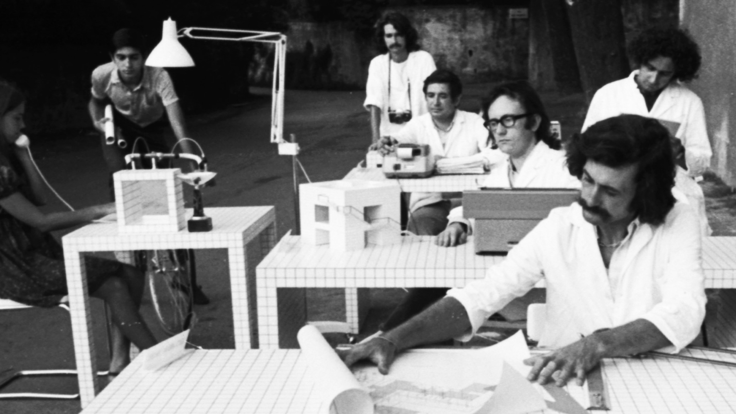 Se référant au ratio-nalisme des représentations urbaines de Hilbersheimer ainsi qu’aux typologies d’Otto Neurath, les Histogrammes, éléments géométriques tridimensionnels traversés par une grille, mettent en place une sorte de « degré zéro » de l’architecture. Ce « diagramme mental », susceptible de s’étendre à l’infini, acte lui aussi la disparition d’échelle entre architecture, mobilier et urbanisme. Les Histogrammes en tant que « design territorial » se déclinent sur tous types de supports. Transformé en espace isotrope, un bureau peut servir de table (pour se nourrir) ou de lit (pour dormir). Les Histogrammes de Superstudio n’ont ainsi pas d’existence en soi. Seul importe l’usage que l’on en fait. Sur une photo célèbre, les membres de Superstudio travaillent non pas dans leur agence, ni dans un immeuble, mais à l’extérieur, au milieu d’un jardin. Leur mobilier de bureau est une variante des Histogrammes, parcouru par la même trame, unifiant l’espace de travail et de vie au sein d’ un seul objet générique et indifférencié, à même d’assurer une multitude d’usages. « Le design, devenu parfait et rationnel, procède en englobant de manière syncrétique des réalités différentes (…) La projetation coïncide ainsi toujours plus avec l’existenceIbid.». Dans cette absorption d’objets neutres, le travail est à nouveau devenu une activité d’ordre fantomatique, irreprésentable et diffuse.