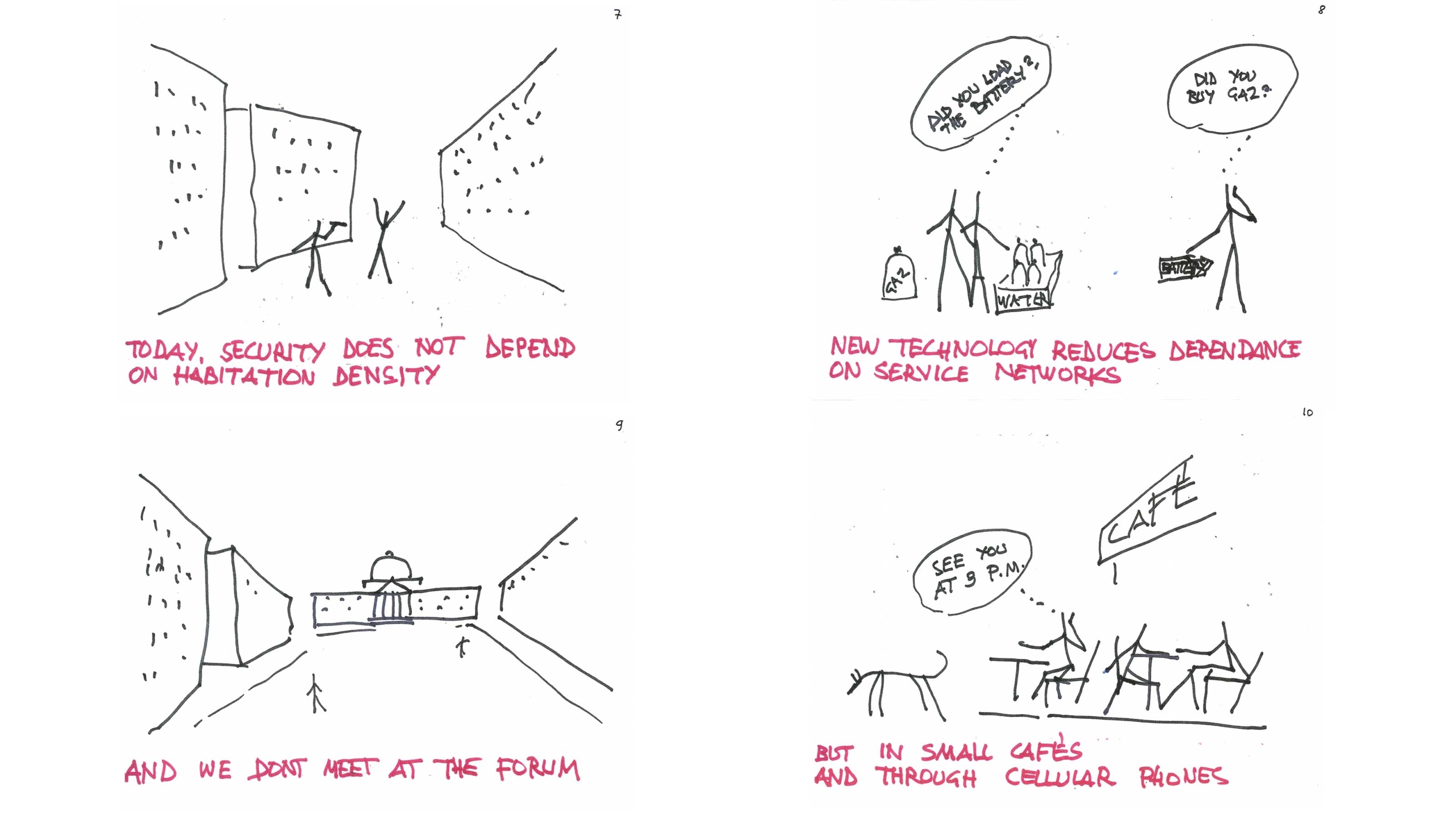 Notre magnifique technologie nous libère de certains réseaux, de l’électricité, de la proximité, mais le captage de l’eau et la culture du sol restent fondamentaux. N’oublions pas que Rome est tombée parce que les barbares avaient coupé l’accès à l’eau. Aujourd’hui encore, le captage est centralisé et donc source de vulnérabilité. La véritable autonomie, c’est le puits et le lopin de terre, aussi petit soit-il. Je ne joue pas les sociologues ou les prophètes, je serais bien incapable de prédire la manière dont notre spatialité va évoluer, mais je reste persuadé qu’elle doit être inventée par la population. Aux USA, la méfiance vis-à-vis de la qualité des produits alimentaires pousse les gens à cultiver de petits jardins minuscules. La production de nourriture est intégrable au système de la ville, le logement individuel peut être conçu avec des espaces dédiés. Les révolutions, des fois, ça commence par les riches. Une mentalité ça se construit, lentement et difficilement. Ce n’est pas un décret présidentiel qui résoudra le problème, l’idée est d’ouvrir le champ et de laisser inventer. Il ne s’agit pas de métabolisme ou d’organismes, mais bien d’une question de régulation. Comment les cellules se dirigent elles-mêmes.