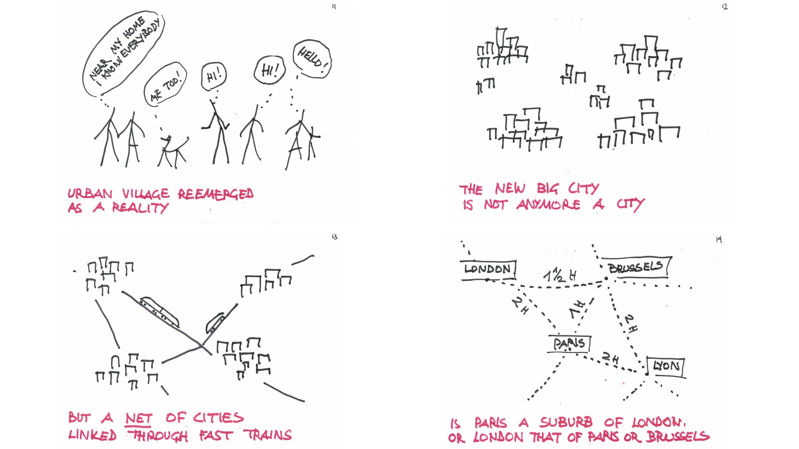 On parle tout le temps de Grand Paris, ce qui est une des plus grandes erreurs de l’après-guerre. Se rendre à Pantin aux heures de pointe prend sûrement plus de temps que d’aller à Bruxelles. L’Europe doit être considérée comme une ville dont le métro serait le TGV. Politiquement, il ne manque plus que la carte orange européenne ! La proximité urbaine a changé et nous assistons à l’émergence du continent urbain. Au Japon, il existe depuis longtemps des TGV avec des fréquences proches de celles d’un métro. Si je décide que la proximité correspond à 3h de trajet, alors Londres, Paris, Bruxelles, Amsterdam, Milan, Marseille, Lyon ou Bordeaux… forment une seule et même ville. C’est un scénario que j’avais envisagé il y a 50-60 ans et qui devient aujourd’hui réalité grâce au TGV, aux batteries et aux téléphones portables.