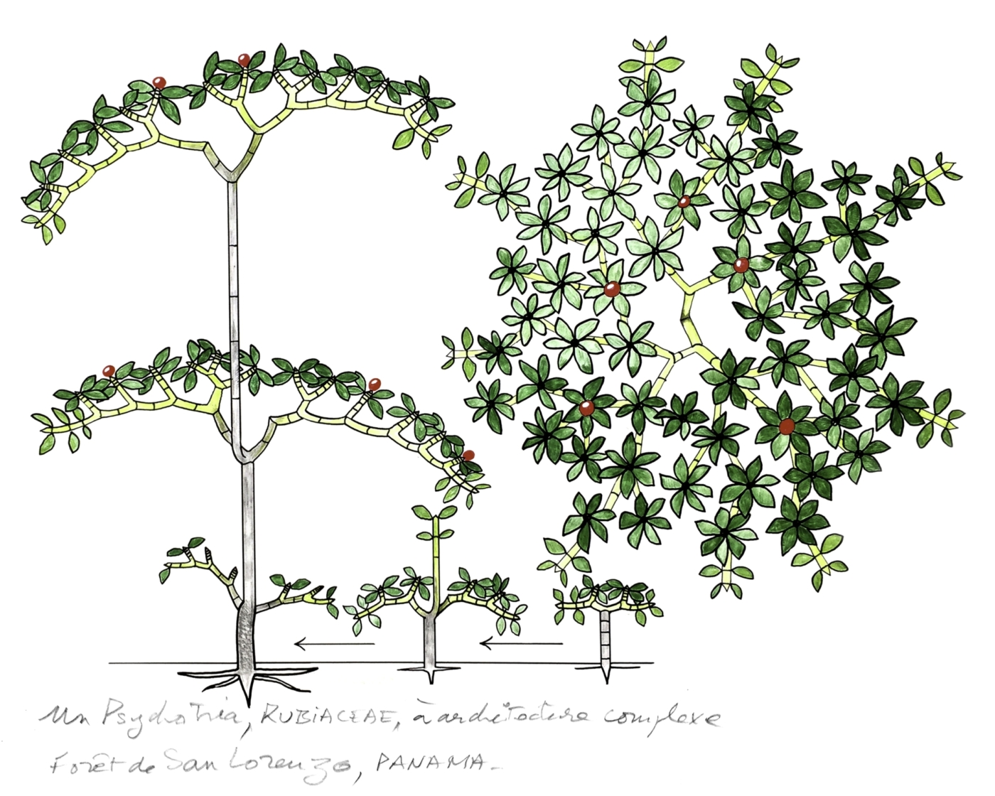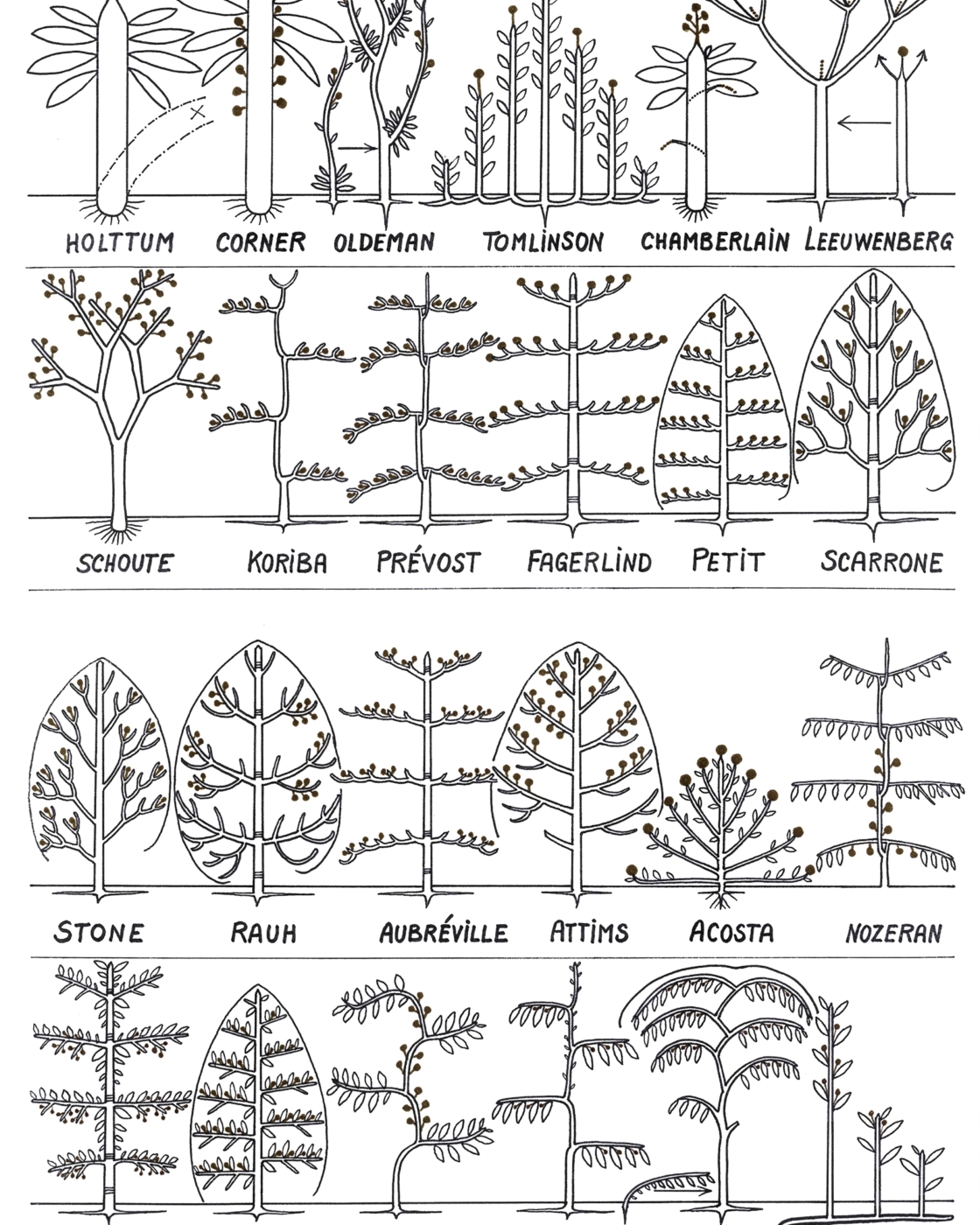 Pour identifier une plante dans un pays tempéré comme la France, on se réfère à la forme de ses fleurs ou de ses fruits, idéalement les deux. Mais après mes études, je me suis rendu en Afrique équatoriale, où j’ai été confronté aux limites de cette méthode, puisqu’il m’était impossible d’observer les fruits ou les fleurs des grands arbres. Il y avait bien quelques débris au sol, mais l’ensemble se trouvait à plus de soixante mètres de hauteur, limitant l’identification classique. J’ai alors remarqué que dans le sous-bois se trouvaient de plus jeunes arbres aux formes très caractéristiques. J’ai donc pris le parti de les utiliser pour étudier et identifier les plus grands arbres. C’est en me référant à leurs structures, plus facilement observables du haut de leurs deux mètres, qu’est née l’architecture végétale. Je me suis assis au pied des arbres pour observer leurs architectures et j’ai commencé à les dessiner, ce qui m’a permis d’identifier des modèles. Tout cela est exclusivement graphique, dessiner reste le mieux pour l’expliquer. Il y a tout d’abord l’orientation verticale et horizontale des branches. Ça a l’air idiot, mais cela fait déjà beaucoup. Ensuite, il y a la croissance, continue ou rythmique. Dans un pays comme la France, la croissance est forcément rythmique, puisqu’elle s’arrête chaque hiver, alors qu’elle est continue sous les tropiques. Ajoutez à cela la position des fleurs : si elles sont terminales, c’est-à-dire au bout de l’axe, celui-ci ne peut plus pousser, la croissance n’est alors permise que par la formation de relais. Si les fleurs poussent latéralement, alors l’axe peut continuer à pousser. Il suffit d’un quart d’heure en forêt pour observer tout cela, ce qui paraît très simple, mais c’est la base d’une combinatoire aux résultats très nombreux. Bien évidemment, on ne voit que ce que l’on cherche, sinon on voit d’autres choses, ou rien. On critique parfois mon travail en disant que ces recherches auraient pu être réalisées au xviie siècle. C’est parfaitement exact, un bon dessinateur aurait pu faire les mêmes observations à l’époque. Certains les ont faites d’ailleurs, mais de façon marginale. Il s’agit d’un travail simple, mais il se trouve que je suis le premier à l’avoir fait.