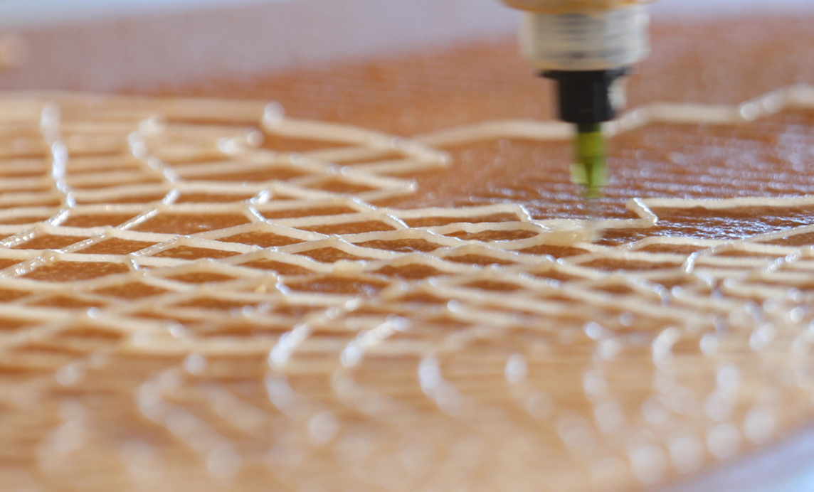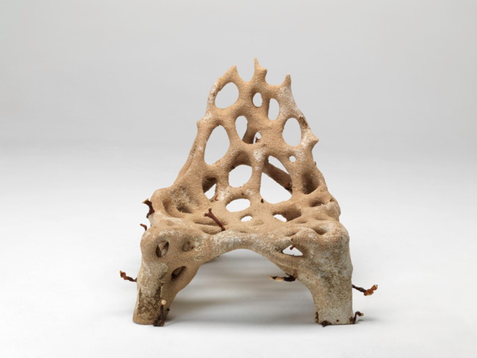 Un exemple d’innovation qui croise les technologies numériques et l’intelligence du vivant est la Mycelium Chair (2018) de Klarenbeek & Dros, studio néerlandais de design. Cette œuvre, présente dans les collections du Centre Pompidou, est issue d’une nouvelle technologie d’impression 3D de mycélium vivant développée depuis 2011 par ces designers dans une recherche d’alternative industrielle aux plastiques et aux bioplastiques. Klarenbeek & Dros s’intéressent également aux algues comme nouveaux matériaux novateurs. Les matériaux traditionnels de production sont ici remplacés par une matière vivante. Cette chaise est faite à partir d’une structure imprimée en 3D, dans laquelle se développe le mycélium (le reishi, un champignon particulièrement résistant), imprimé numériquement dans un mélange d’eau, de paille en poudre et de sciure. Le mycélium fait ici office de « colle vivante ». Une fois imprimée, cette chaise « vivante », avec ses champignons, continue de croître quelques jours en laboratoire. Une fine couche de bioplastique vient ensuite la recouvrir afin de stopper le processus de croissance. La chaise peut être compostée et ce procédé pourrait trouver de nombreuses autres applications dans les produits de la vie quotidienne.