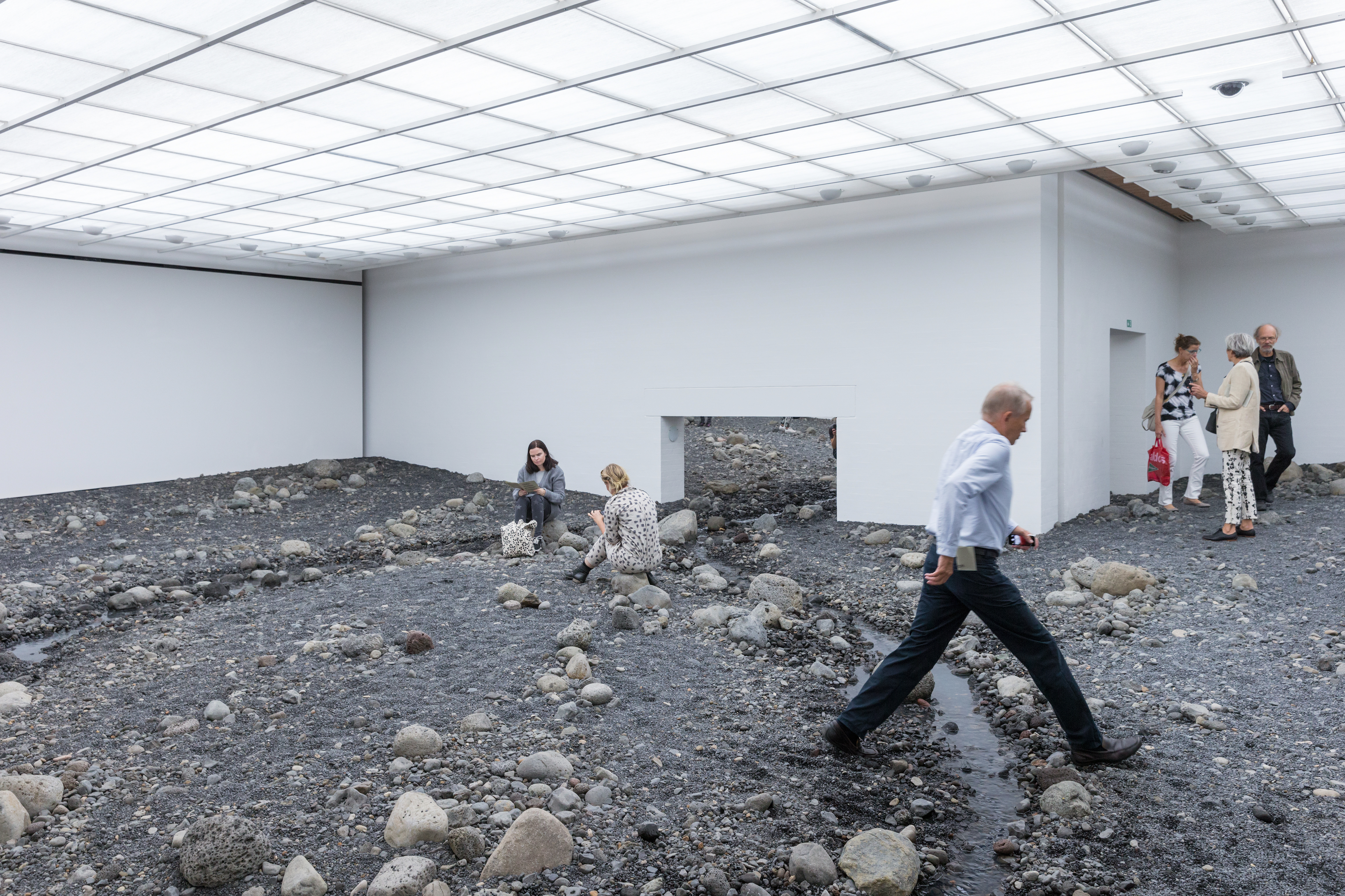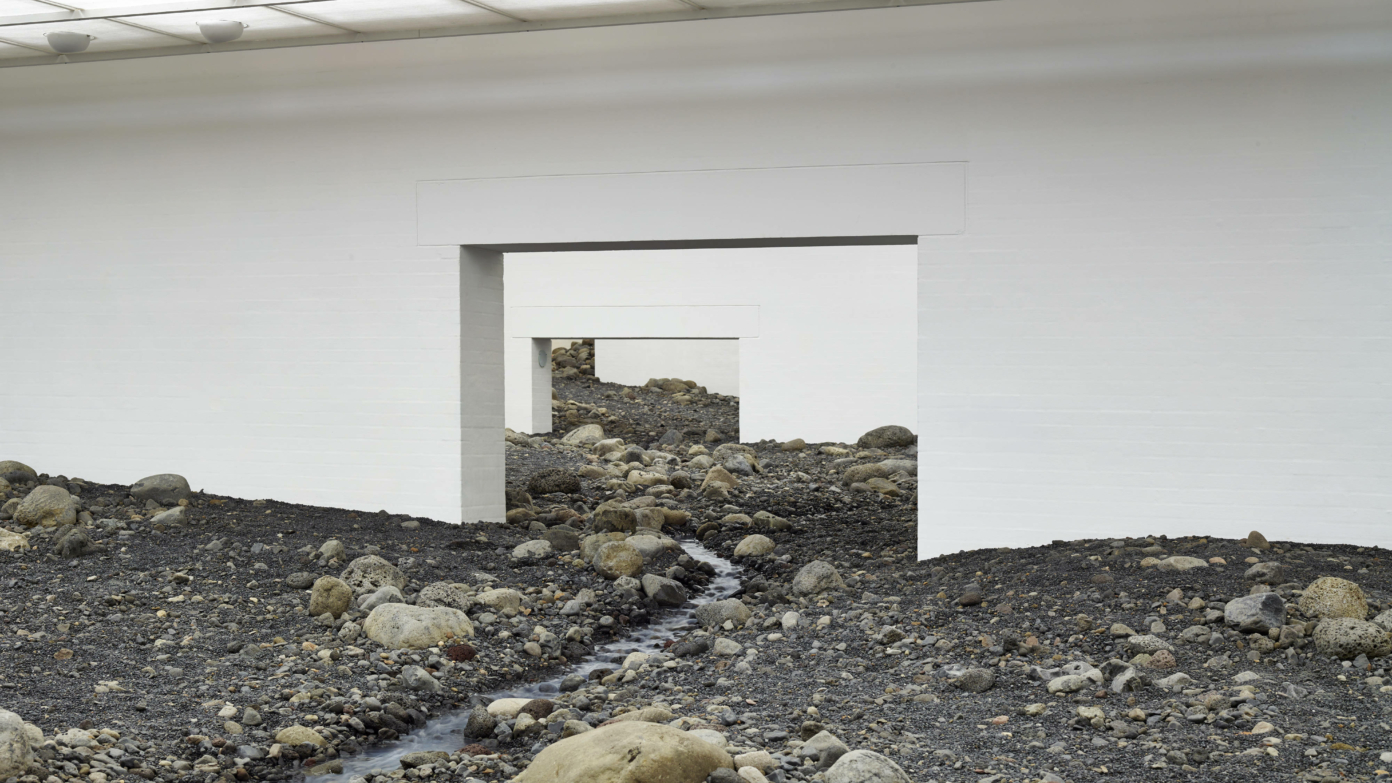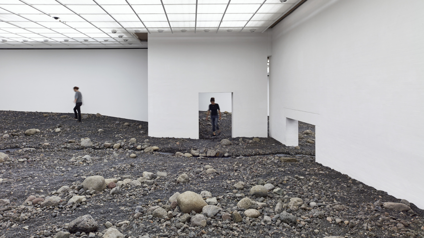 Riverbed construit une nature, transformant une aile entière du musée en un paysage fluvial composé de tonnes de pierre et de terre, paysage accidenté que le spectateur traverse, accompagné du bruit de l’eau, des senteurs et de la texture de la terre. L’action du spectateur devient prépondérante, son interaction physique transformant de fait l’œuvre par ses mouvements. L’espace d’exposition devient le centre d’expérimentation d’un paysage condensé dans un environnement radicalement artificiel. La dimension immersive de l’installation crée tout à la fois une expérience et la prise conscience de cette expérience.