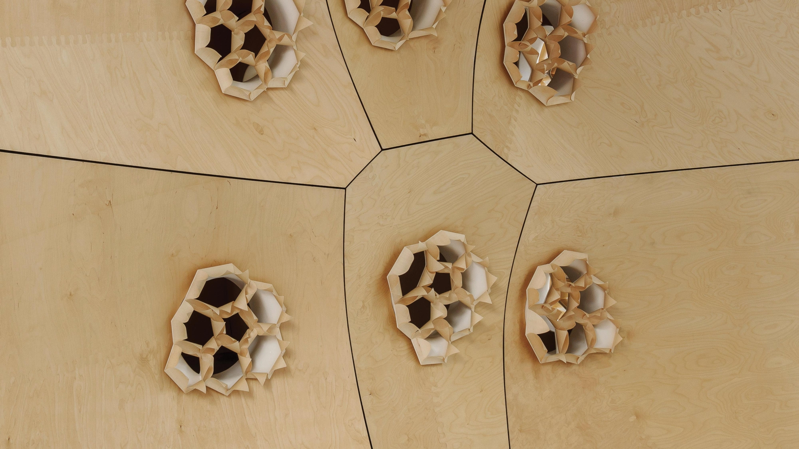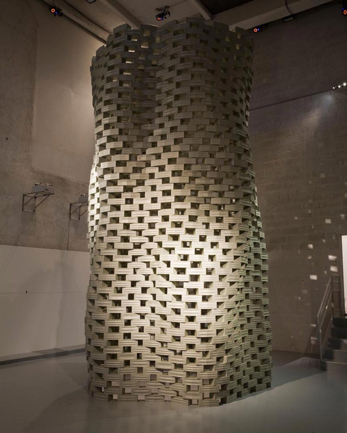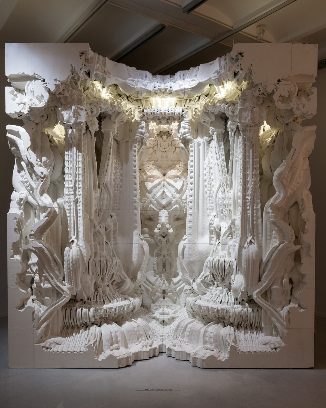 Marie-Ange Brayer : Les concepts de naturalisation de la ville, la dimension contextuelle, sont présents partout : grâce au logiciel de simulation Cellular automata, Alisa Andrasek (Biothing) modélise l’interaction d’agents qui se complexifie en « essaims », intégrant l’architecture à son environnement urbain. SPAN (Matias del Campo, Sandra Manninger) réfléchit au développement urbain à partir de la géométrie récursive des fractales afin d’envisager des modèles de comportement organique de croissance de la ville. L’échelle du micro est partout reliée à celle du macro, de l’objet de design à l’échelle urbaine globale. Cette approche peut passer par le matériau, comme les recherches en biotechnologie de X-TU (Anouk Legendre, Nicolas Desmazières) : le recours aux micro-algues permet de repenser l’urbanisme comme une biomasse en permanente évolution. Grotto de Michael Hansmeyer (avec B. Dillenburger), réalisée par des imprimantes 3D, laisse présager une nouvelle complexité matérielle qui pourra bientôt s’affranchir de l’échelle réduite de l’imprimante 3D pour générer des systèmes architecturaux évolutifs à l’échelle urbaine. Dans les projets de Michael Hansmeyer, l’autonomie de l’ornement a dissous toute tectonique, toute compréhension géométrique de l’espace pour s’ouvrir à un nouvel espace-temps cognitif, malléable et pourquoi pas un jour, réversible.