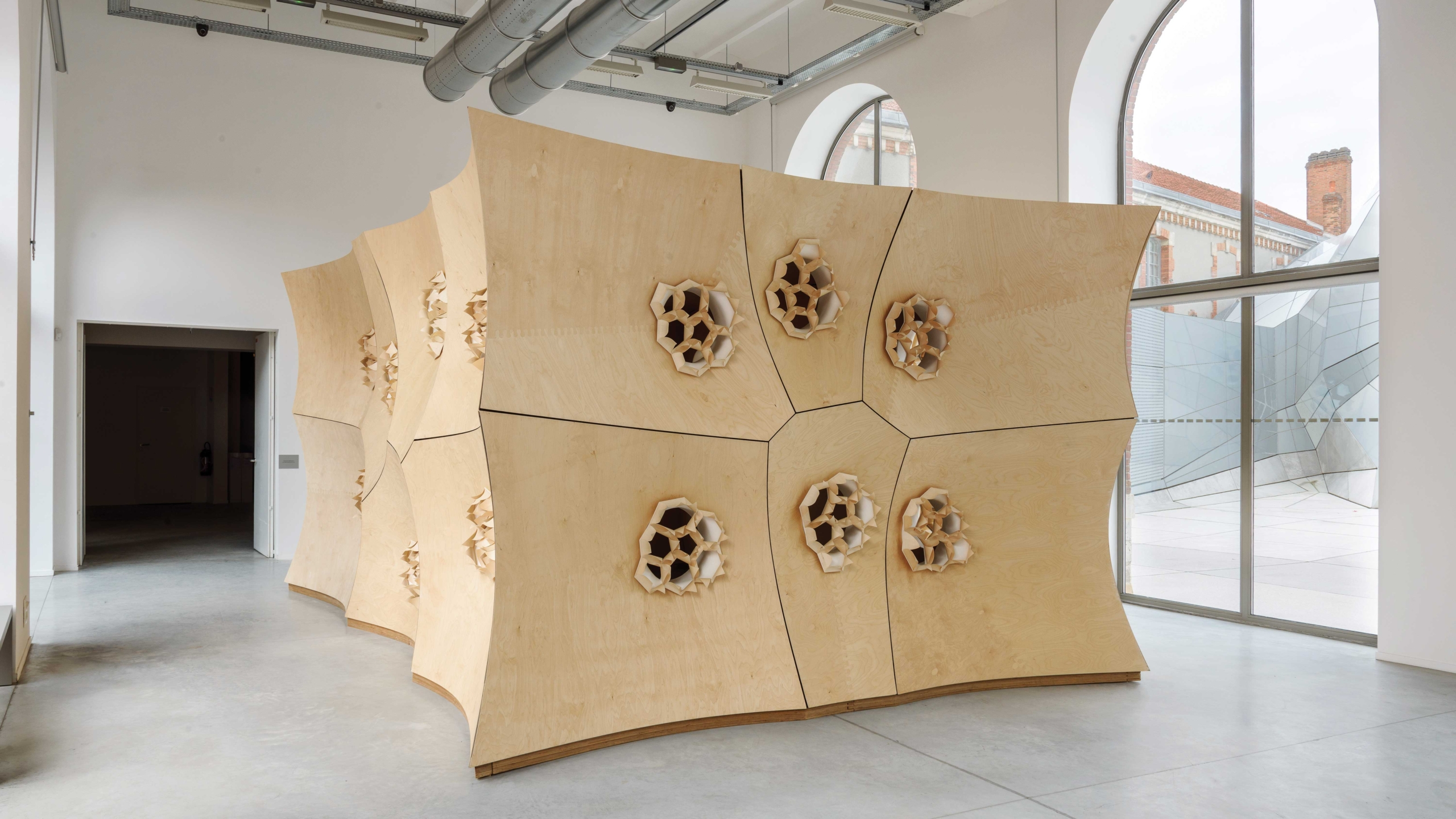 Marie-Ange Brayer : Les nouvelles technologies de l’information et de la communication sont inhérentes aux recherches que mènent les architectes. Lorsque Gramazio & Kohler, avec Rafaello d’Andrea, présentent la première construction architecturale non réalisée par l’homme, mais par des robots volants, au Frac Centre en 2011, ils défendent le temps simultané de la conception et de la réalisation grâce à la robotique. Lorsque Achim Menges réalise HygroSkin Meteorosensitive Pavilion (coll. Frac Centre), il revient aux propriétés hygroscopiques du matériau, le bois, tout en l’associant à une recherche technologique de pointe qui lui a permis d’incruster des microparticules de bois dans les interstices qui s’ouvrent ou se referment selon l’humidité de leur environnement. La recherche d’une efficience énergétique passe par ces nouvelles technologies qui disparaissent en tant que superstructure pour s’incorporer au matériau même et donner naissance à une architecture low-tech et performative, qui réagit aux conditions matérielles de son environnement. La révolution est là, dans cette intégration de la technologie au sein même de la matière, comme en témoignent encore les recherches sur l’auto-assemblage de Skylar Tibbits.