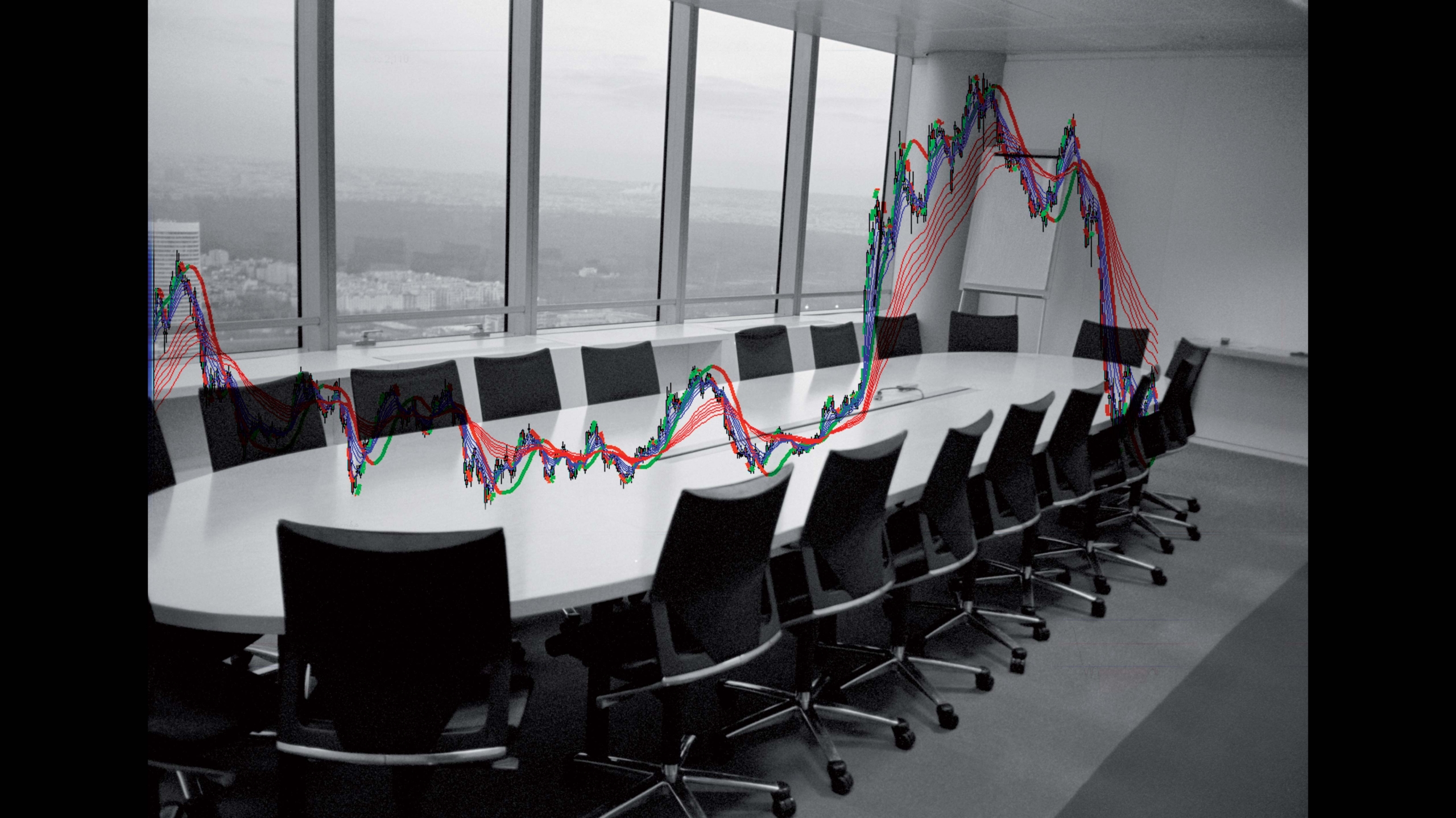 Le langage associé découle naturellement de cette onde. Il est une distorsion linguistique de textes théoriques et personnels traduits du français au chinois, du chinois au russe, du russe à l’arabe, via l’allemand, puis enfin au français. C’est la langue de demain. Cet évidement manifeste révèle le squelette d’une fonction obsolète. La courbe dégringolante de l’économie mondiale devient notre marc de café pour décrypter les formes du futur : celles du temps d’une finance dilatée.
