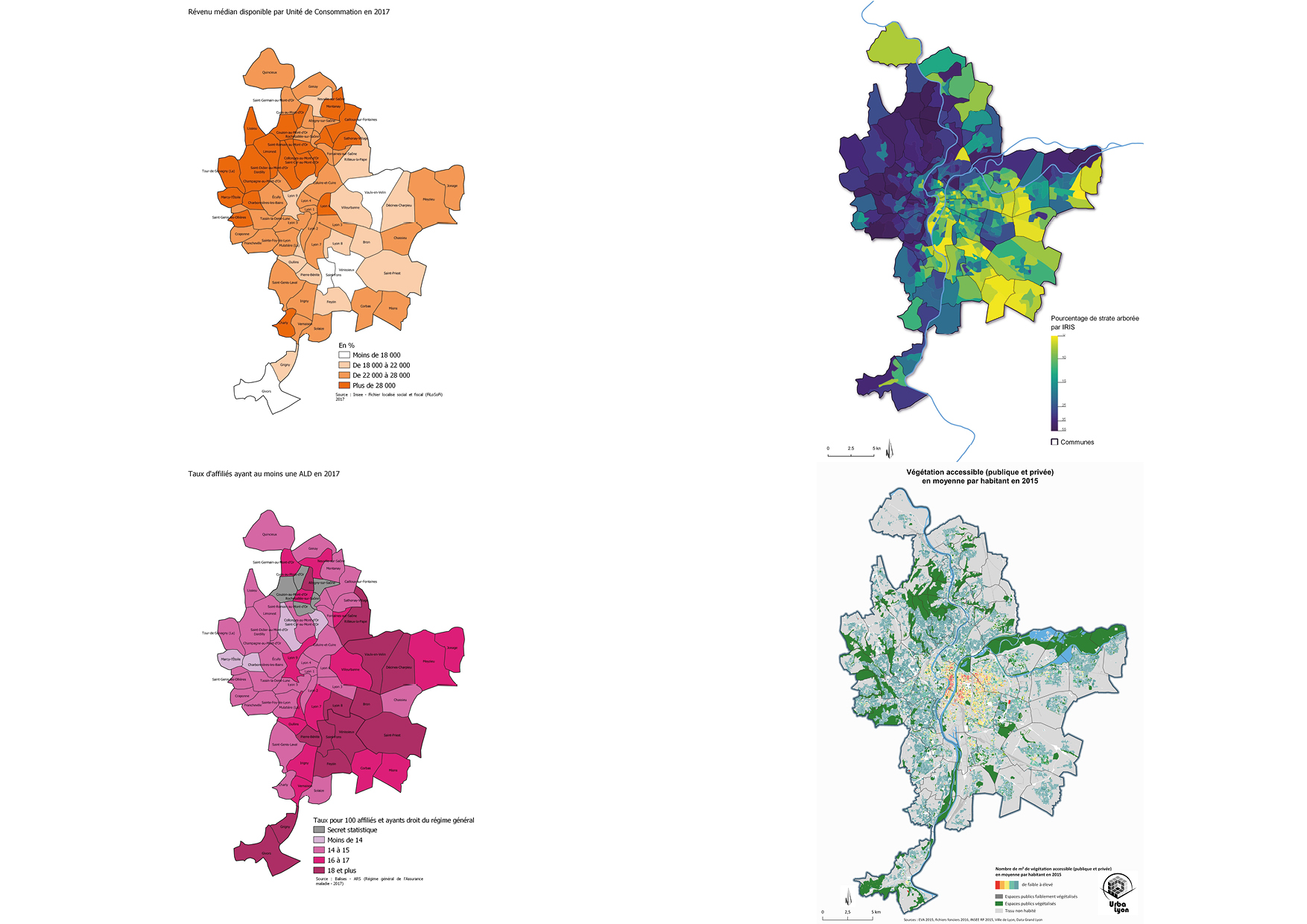 L’analyse de la canopée a également révélé son inégale répartition. Les communes de l’ouest ont une moyenne de canopée supérieure à 40 %, alors que les communes de l’est sont en dessous de la moyenne des 27 %. On constate en parallèle des concordances entre la surface de canopée et d’autres indicateurs tels que les îlots de chaleur, l’espérance de vie, les maladies cardio-vasculaires ou l’exposition aux polluants… Même si on ne peut pas parler de corrélation d’un point de vue scientifique, il s’agit de « boucles relationnelles ». Le lien de cause à effet n’est pas direct, mais il existe des relations entre ces facteurs environnementaux et sociaux. La recherche d’une équité environnementale, liée à toute une série de facteurs historiques, topographiques, d’usage des sols etc. est donc au cœur du débat.