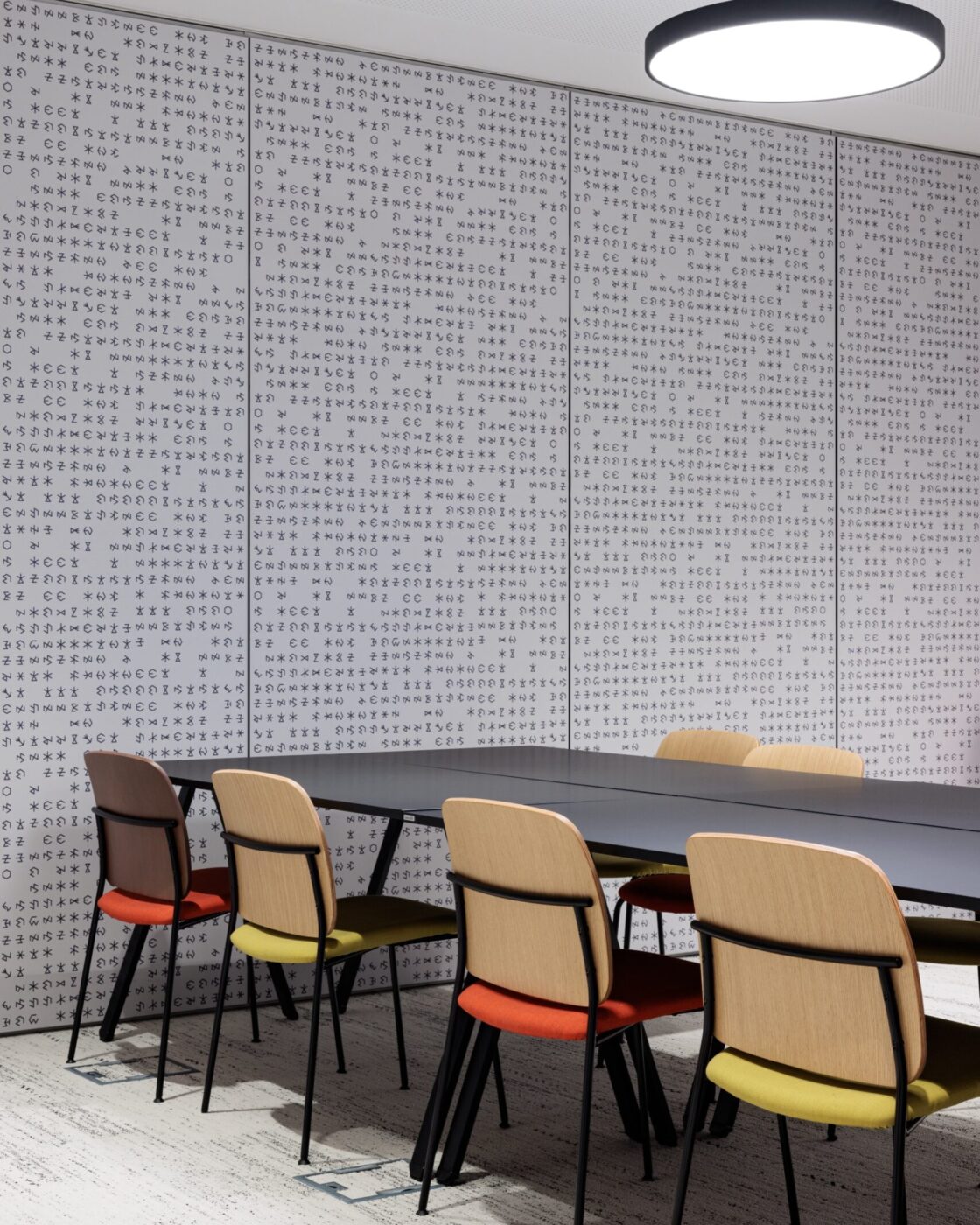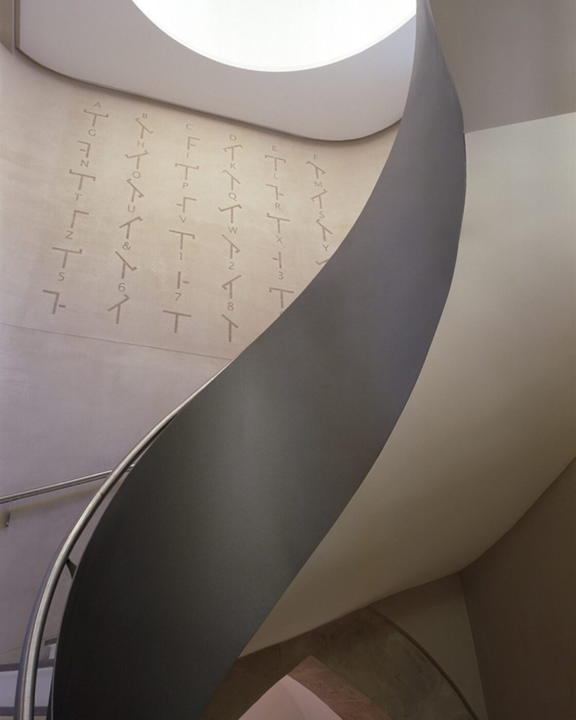 Pour témoigner de l’aventure technologique et humaine du 103 Grenelle, PCA-STREAM a ancré son travail de restructuration dans l’histoire d’un bâtiment qui a été pendant des décennies le cœur des communications françaises. L’agence a invité le duo d’artistes brésiliens Detanico & Lain à concevoir une intervention in situ pour révéler et réactiver ce passé lié à la technologie et à l’échange. En s’inspirant de l’alphabet développé par Chappe, ils ont imaginé un système graphique évolutif dont les lettres rappellent les mouvements des bras télégraphiques. L’alphabet recomposé par Detanico & Lain déploie dans le bâtiment une présence graphique discrète et ludique, associée à l’histoire du lieu. Répété sur les murs des circulations et des parties communes, l’alphabet s’épure au fil des étages. Chaque niveau a ainsi son identité propre au sein de la démarche d’ensemble.