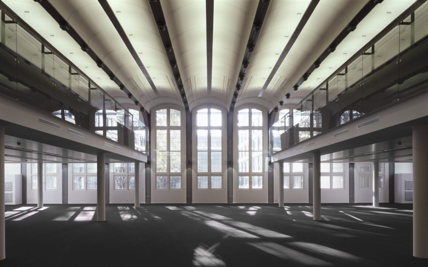 Le bâtiment est finement restauré, la cour repavée et la tour Chappe réintégrée à l’ensemble, tandis que les espaces sont rationalisés et remis aux normes. PCA-STREAM a pris le parti de démolitions minimales, essentiellement pour restituer les volumes et détails exceptionnels de l’architecture industrielle, notamment les structures métalliques Eiffel. L’éclairage naturel est privilégié, avec la restauration de la grande verrière et la dépose d’une partie des demi-niveaux, qui permet de retrouver les emblématiques espaces en double hauteur. L’aménagement est repensé de façon contemporaine, notamment dans les halls aux banques d’accueil lumineuses. Livré en 2009, le nouvel ensemble offre 16 000 m² d’espaces de travail, ainsi qu’un restaurant, un fitness, un auditorium et un centre d’affaires en sous-sol. Cette restructuration responsable a bénéficié de la première certification HQE pour un immeuble en pierre de taille à Paris.