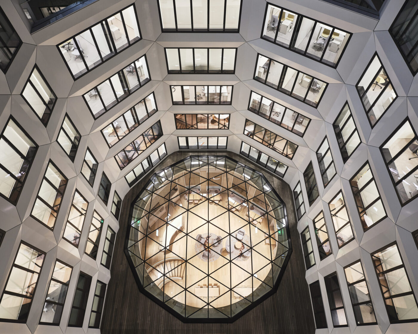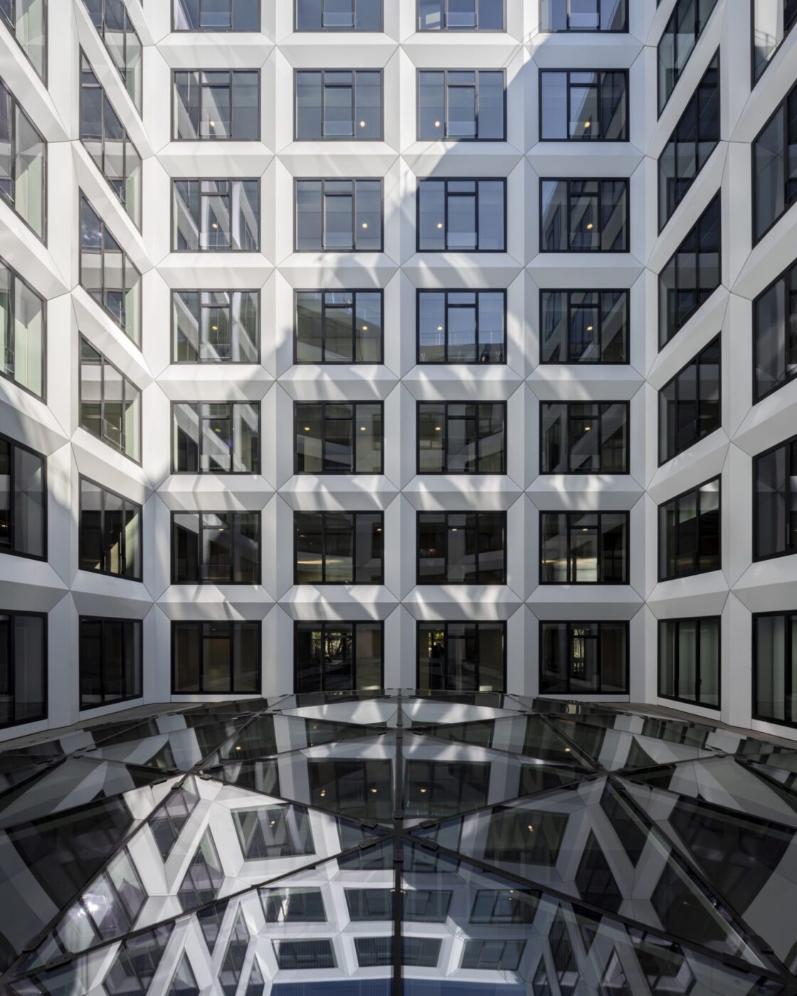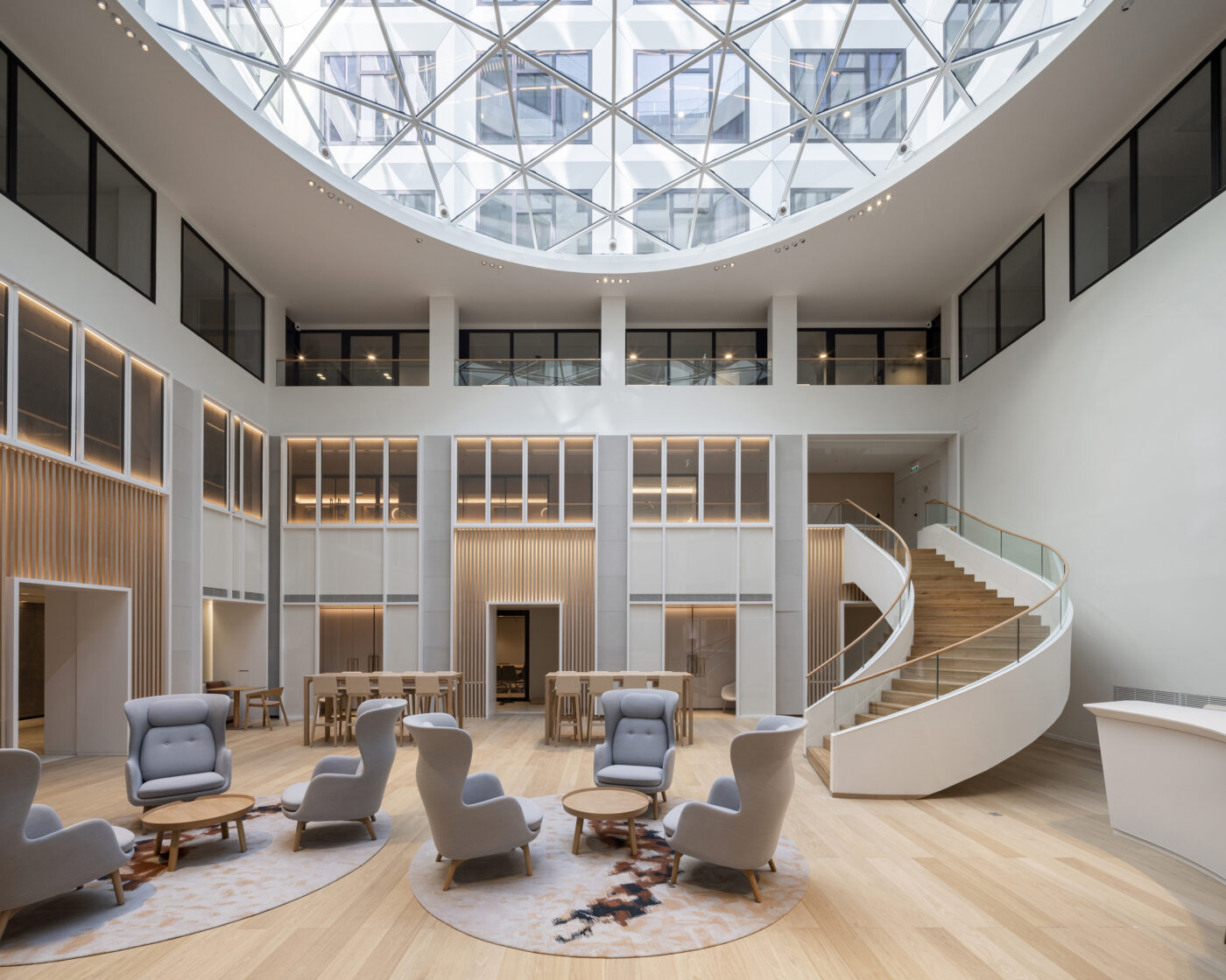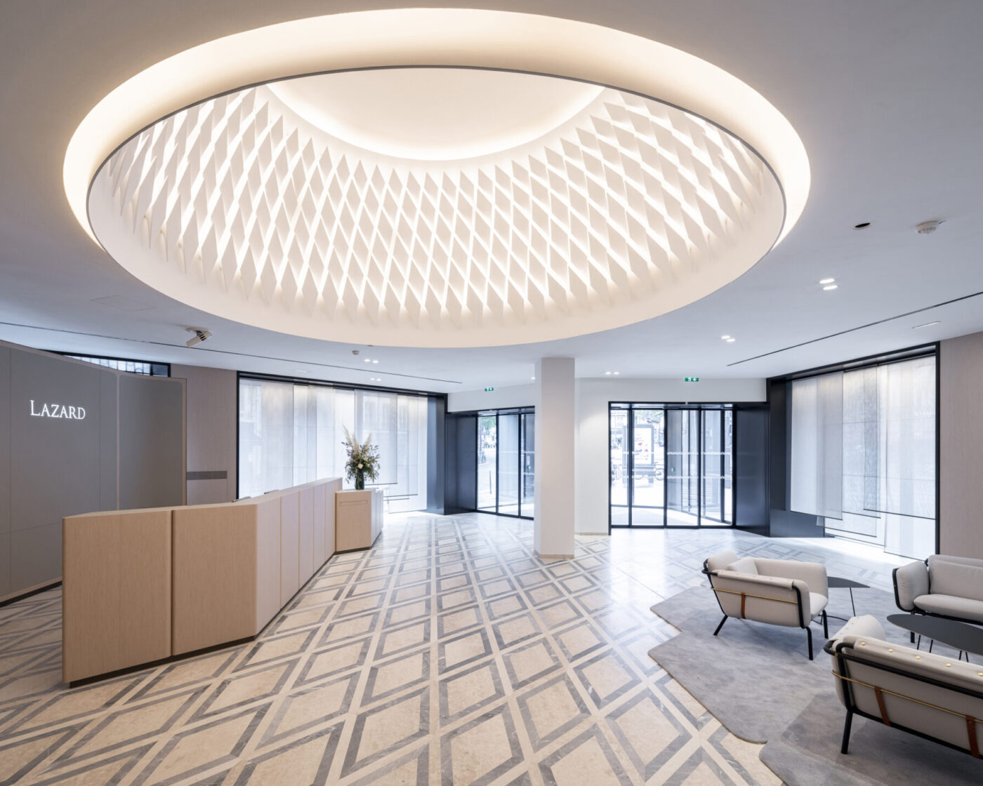 Le projet porte une attention particulière au design des espaces de services, dans l’esprit des lobbys d’hôtel, mais aussi au mobilier, selon des codes esthétiques plus domestiques que tertiaires. Les plateaux ouverts visent une flexibilité maximale et sont très lumineux grâce à un dispositif innovant sur le patio vitré. Ils sont complétés d’un ratio important d’espaces communs favorisant la rencontre et la collaboration informelle. L’élargissement de la cour central a permis d’y créer un espace commun convivial et lumineux, qui devient une place du village pour la communauté de Lazard. Sous une verrière en triple hauteur, c’est l’espace où les collaborateurs se retrouvent, échangent ou travaillent informellement.