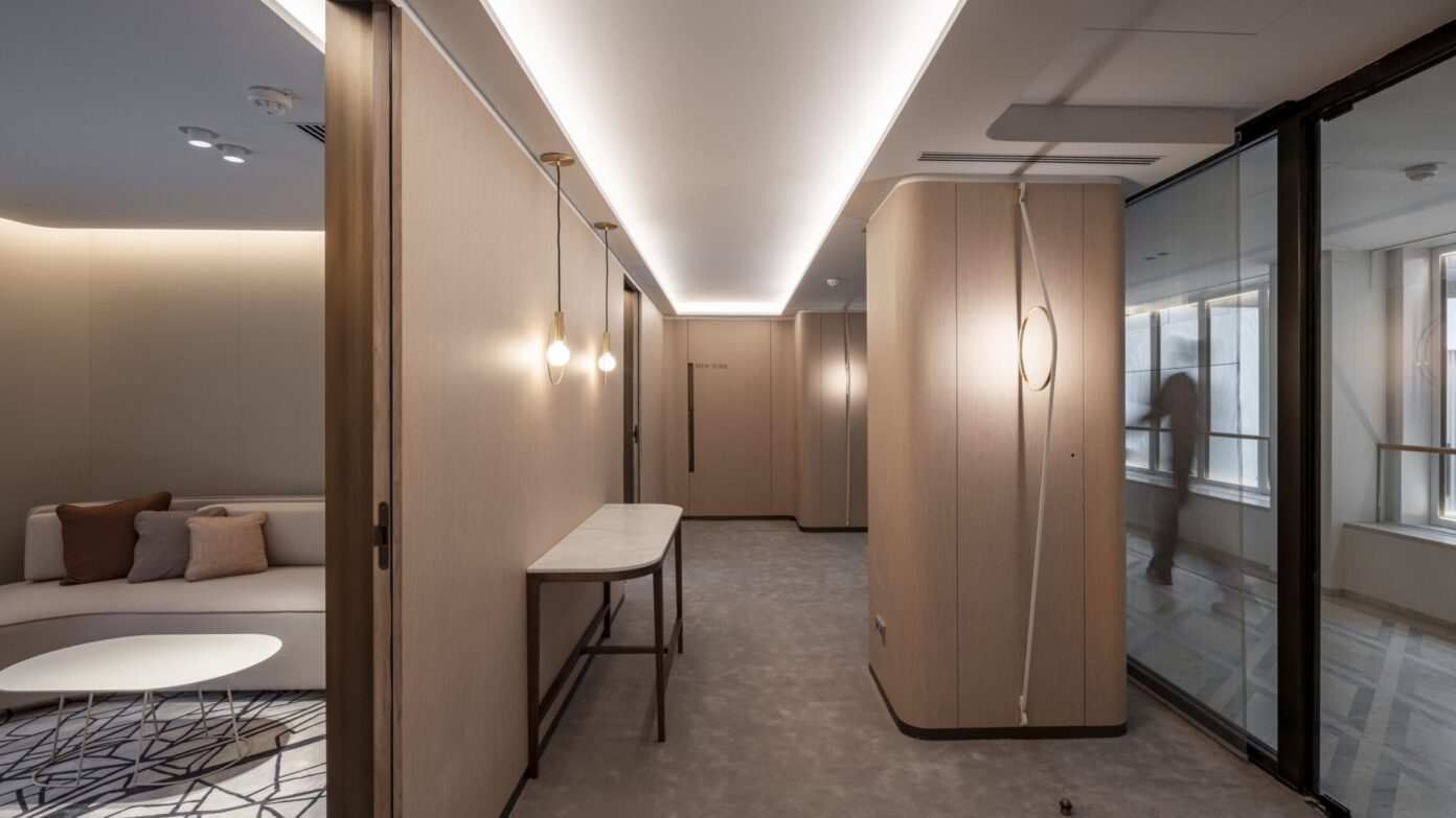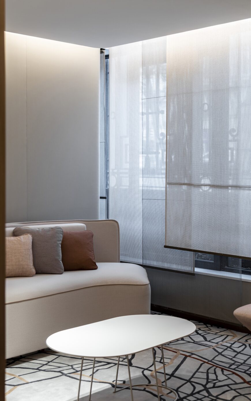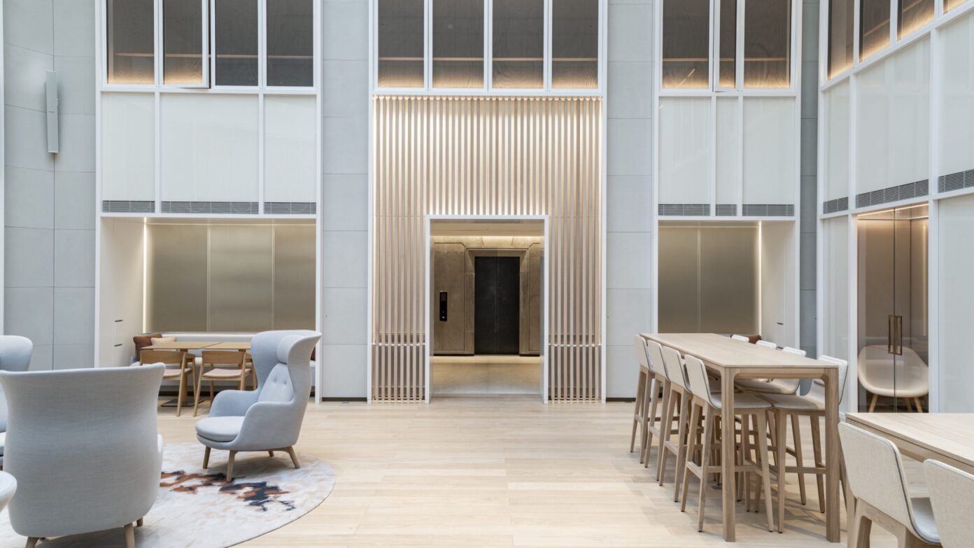 Le projet porte une attention particulière au design des espaces de services, dans l’esprit des lobbys d’hôtel, mais aussi au mobilier, selon des codes esthétiques plus domestiques que tertiaires. Les plateaux ouverts visent une flexibilité maximale et sont très lumineux grâce à un dispositif innovant sur le patio vitré. Ils sont complétés d’un ratio important d’espaces communs favorisant la rencontre et la collaboration informelle. L’élargissement de la cour central a permis d’y créer un espace commun convivial et lumineux, qui devient une place du village pour la communauté de Lazard. Sous une verrière en triple hauteur, c’est l’espace où les collaborateurs se retrouvent, échangent ou travaillent informellement.