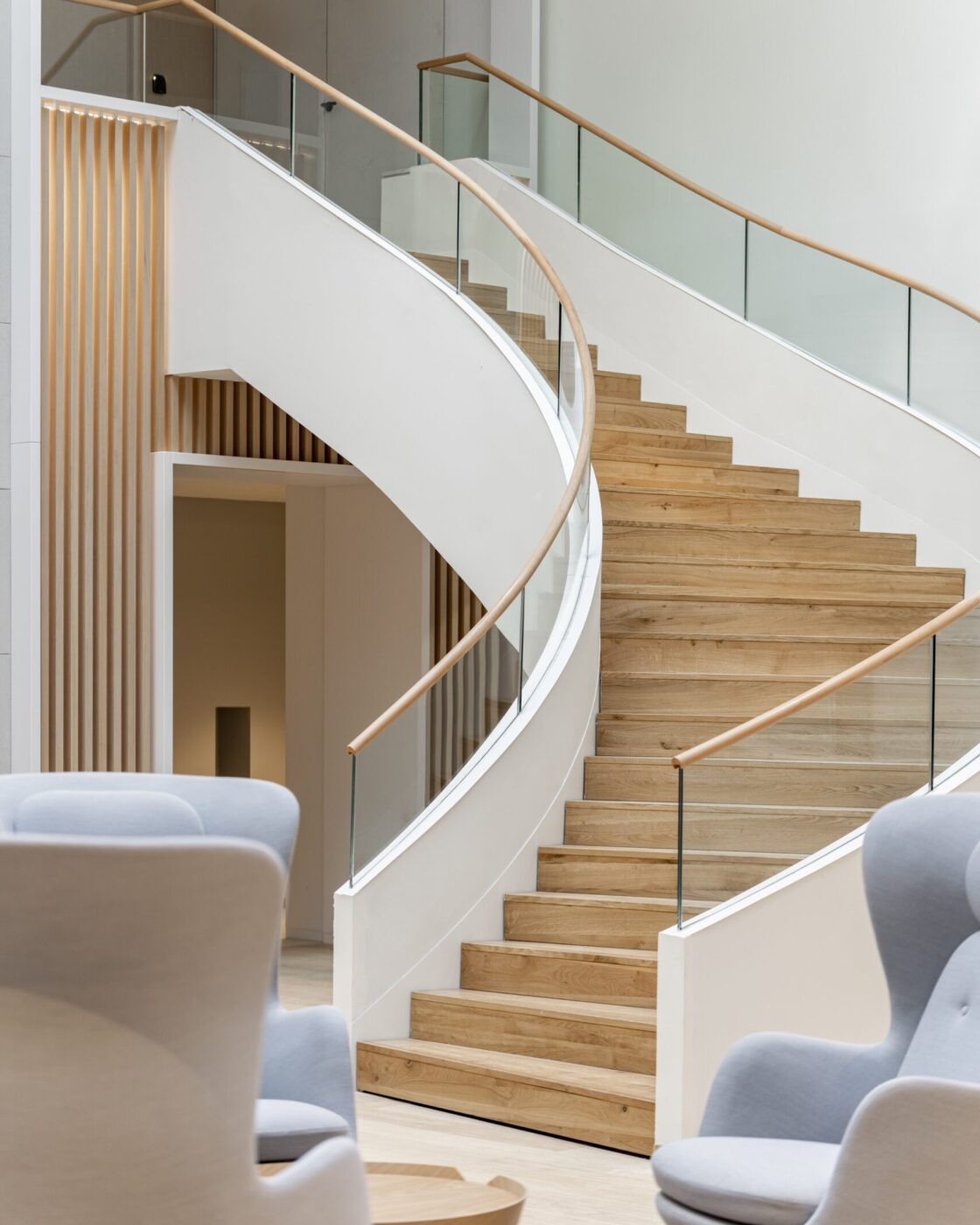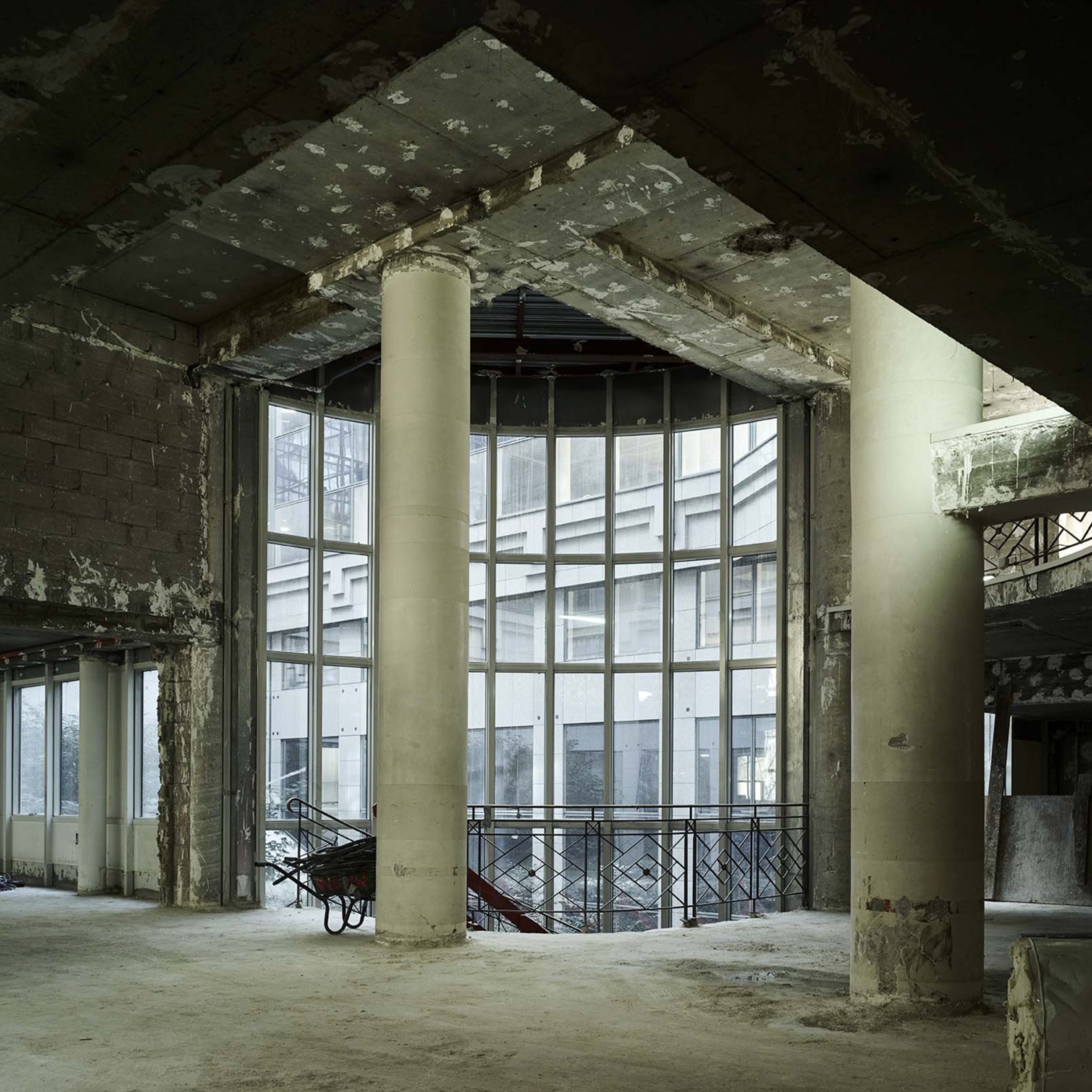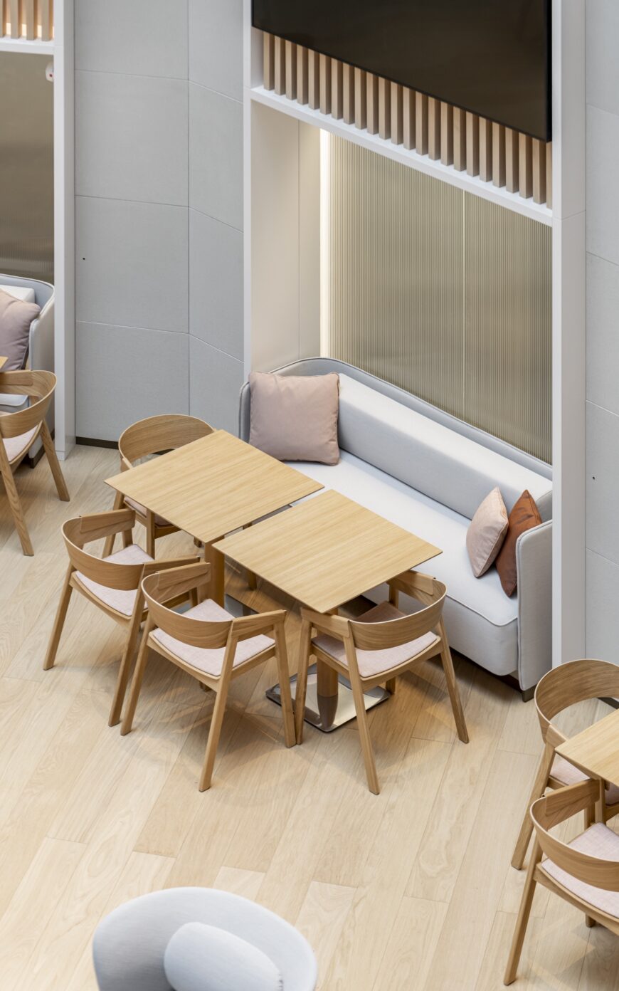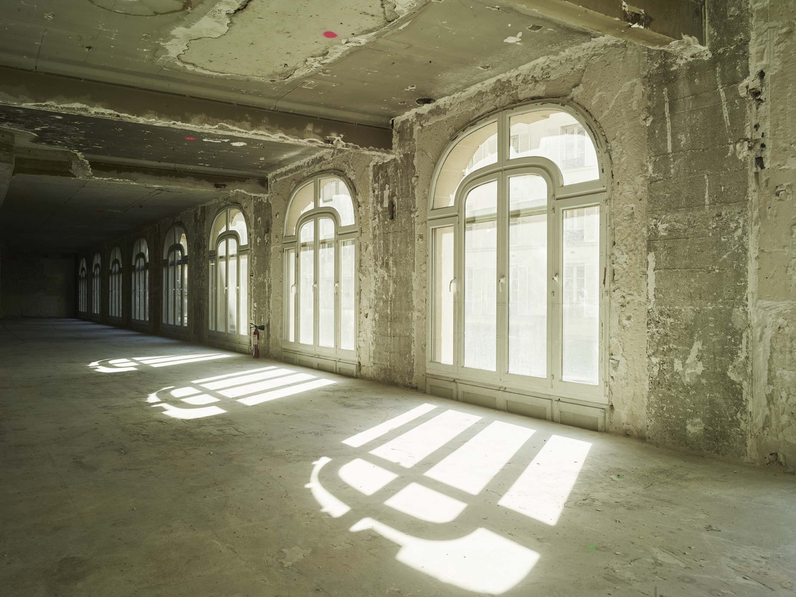 Le projet porte une attention particulière au design des espaces de services, dans l’esprit des lobbys d’hôtel, mais aussi au mobilier, selon des codes esthétiques plus domestiques que tertiaires. Les plateaux ouverts visent une flexibilité maximale et sont très lumineux grâce à un dispositif innovant sur le patio vitré. Ils sont complétés d’un ratio important d’espaces communs favorisant la rencontre et la collaboration informelle. L’élargissement de la cour central a permis d’y créer un espace commun convivial et lumineux, qui devient une place du village pour la communauté de Lazard. Sous une verrière en triple hauteur, c’est l’espace où les collaborateurs se retrouvent, échangent ou travaillent informellement.