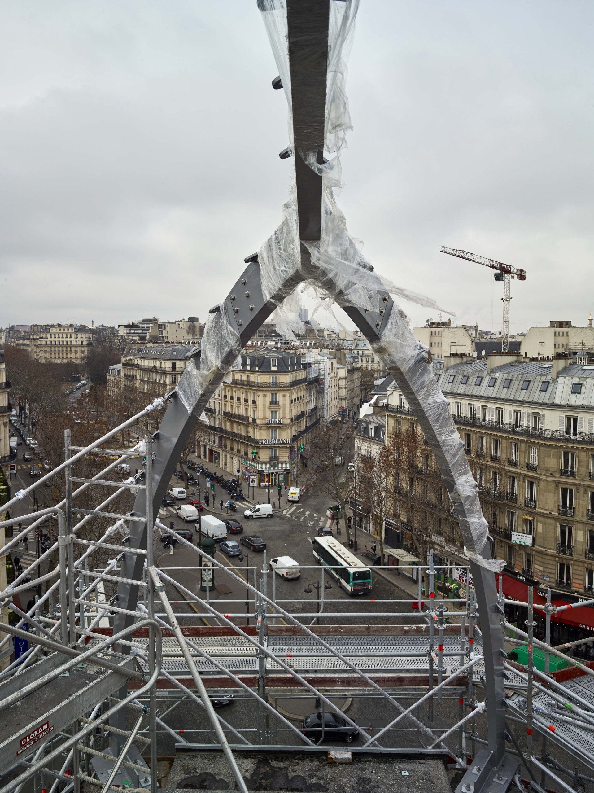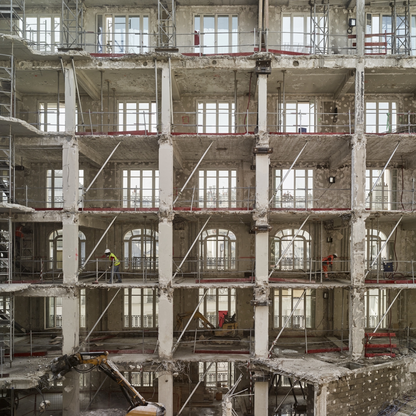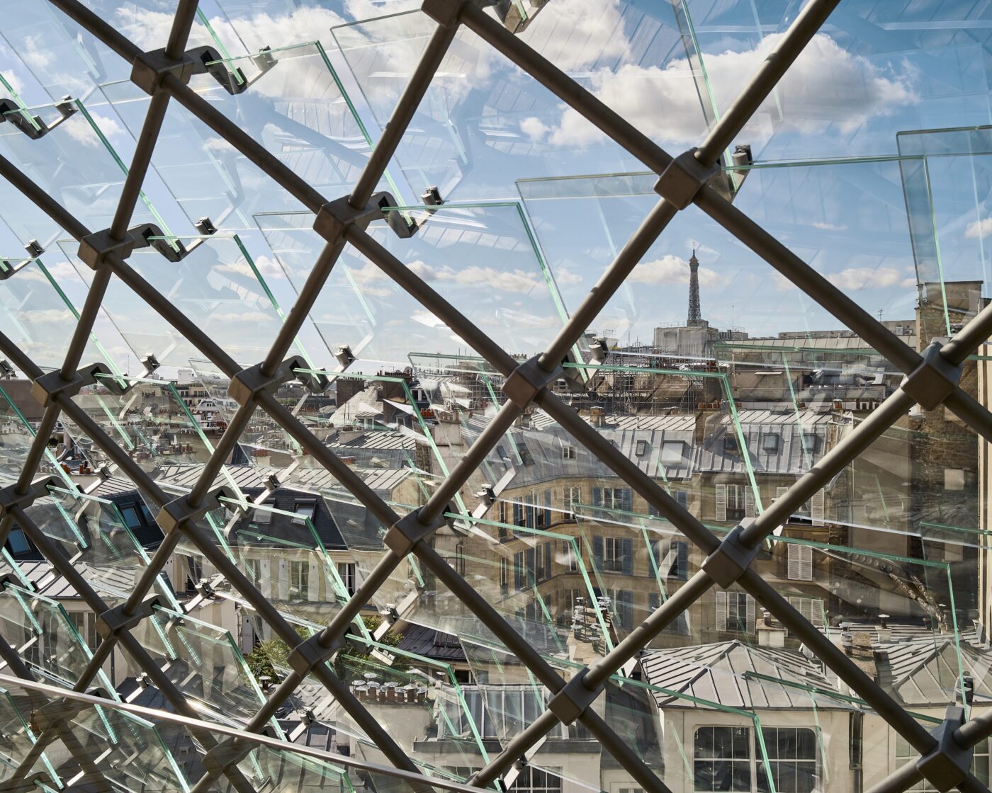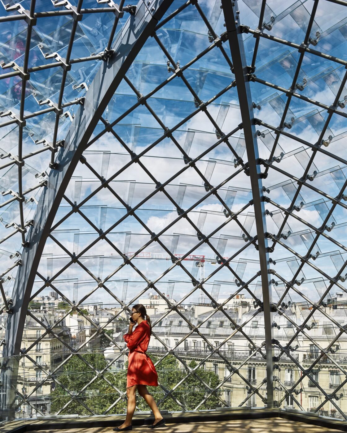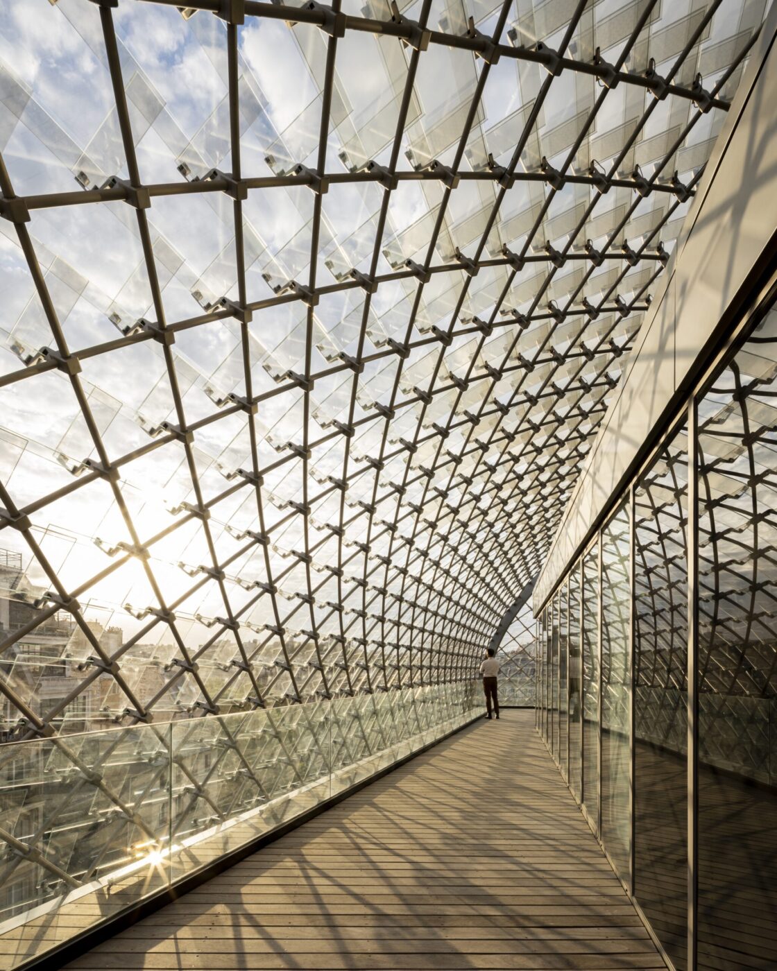 La libération du rez-de-chaussée du 175 a permis de ramener les accès vers la pointe du bâtiment et de créer une entrée majestueuse dans l’axe, soulignée par un lustre spectaculaire dans la double hauteur. La clarification des circulations par un noyau et des plateaux repensés permet de gommer la frontière entre les immeubles. En surélévation, un étage en pierre est complété de deux étages sous verrière, qui donnent à l’ensemble une esthétique unique. La verrière réinvente l’identité du 175 Haussmann en apportant un élément contemporain intégré au contexte historique et patrimonial du quartier. Ce signal urbain illustre le nouveau rôle symbolique du siège social, qui incarne l’identité de l’entreprise, génère de l’appartenance auprès des collaborateurs et permet d’attirer les nouveaux talents.