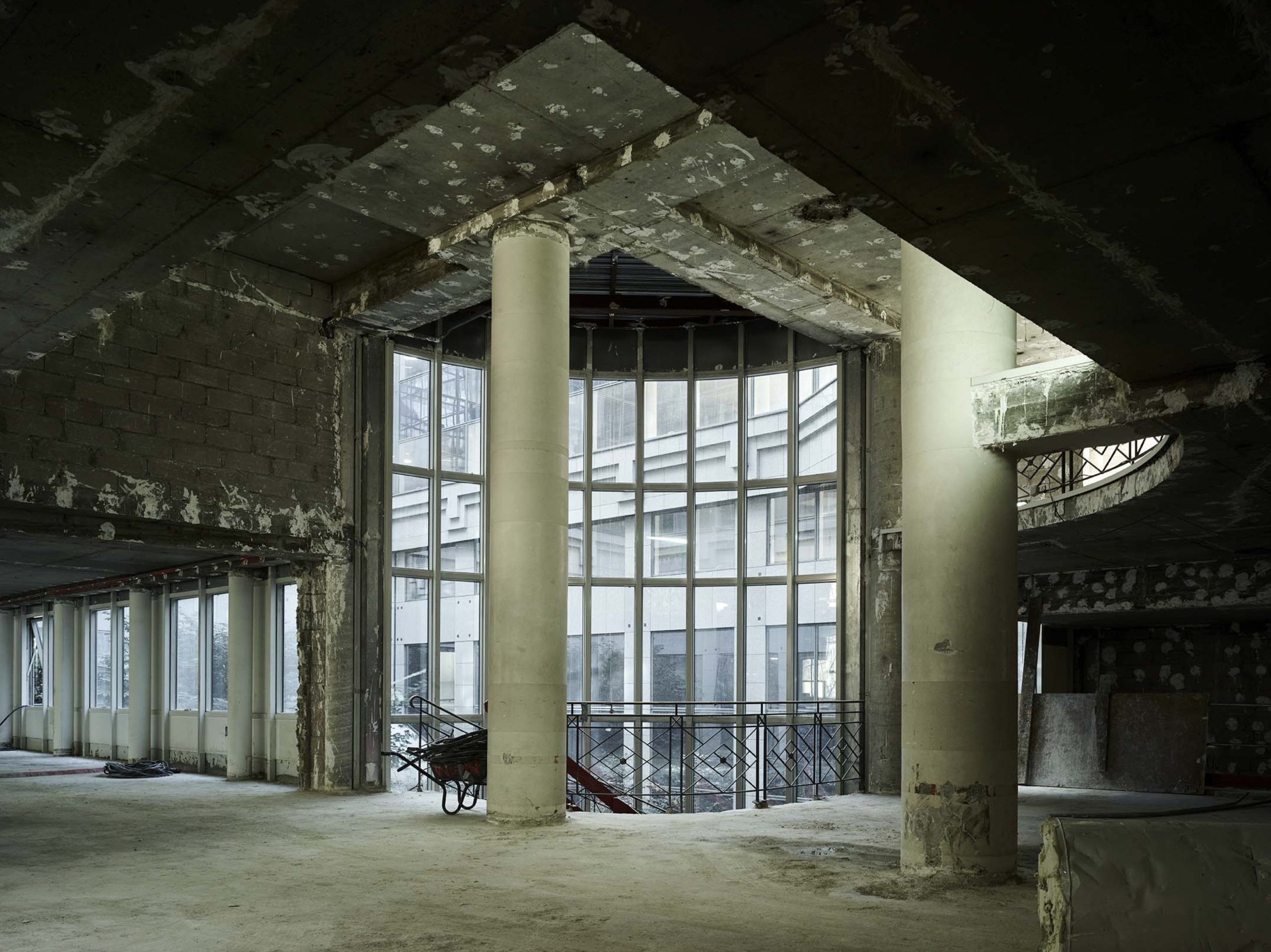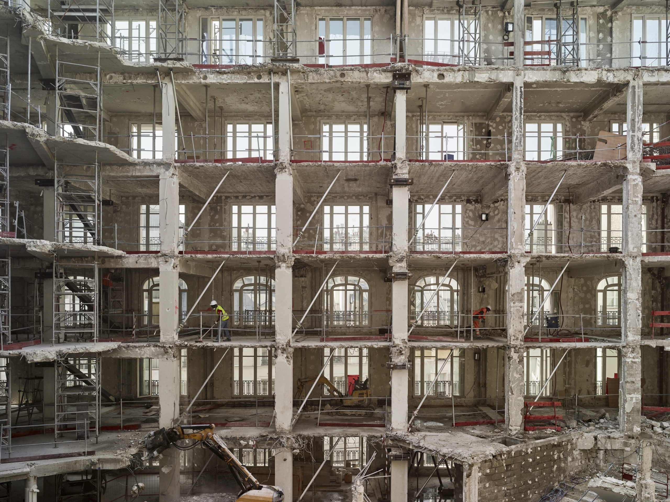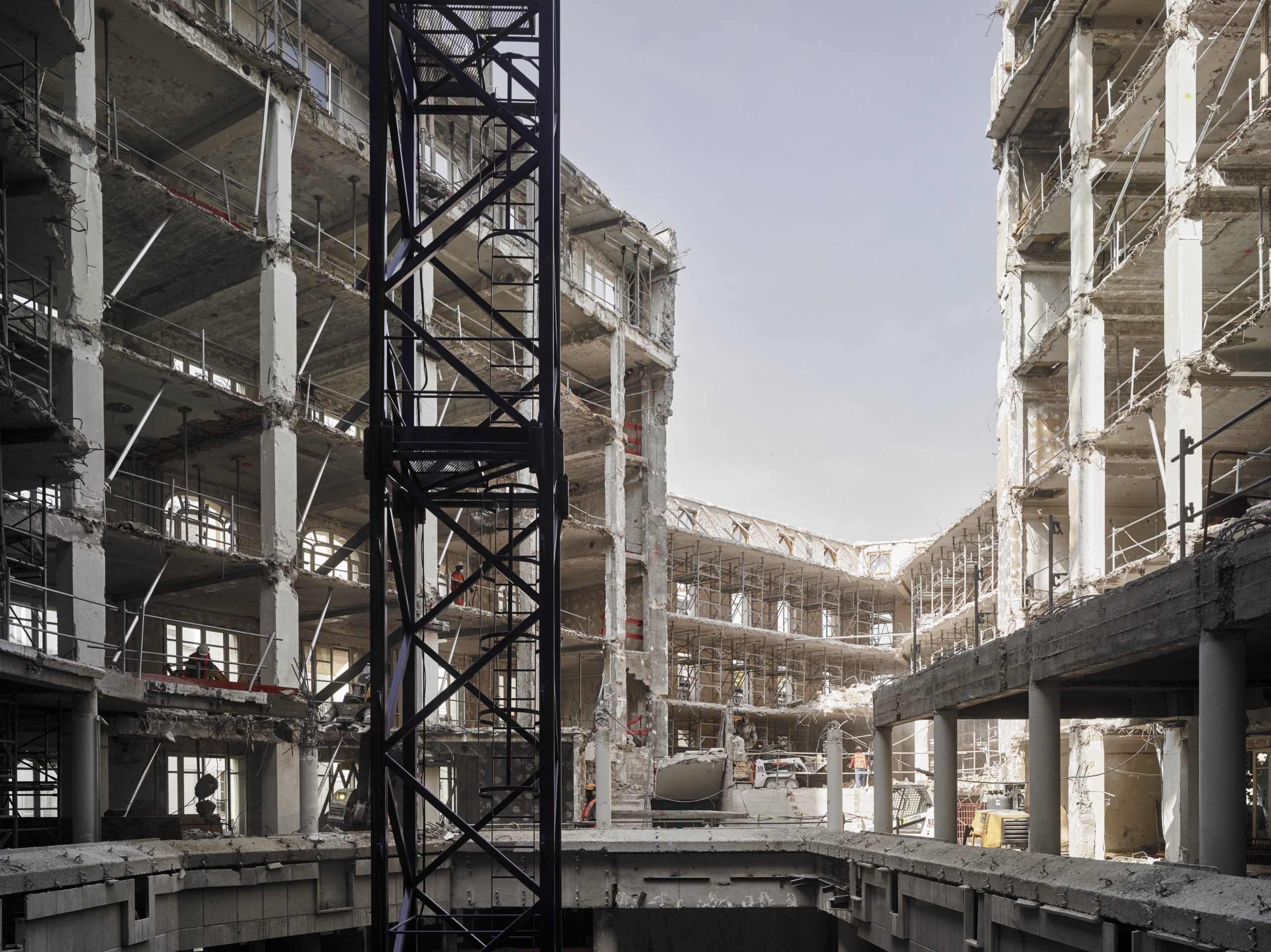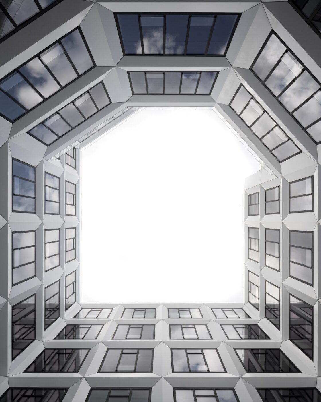 La libération du rez-de-chaussée du 175 a permis de ramener les accès vers la pointe du bâtiment et de créer une entrée majestueuse dans l’axe, soulignée par un lustre spectaculaire dans la double hauteur. La clarification des circulations par un noyau et des plateaux repensés permet de gommer la frontière entre les immeubles. En surélévation, un étage en pierre est complété de deux étages sous verrière, qui donnent à l’ensemble une esthétique unique. La verrière réinvente l’identité du 175 Haussmann en apportant un élément contemporain intégré au contexte historique et patrimonial du quartier. Ce signal urbain illustre le nouveau rôle symbolique du siège social, qui incarne l’identité de l’entreprise, génère de l’appartenance auprès des collaborateurs et permet d’attirer les nouveaux talents.