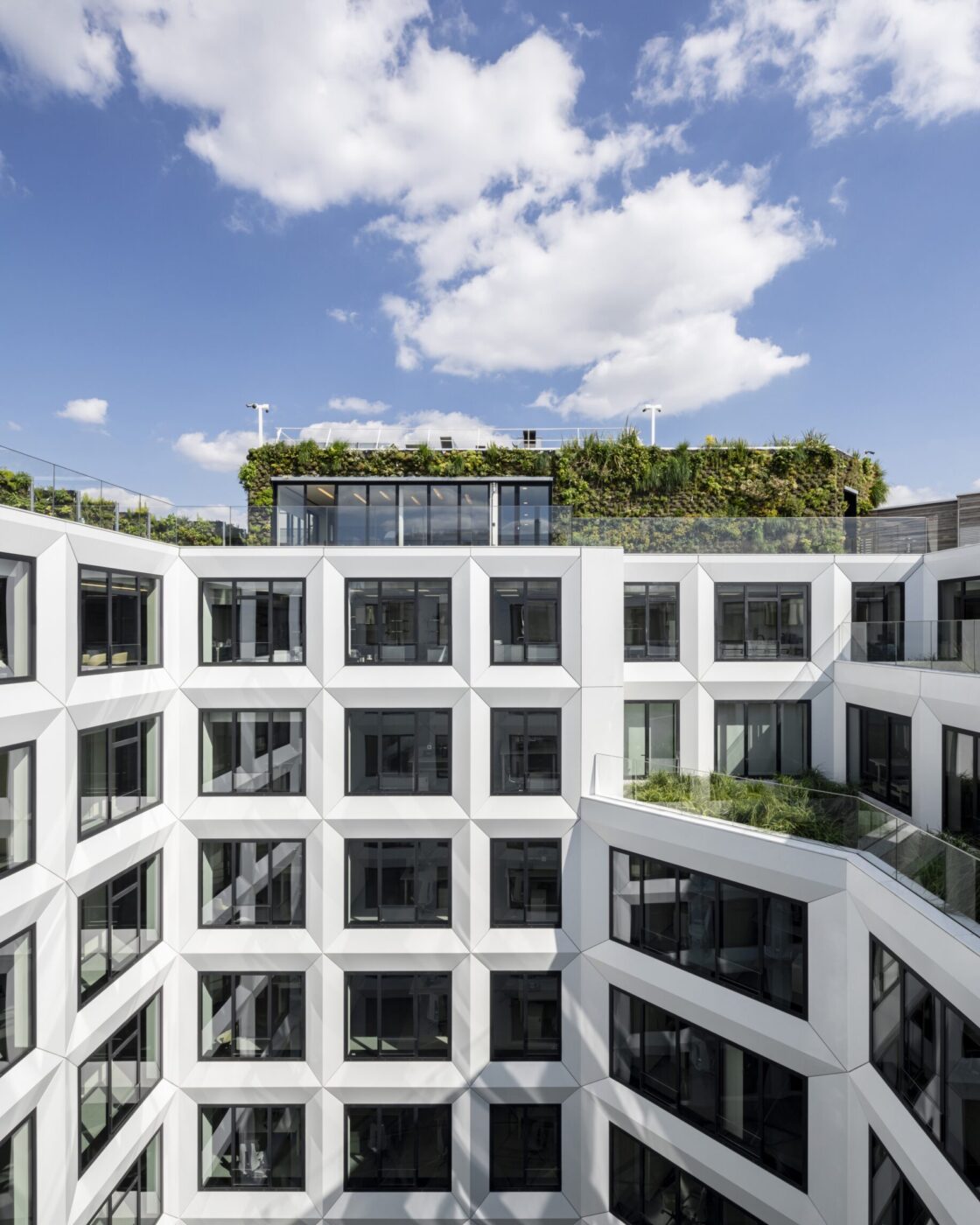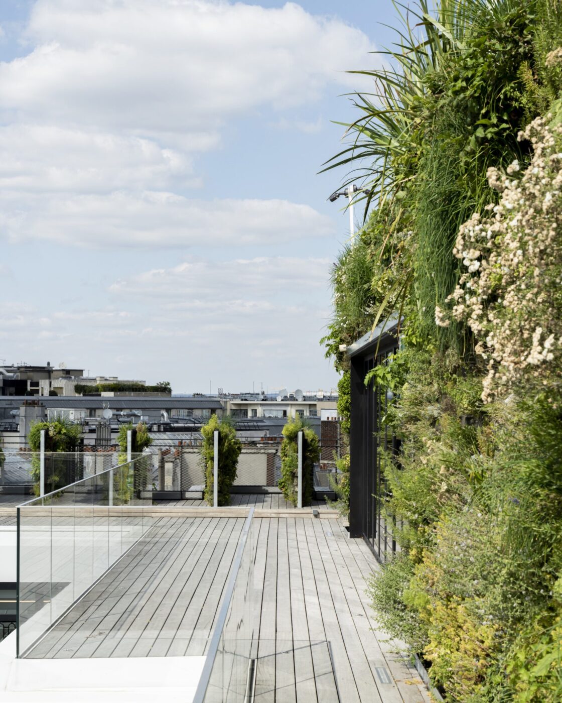 La restructuration du 175 Haussmann a été conçue de façon à encourager une reconnection du bâti et de ses usagers à la nature. Les systèmes de ventilation naturelles et de protection passive sont complétés par des verres photovoltaïques intégrés à la verrière. Les surfaces végétalisées forment un ensemble cohérent et connecté, du sixième étage jusqu’aux toitures inaccessibles. Elles associent la quête de qualité esthétique à la recherche d’un impact environnemental positif. La toiture-terrasse végétalisée met en œuvre une technique innovante de permaculture urbaine verticale, développée en collaboration avec la start-up Sous les Fraises. La biodiversité du quartier est enrichie par une large palette de variétés végétales franciliennes, entretenue à partir de procédés de culture biologique. La végétalisation permet le recyclage de l’eau au sein du bâtiment par un dispositif de phytoépuration.
