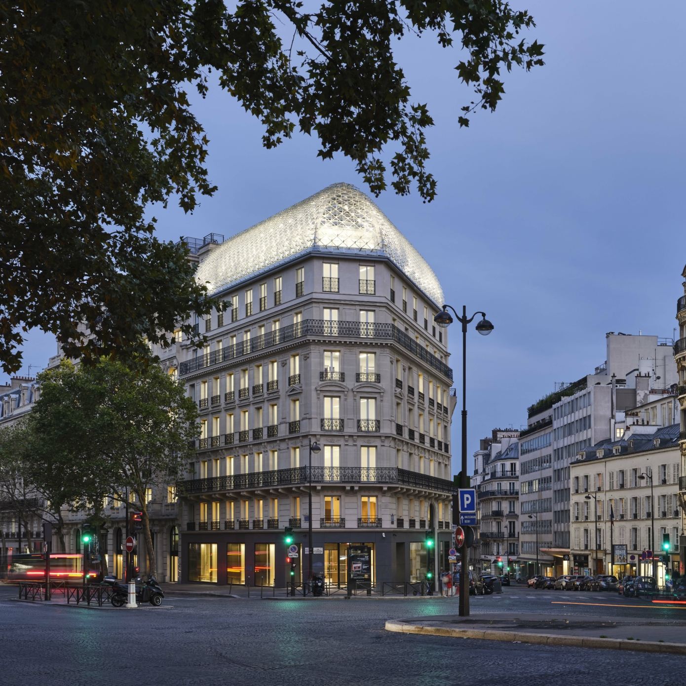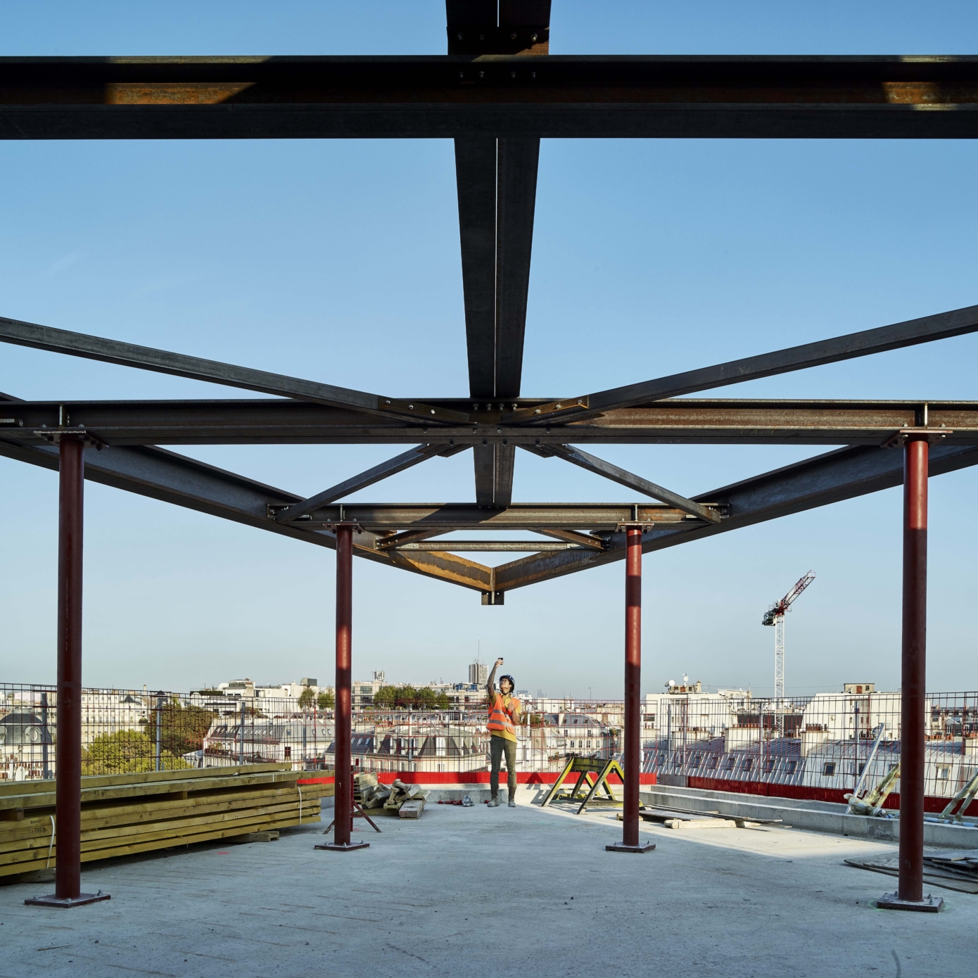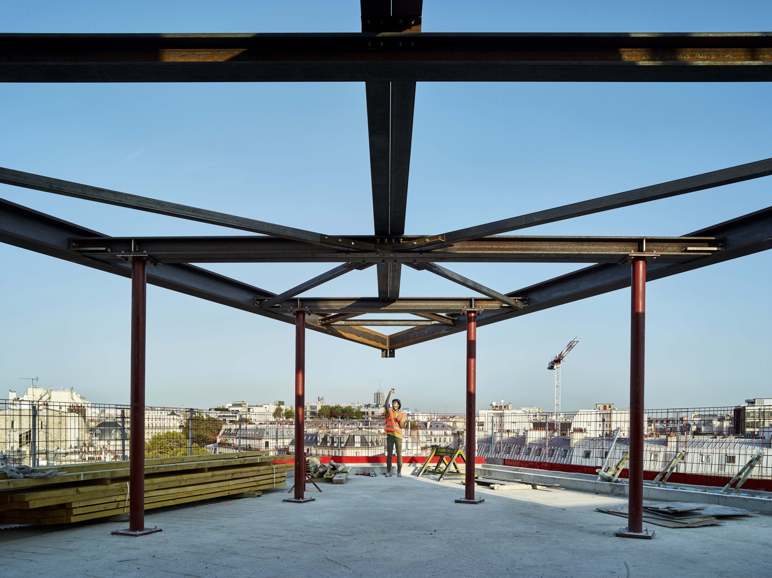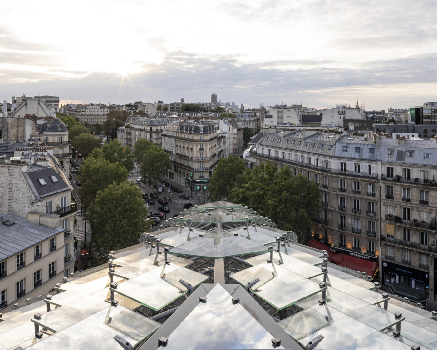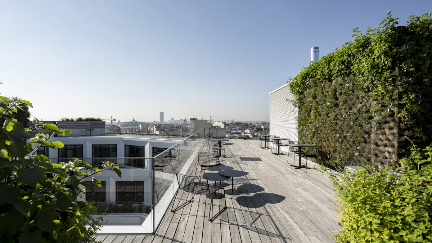 À rebours des immeubles de bureaux classiques, fermés et autarciques, PCA‑STREAM a voulu créer un dialogue intérieur-extérieur par une verrière hybride et un travail de reconquête des toitures. La technique est redistribuée pour y développer une terrasse paysagère à vivre. Les collaborateurs peuvent travailler ou se détendre dans ces espaces informels et inspirants en profitant de vues panoramiques exceptionnelles sur Paris. Le 175 Haussmann se reconnecte à son quartier par un restaurant accessible depuis l’extérieur du bâtiment. Réservé aux équipes de Lazard aux horaires du déjeuner, il est ouvert au public en dehors. Cette hybridation du restaurant d’entreprise permet de favoriser l’émergence d’usages multiples.