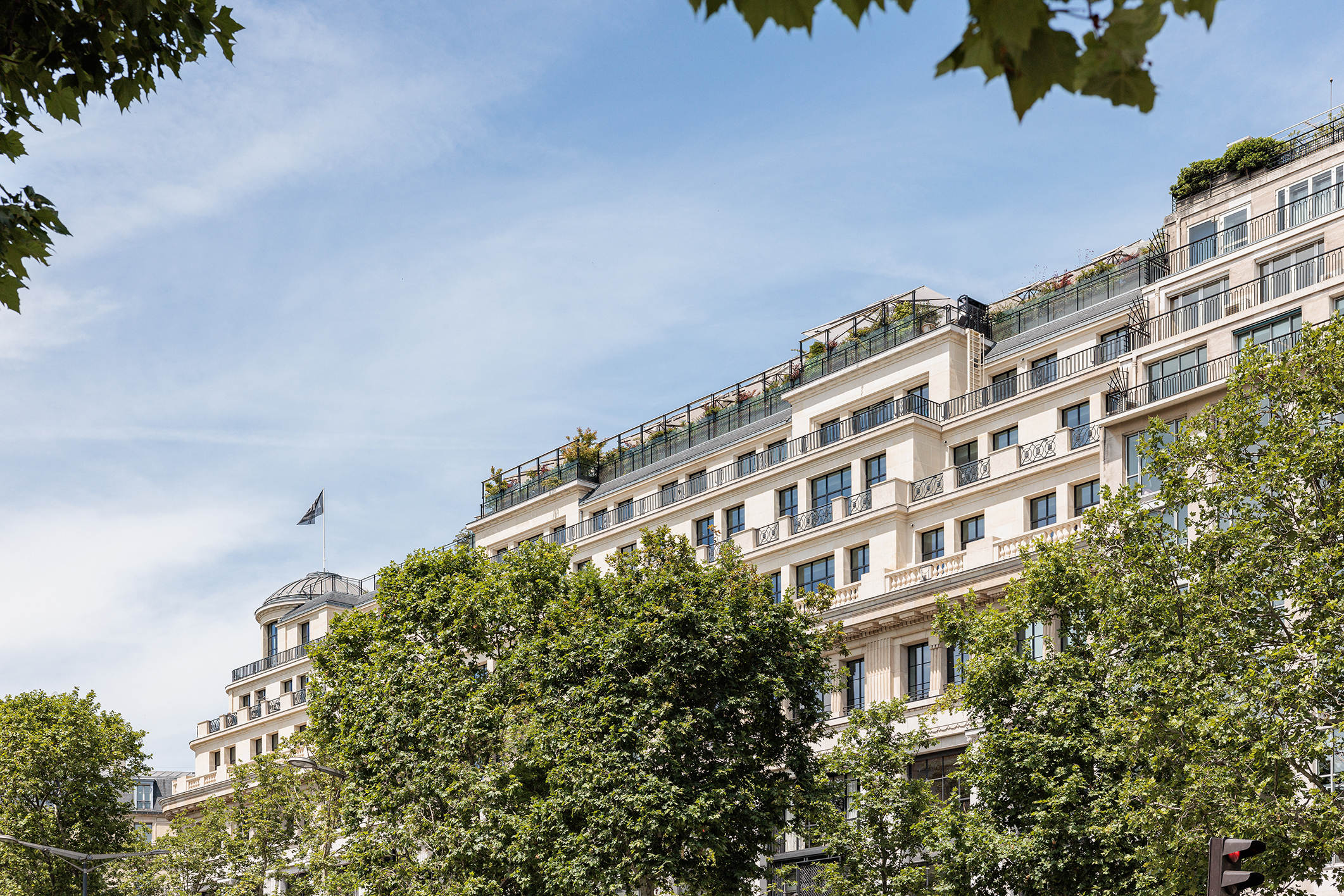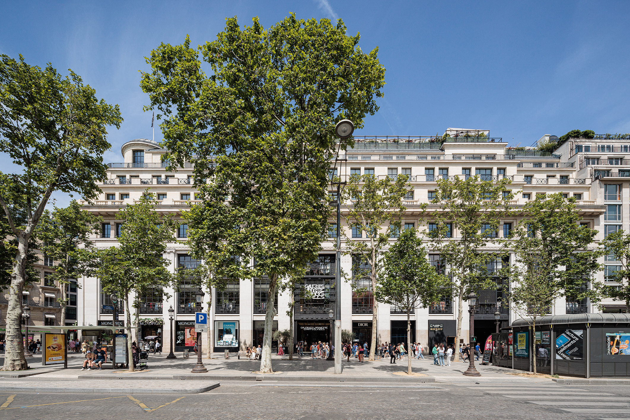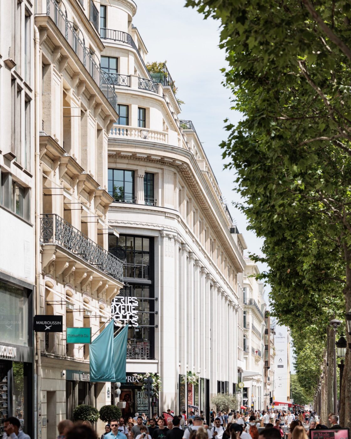 Cet ensemble mixte de bureaux, commerces, espaces de loisirs va dans les sens d’une ville combinant les usages. La présence commerciale est si imposante sur les Champs-Élysées que le parti pris a été de développer un programme de bureau discret et élégant, avec un niveau d’accueil dédié au-dessus des commerces. La modularité des plateaux permet d’intégrer différents types d’espaces de travail souples, lumineux et confortables. Les modes de management s’orientant vers la créativité et l’informalité, les espaces communs sont nombreux et de grande qualité. Une offre de restauration atypique est proposée au R+3, dans un esprit bistro raffiné et décontracté. Au même étage, une terrasse accessible est enrichie d’une végétalisation d’agrément.