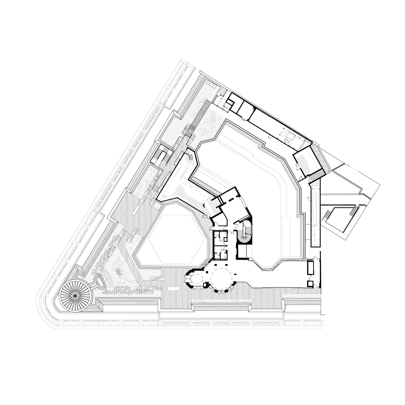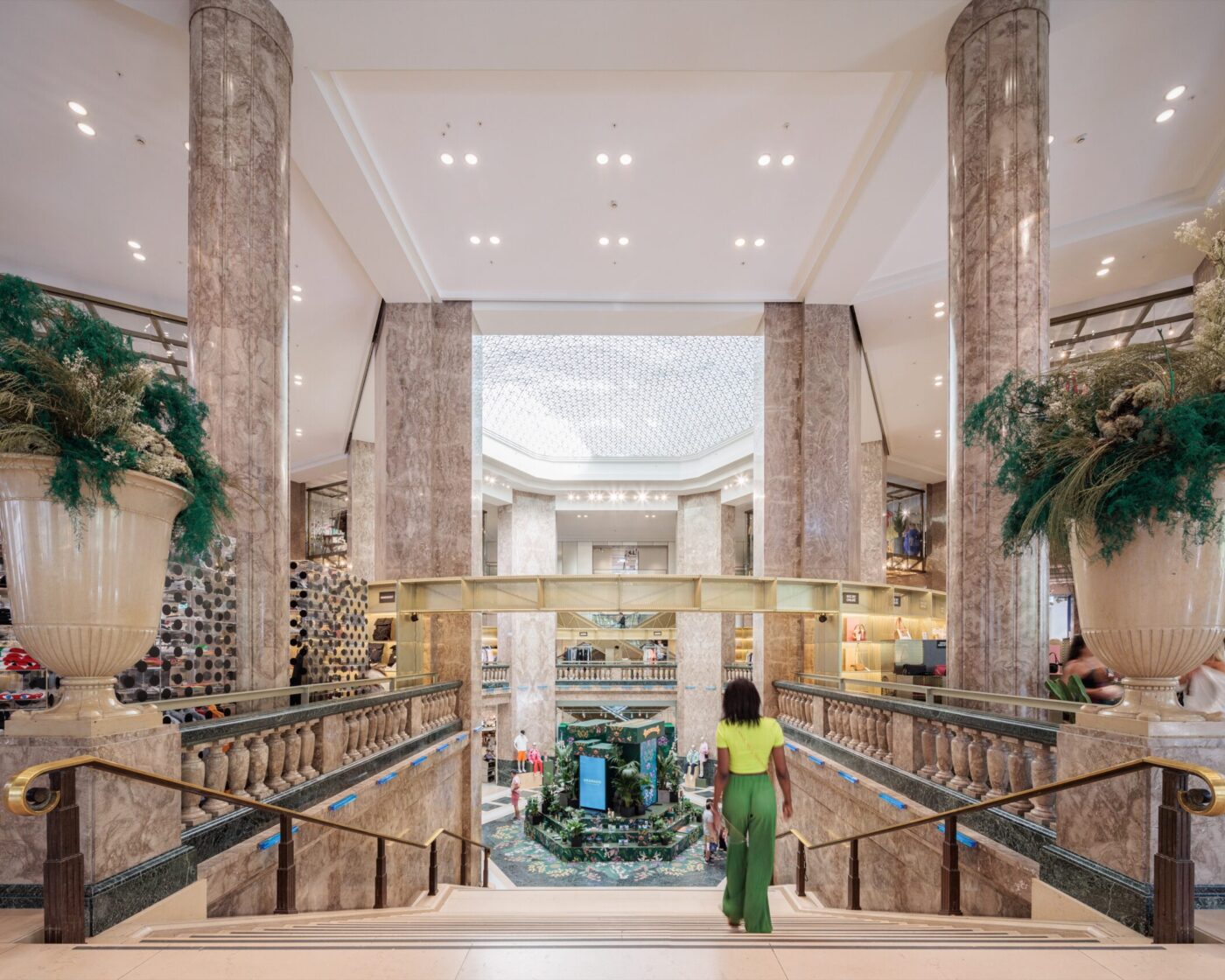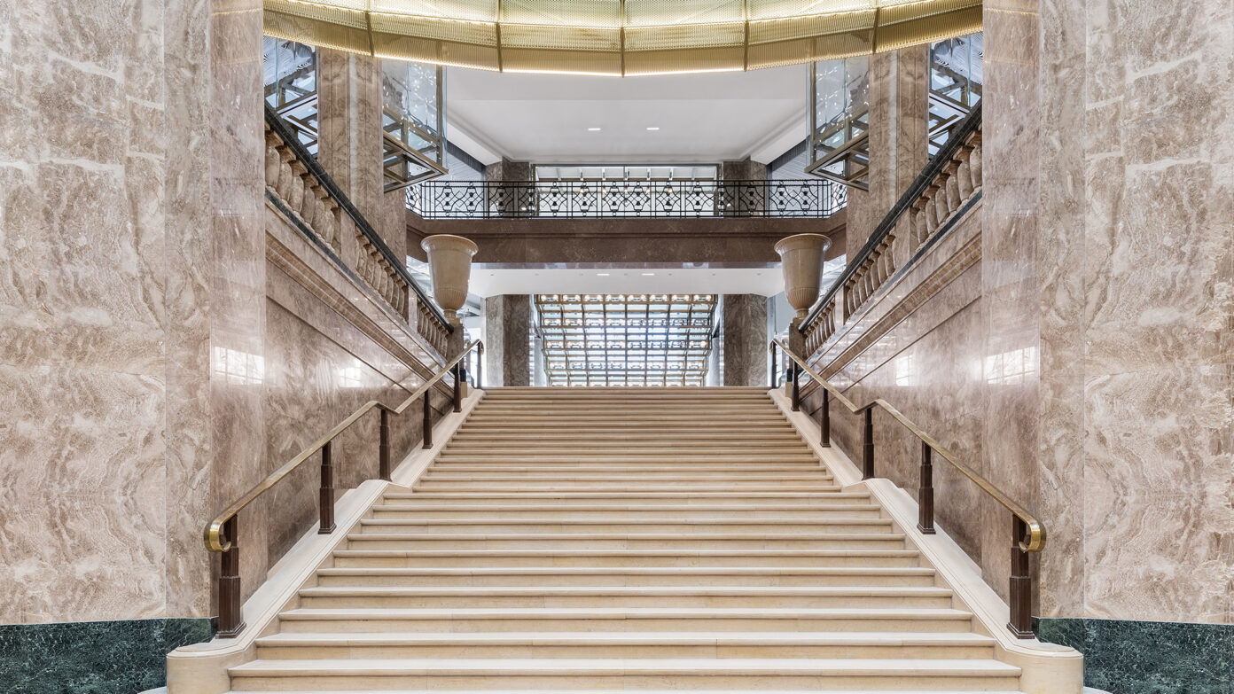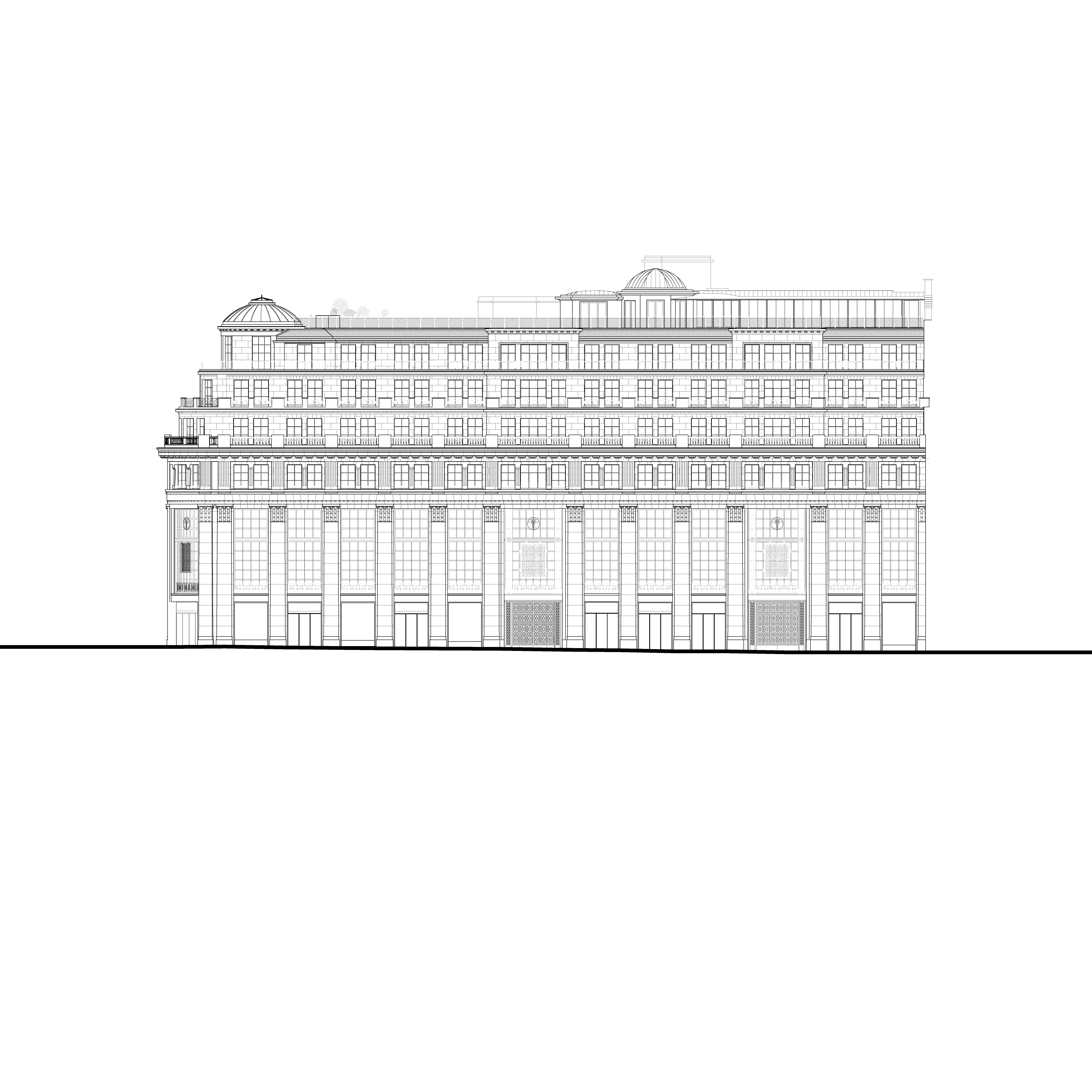 Cet ensemble mixte de bureaux, commerces, espaces de loisirs va dans les sens d’une ville combinant les usages. La présence commerciale est si imposante sur les Champs-Élysées que le parti pris a été de développer un programme de bureau discret et élégant, avec un niveau d’accueil dédié au-dessus des commerces. La modularité des plateaux permet d’intégrer différents types d’espaces de travail souples, lumineux et confortables. Les modes de management s’orientant vers la créativité et l’informalité, les espaces communs sont nombreux et de grande qualité. Une offre de restauration atypique est proposée au R+3, dans un esprit bistro raffiné et décontracté. Au même étage, une terrasse accessible est enrichie d’une végétalisation d’agrément.