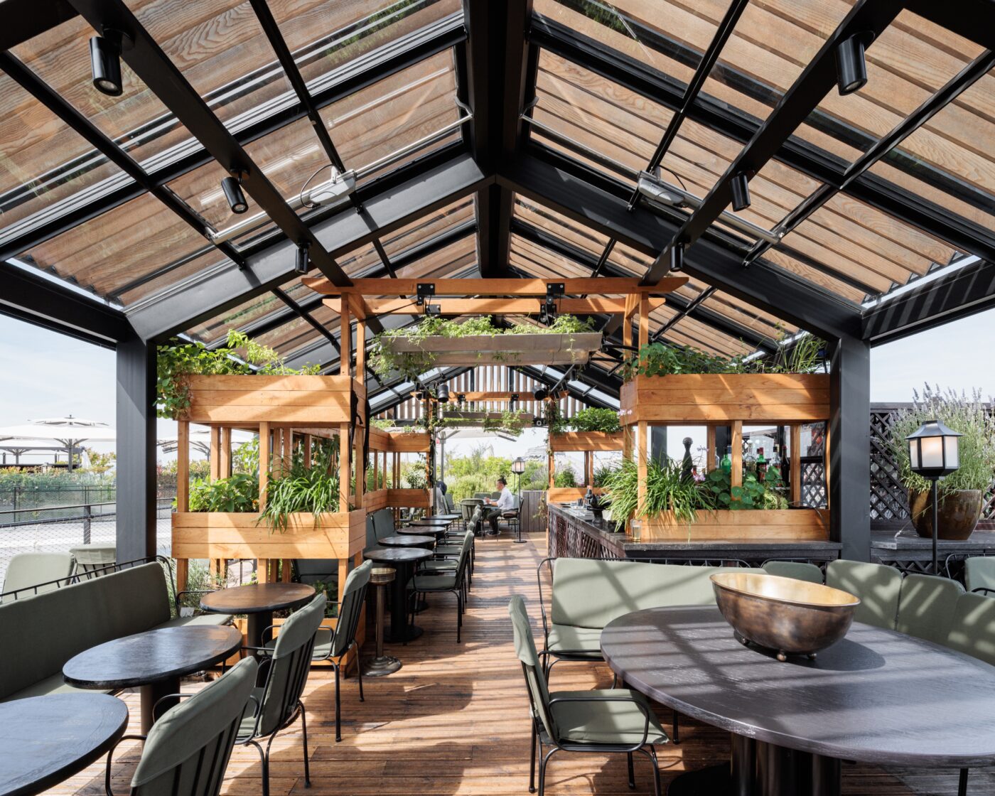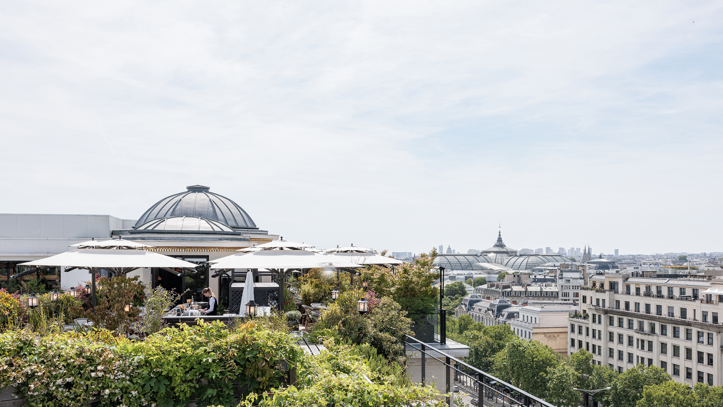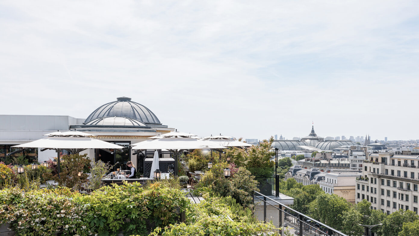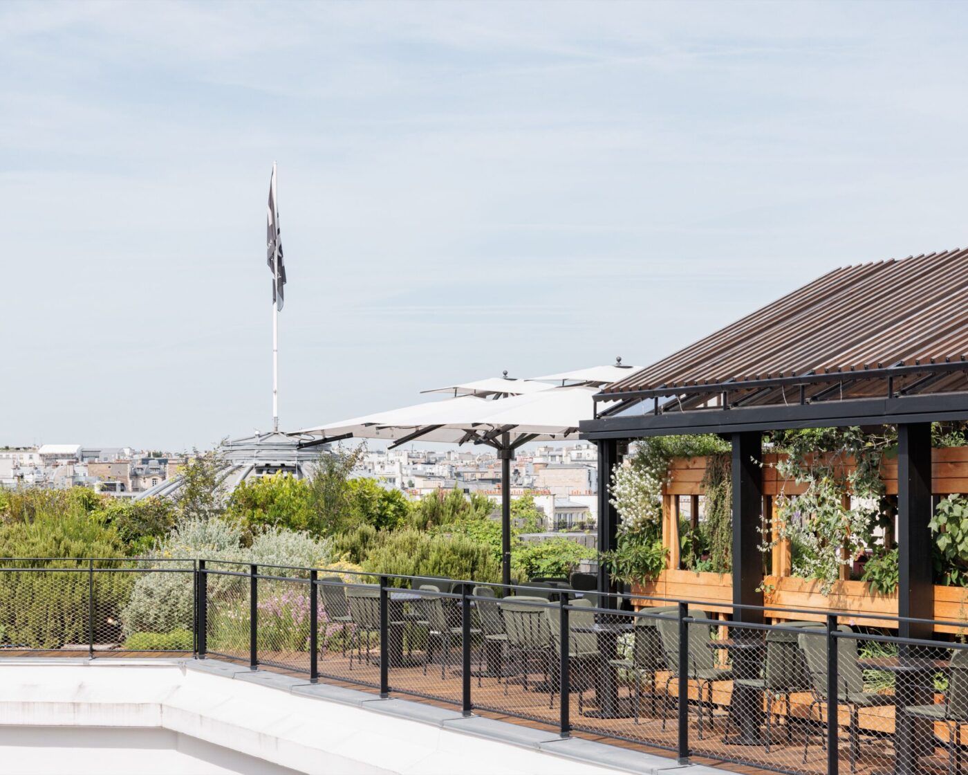 Les espaces extérieurs du 52 Champs sont magnifiés, rouvert au public et végétalisés. Ils participent au bien-être des utilisateurs tout en renforçant l’écosystème général. Les terrasses étaient encombrées d’éléments techniques inutilisés qui sont supprimés, déplacés ou masqués par les aménagements paysagers. De larges espaces sont dégagés pour créer un jardin suspendu. Son parcours bucolique alterne prairies fleuries, parterres d’aromatiques et zones arbustives. Le pavillon à coupoles est rénové et complété par une intervention contemporaine. Au sortir de la promenade champêtre, le visiteur découvre un rooftop bar aux vues exceptionnelles. Un luxueux restaurant occupe la suite de la terrasse, où une serre est aménagée pour des réceptions exclusives. Ces espaces rares contribuent à l’identité et l’image du 52 Champs.