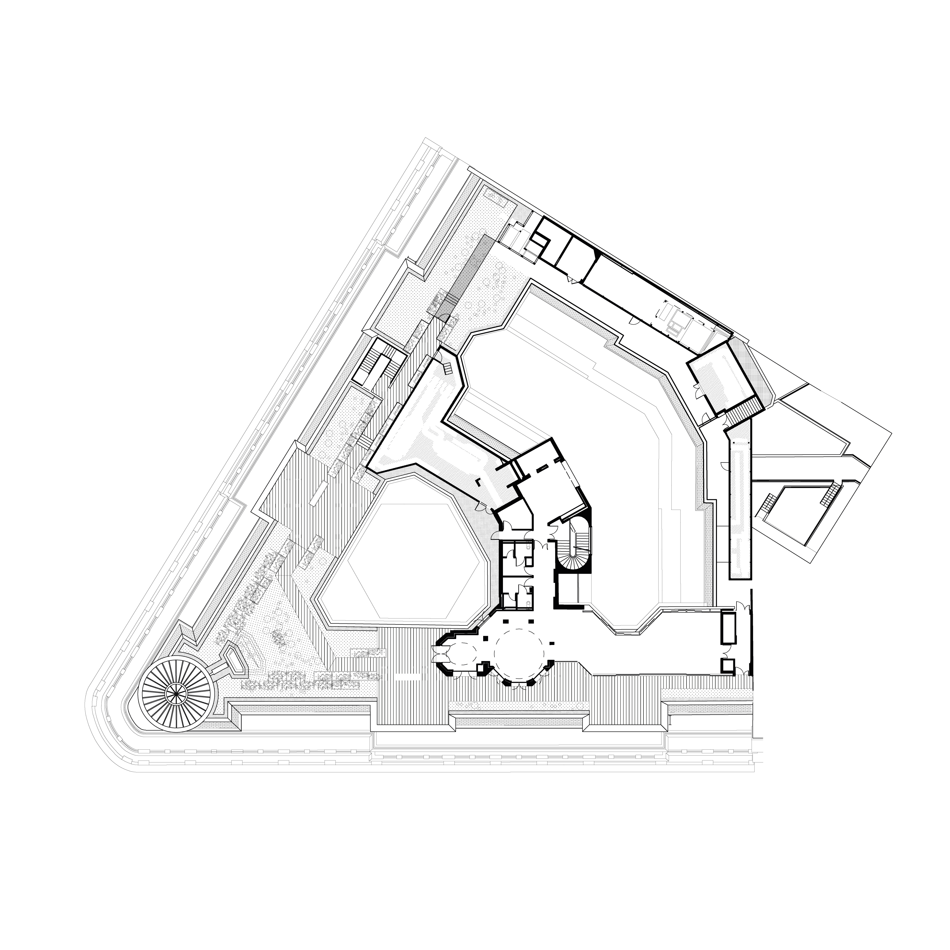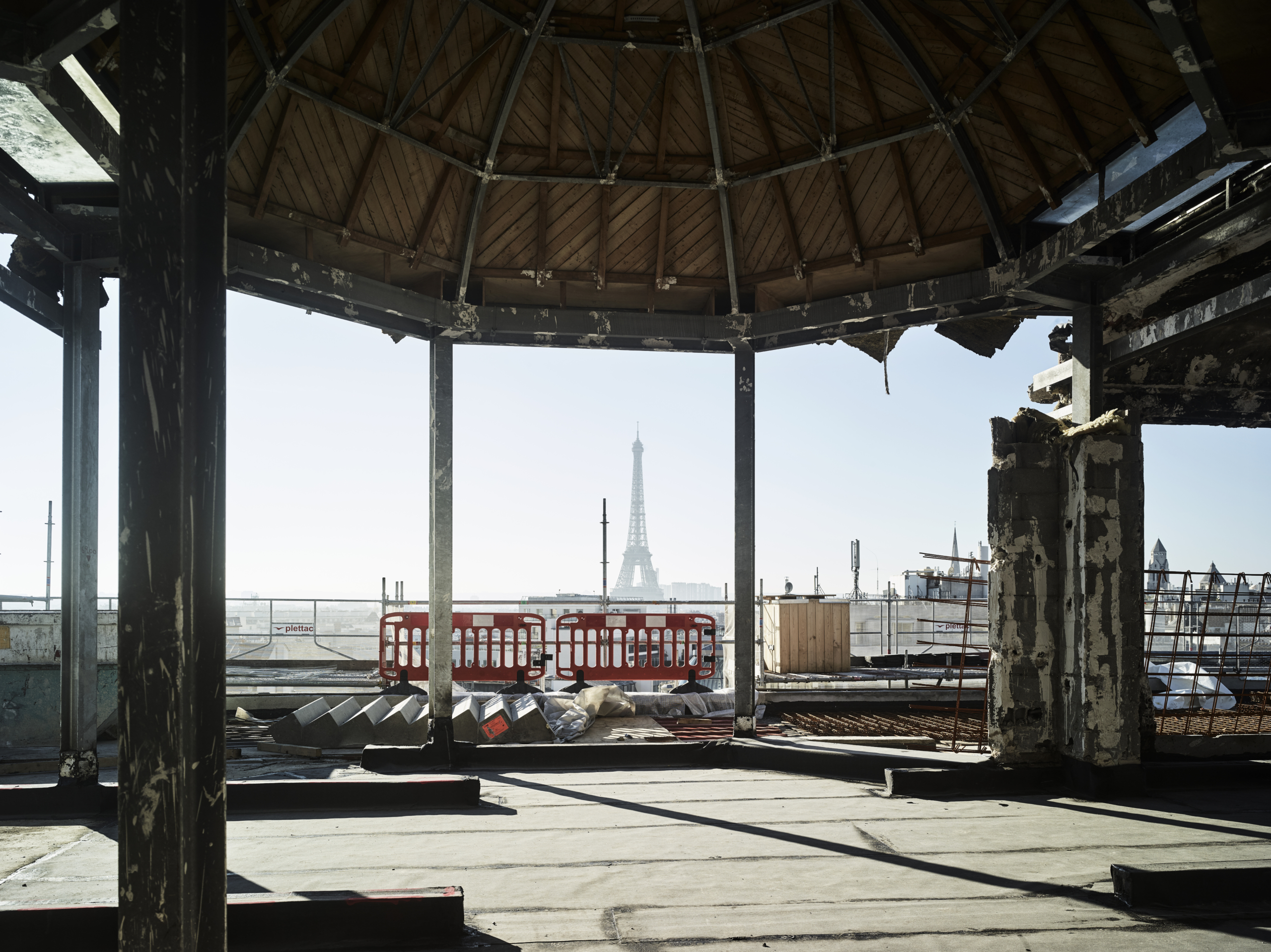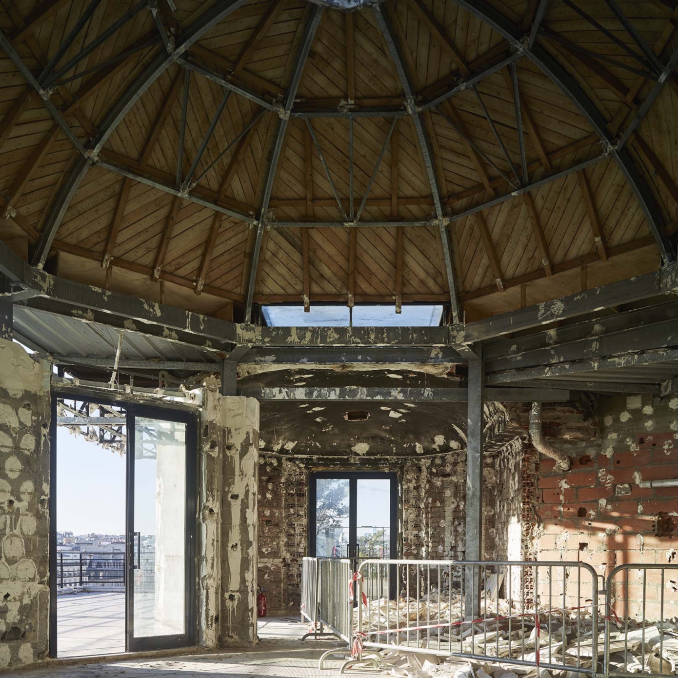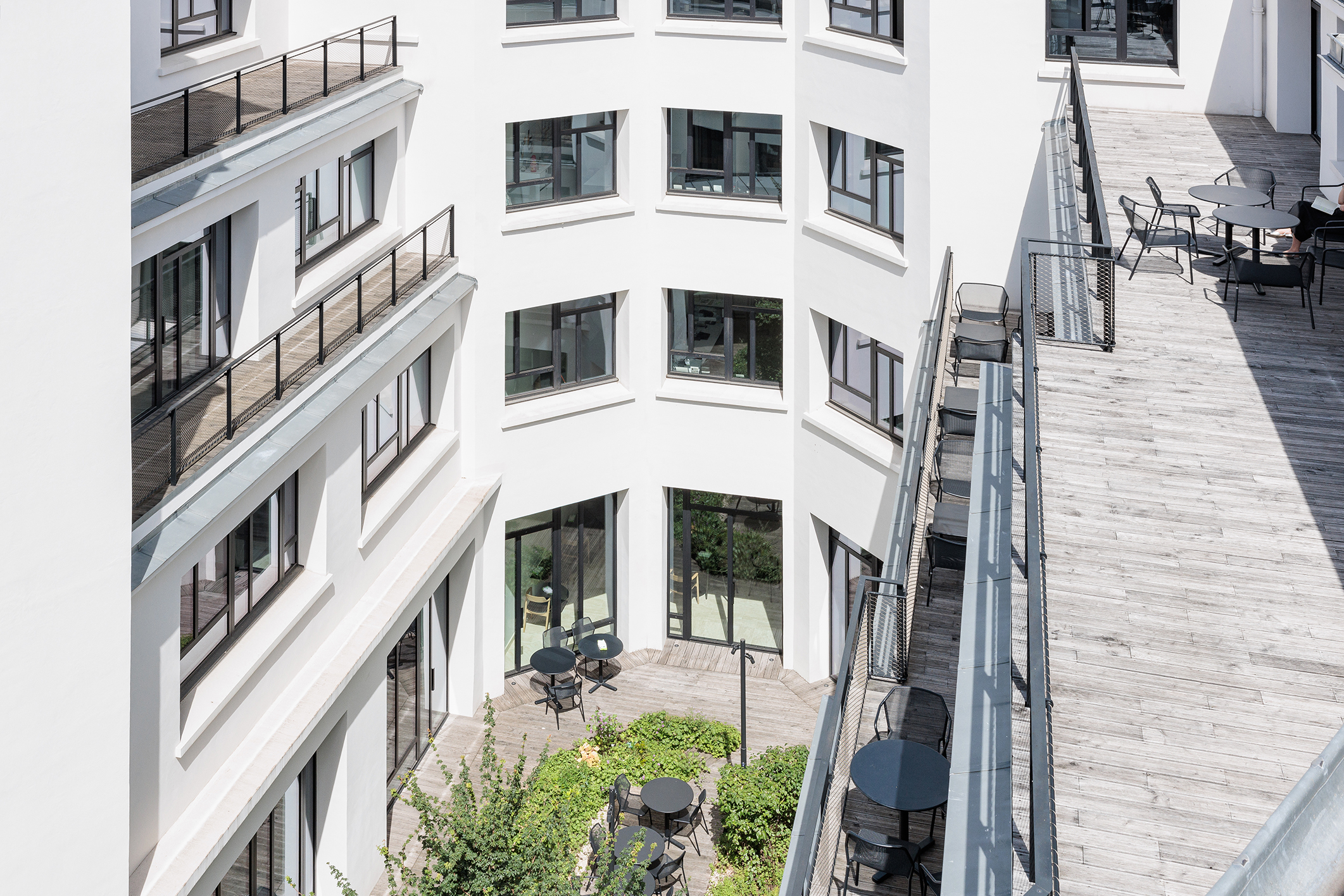 Les espaces extérieurs du 52 Champs sont magnifiés, rouvert au public et végétalisés. Ils participent au bien-être des utilisateurs tout en renforçant l’écosystème général. Les terrasses étaient encombrées d’éléments techniques inutilisés qui sont supprimés, déplacés ou masqués par les aménagements paysagers. De larges espaces sont dégagés pour créer un jardin suspendu. Son parcours bucolique alterne prairies fleuries, parterres d’aromatiques et zones arbustives. Le pavillon à coupoles est rénové et complété par une intervention contemporaine. Au sortir de la promenade champêtre, le visiteur découvre un rooftop bar aux vues exceptionnelles. Un luxueux restaurant occupe la suite de la terrasse, où une serre est aménagée pour des réceptions exclusives. Ces espaces rares contribuent à l’identité et l’image du 52 Champs.