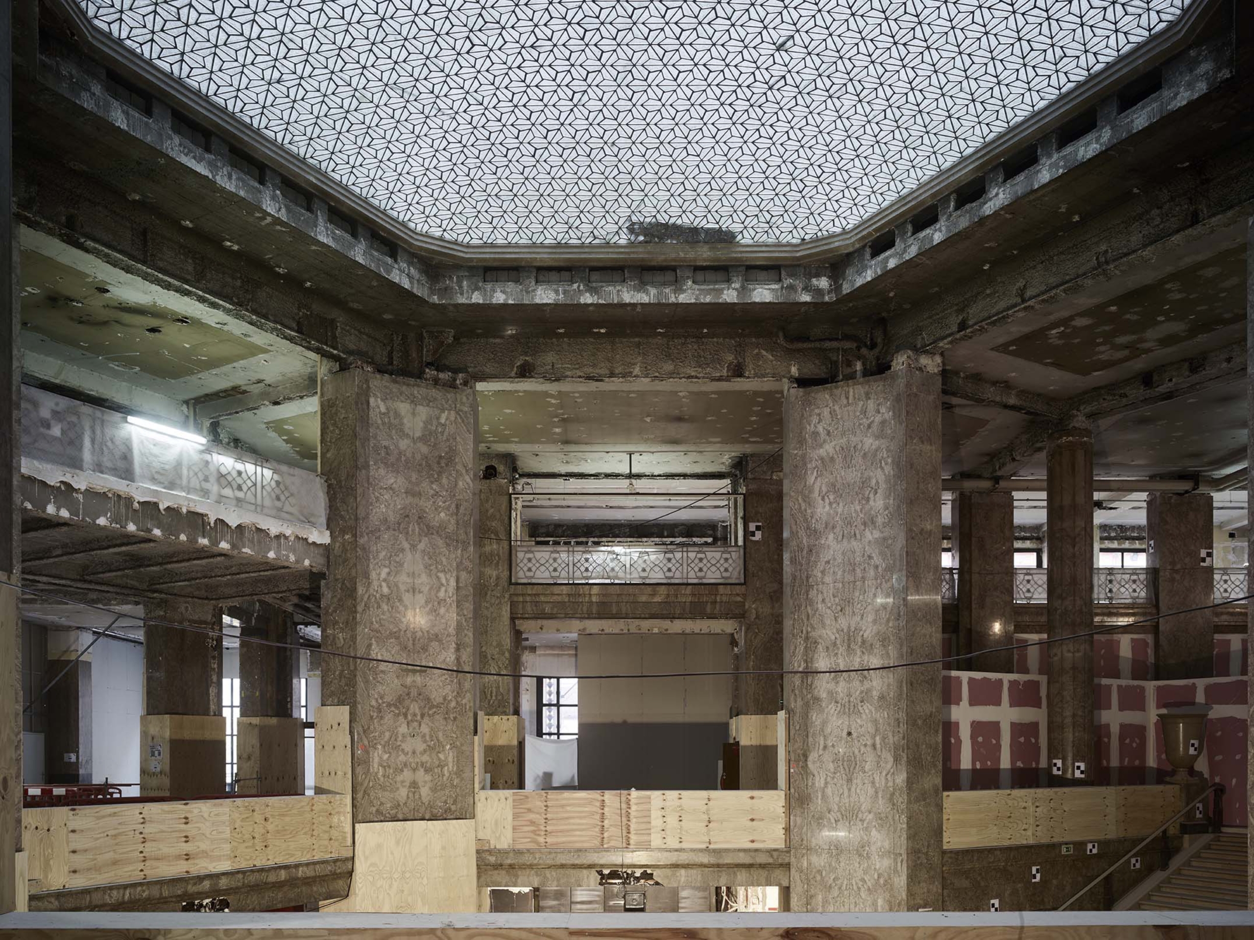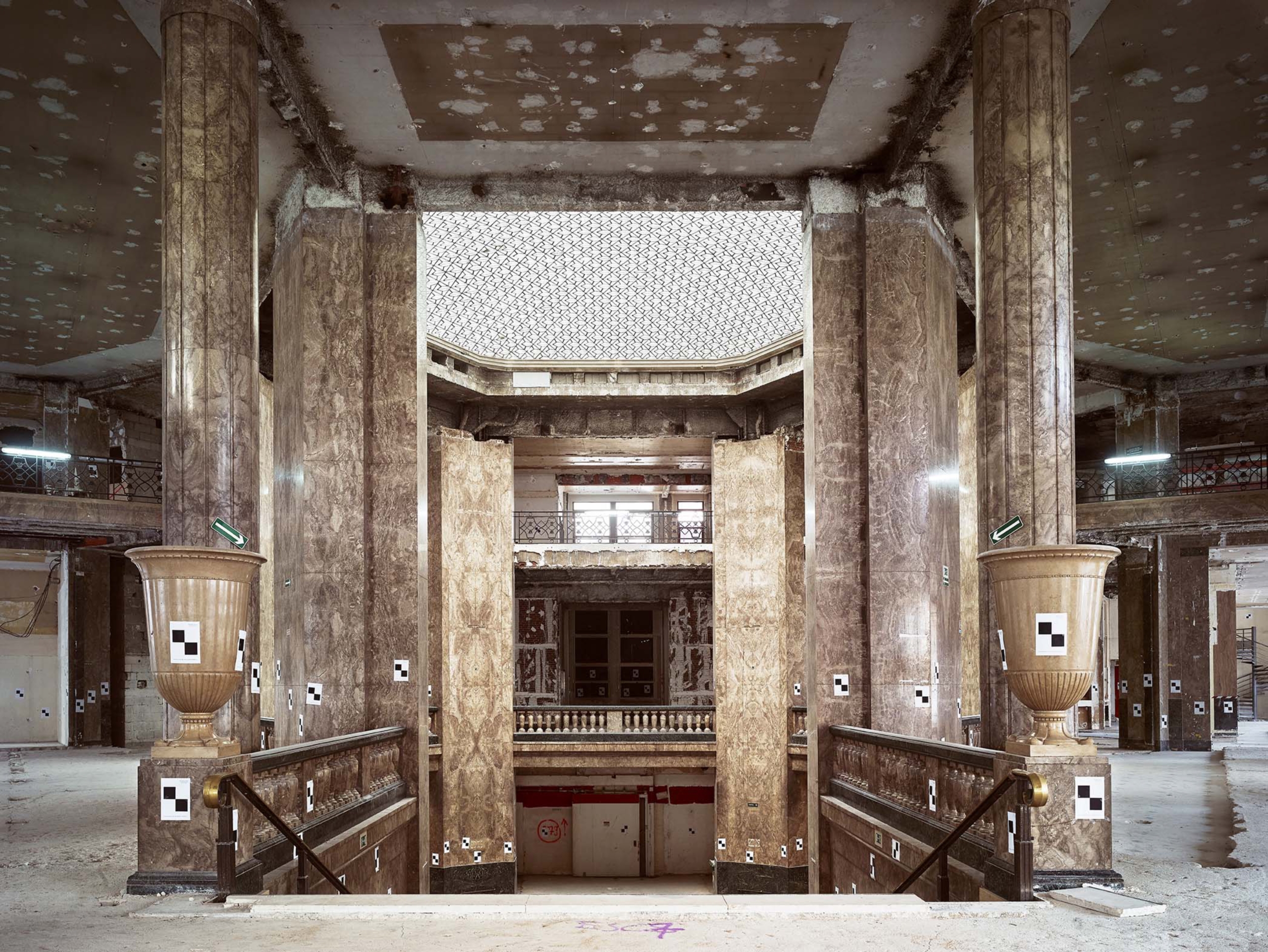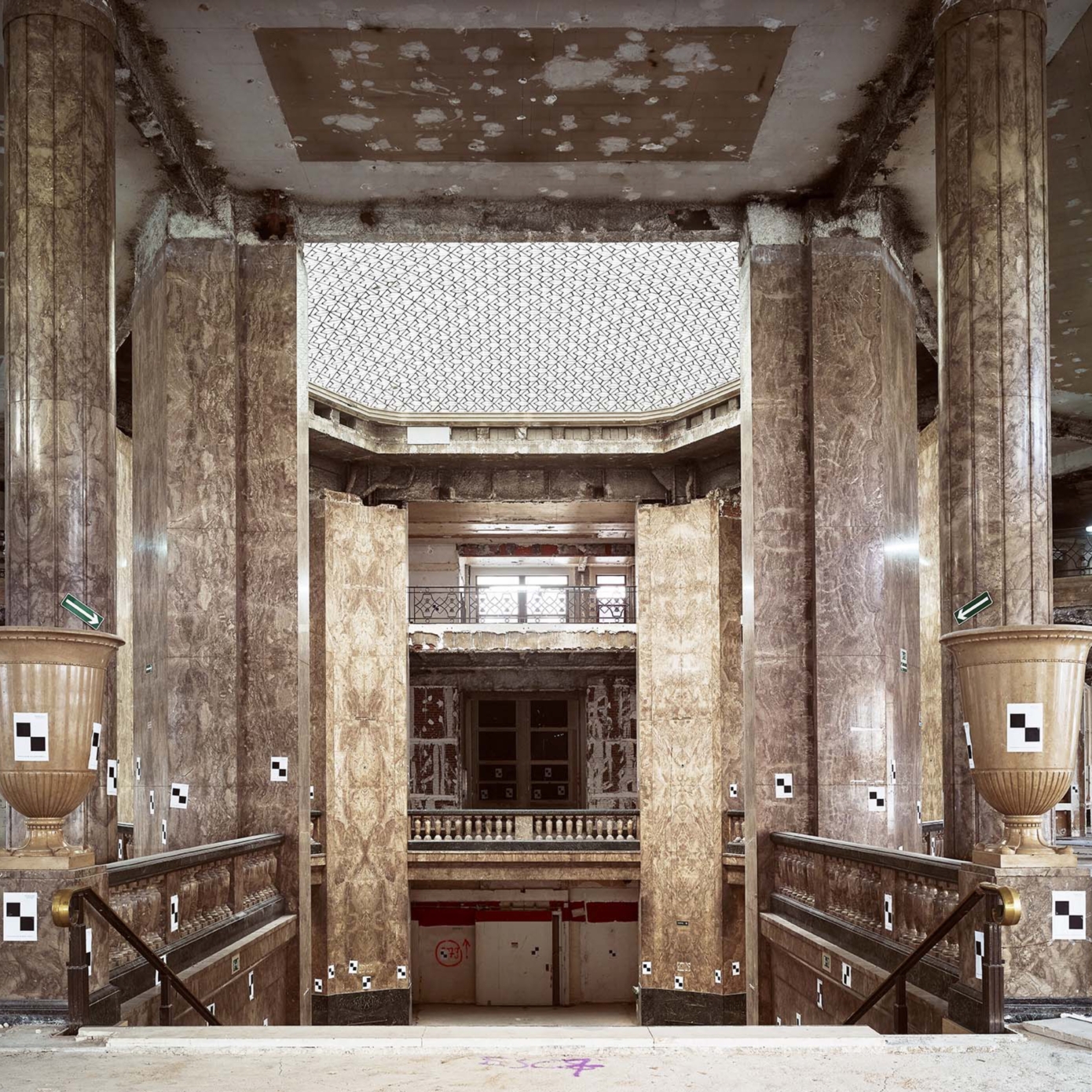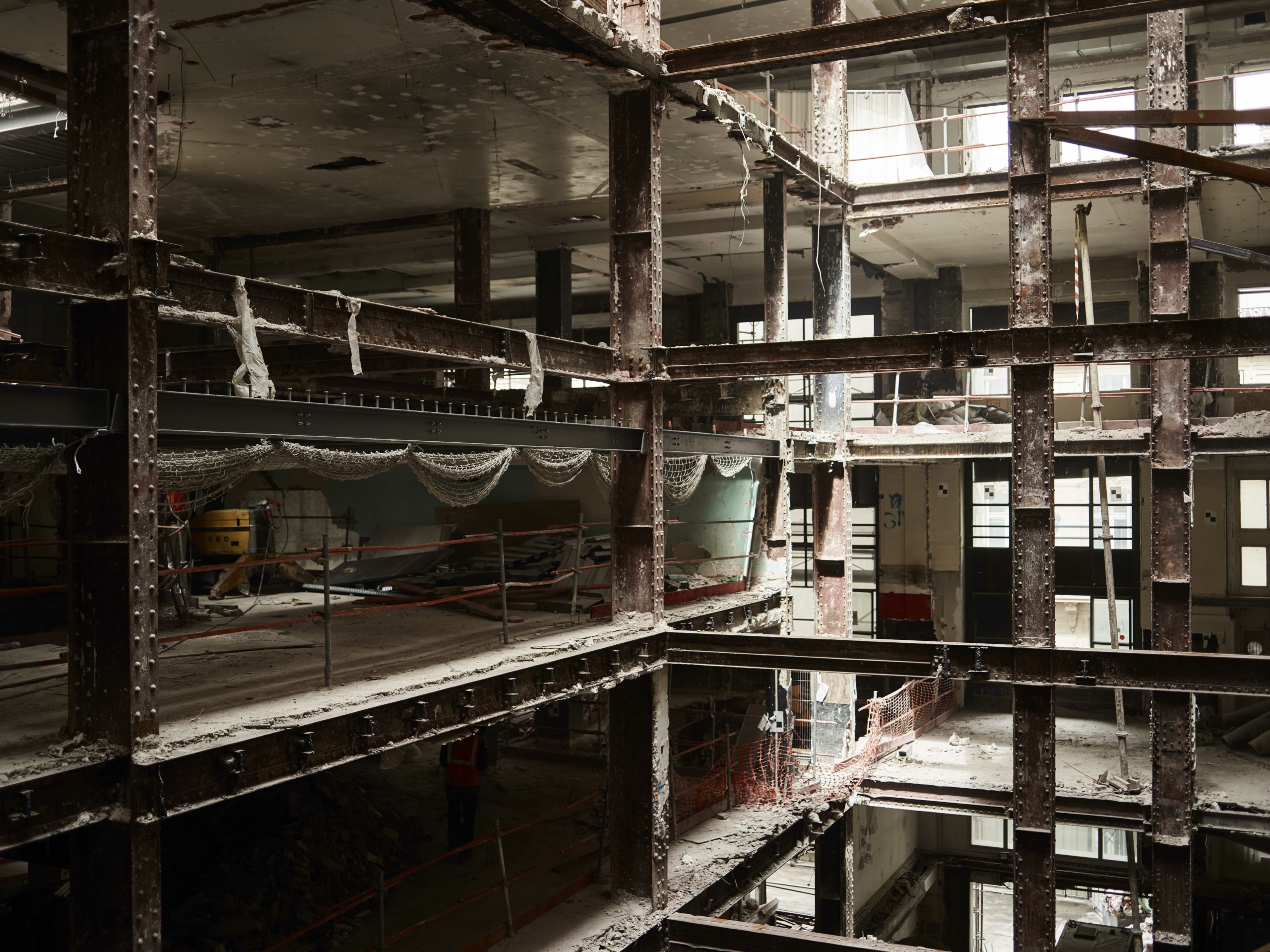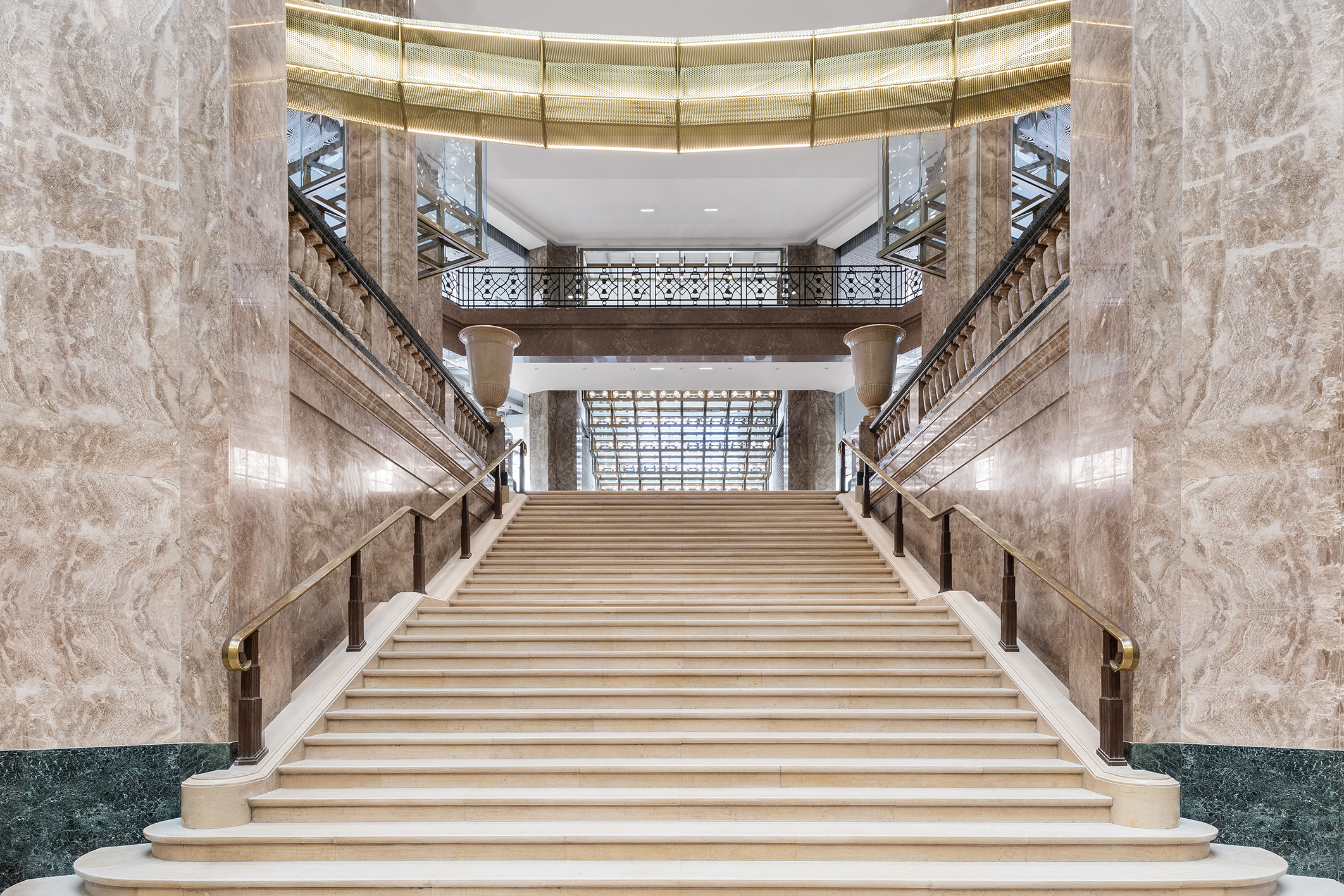 Différentes campagnes de travaux ont perturbé l’image du 52 Champs, notamment dans les années 1930 avec l’installation d’un Prisunic et d’un cinéma, puis 1960, qui voient la galerie et les aménagements de la terrasse détruits ou dénaturés À la fin des années 1980, avec le départ de la National City Bank et l’arrivée du Virgin Megastore, d’importants travaux d’aménagement, de façade et d’extension des surfaces de vente sont menés. Le bâtiment ne répondant aujourd’hui plus aux normes, une restructuration lourde était nécessaire, tout en soulignant les éléments patrimoniaux, qui sont remis en valeur, notamment l’escalier d’honneur et les décors intérieurs de la National City Bank, avec ses vases monumentaux, appliques à palmettes, balustres, habillages de marbre ou boiseries de Jacques-Émile Ruhlman. Les menuiseries remarquables de Raymond Subes en façade sont restituées. La grille majestueuse à l’entrée de la galerie sur les Champs est restaurée, son dessin devenant le modèle des nouvelles grilles. Les baies et vitrines sont reprises dans un dessin simplifié. La répartition du programme est clarifiée : commerces du sous-sol jusqu’au R+2 et bureaux du R+3 au R+7.