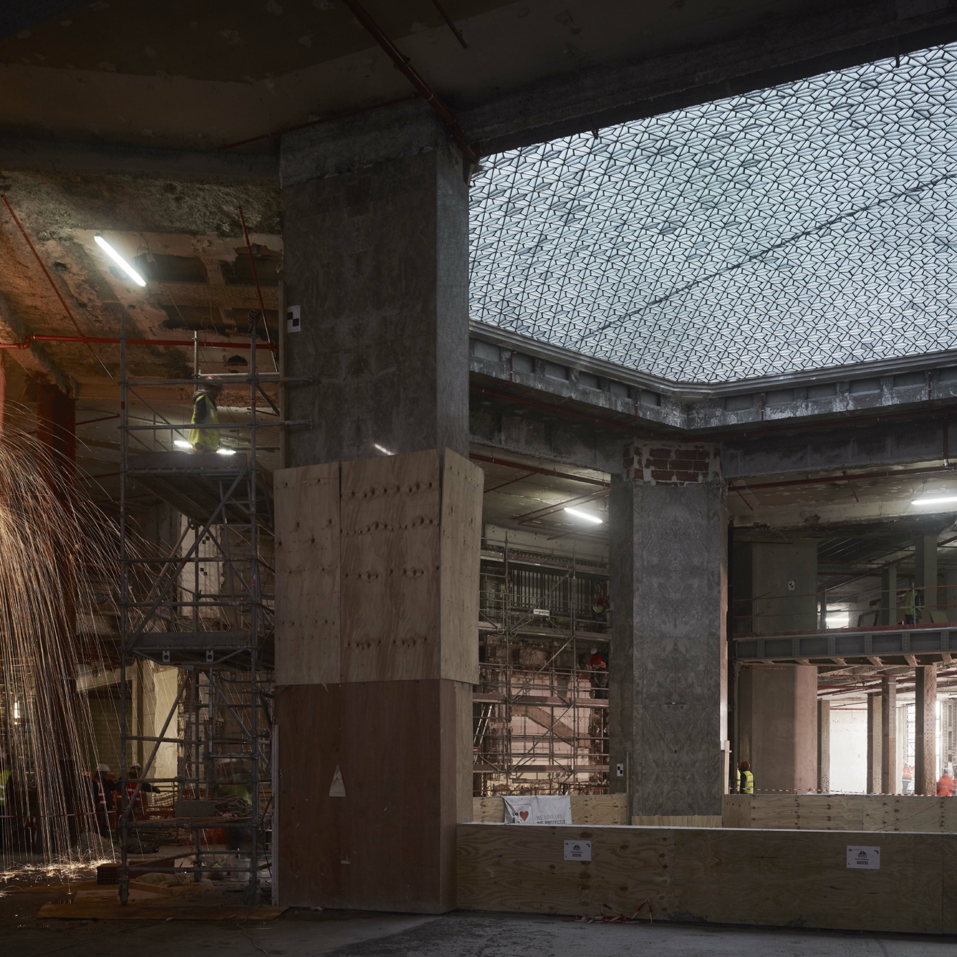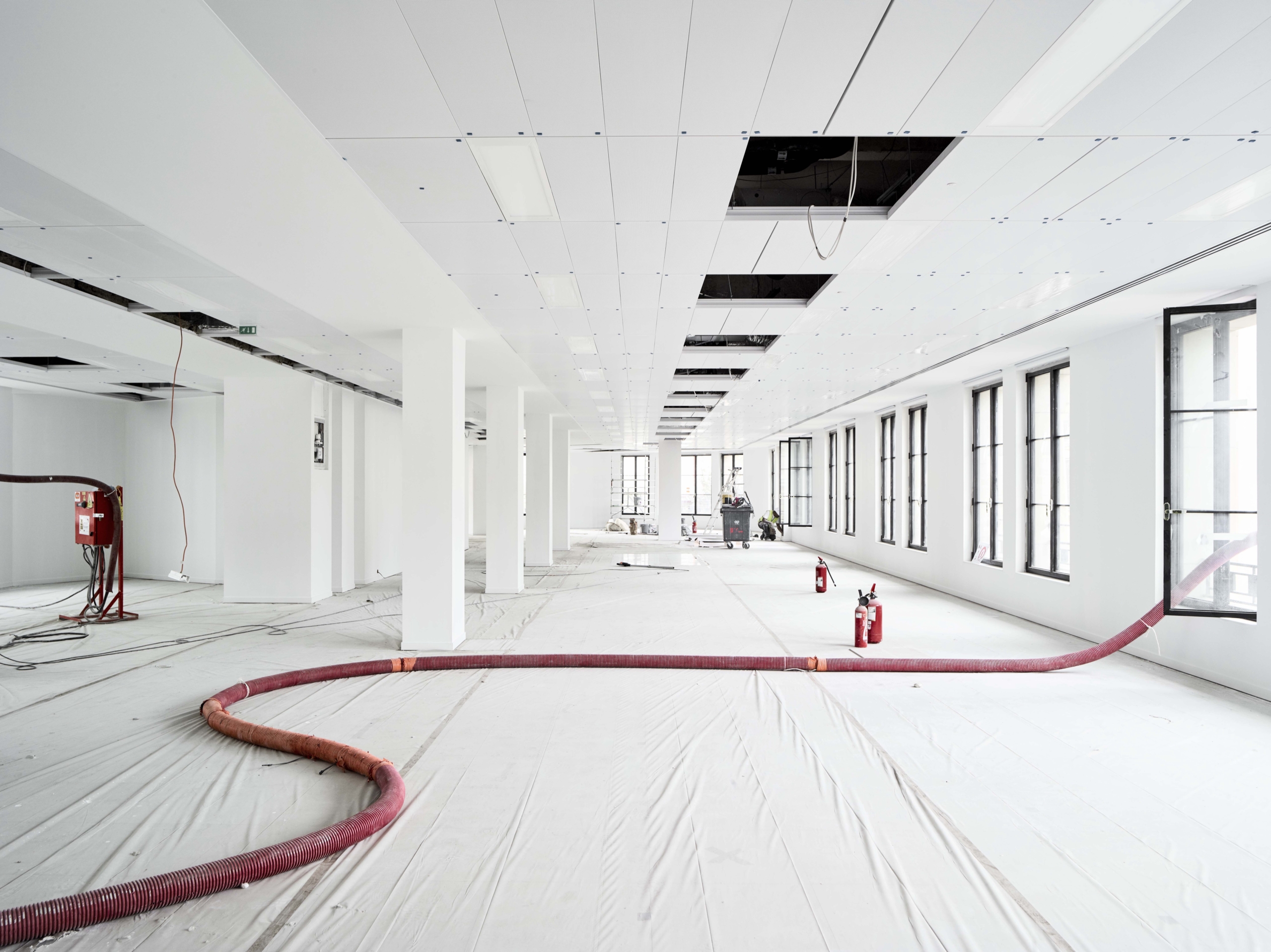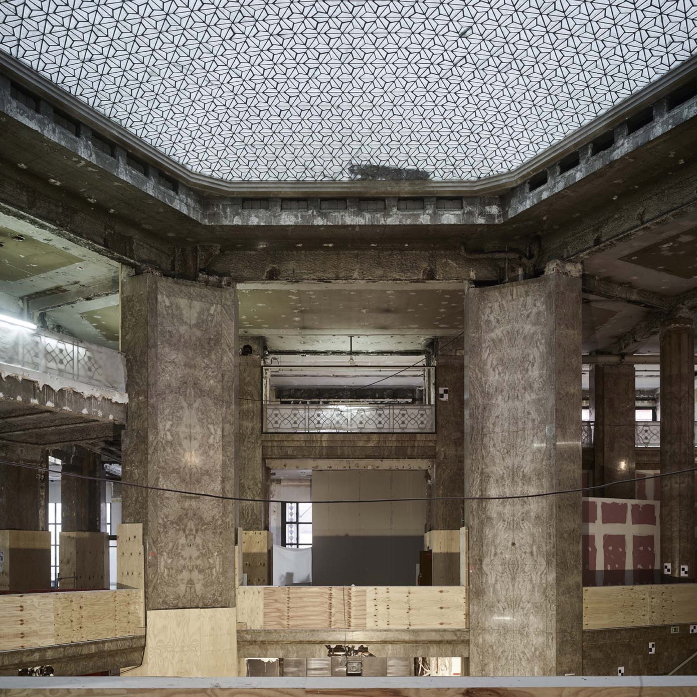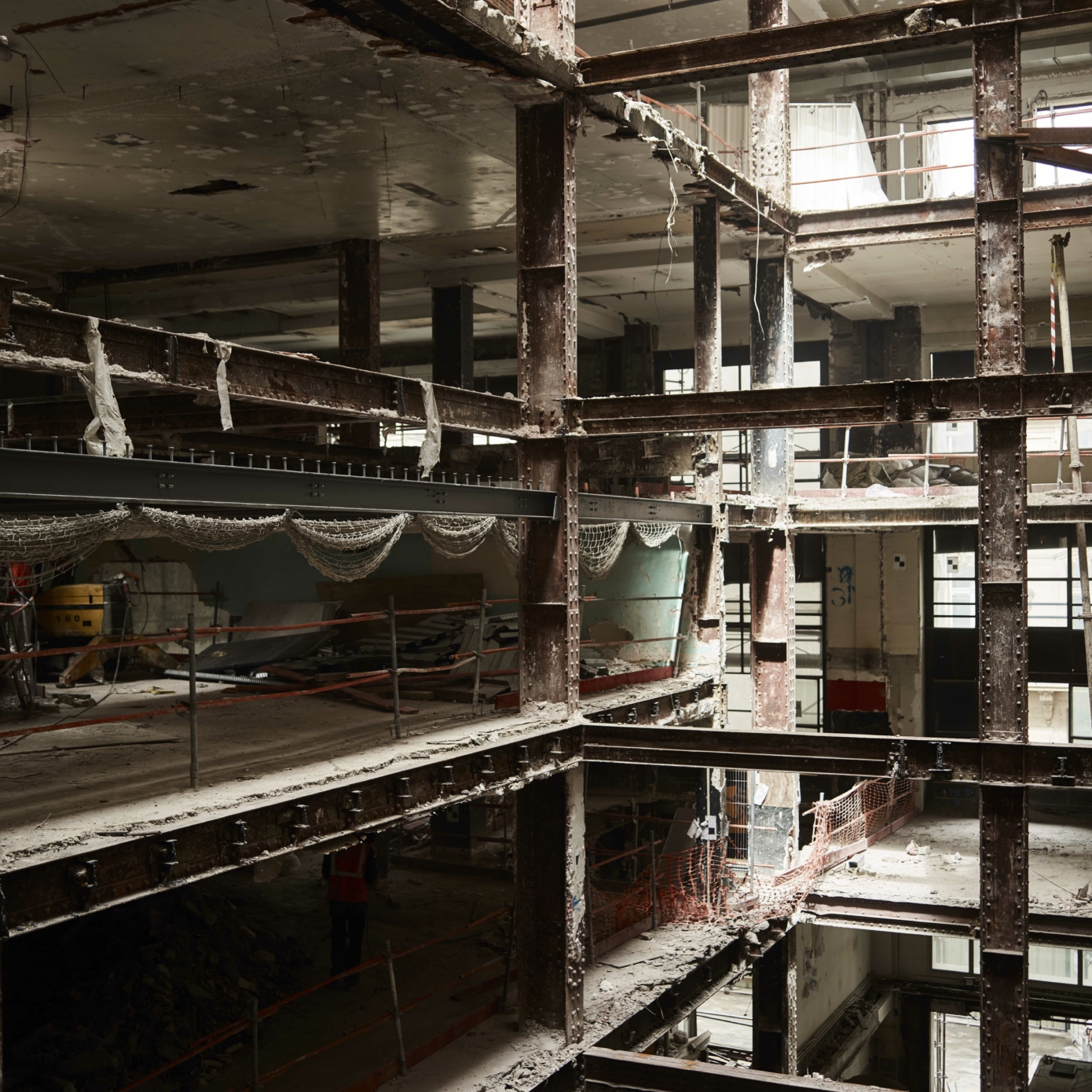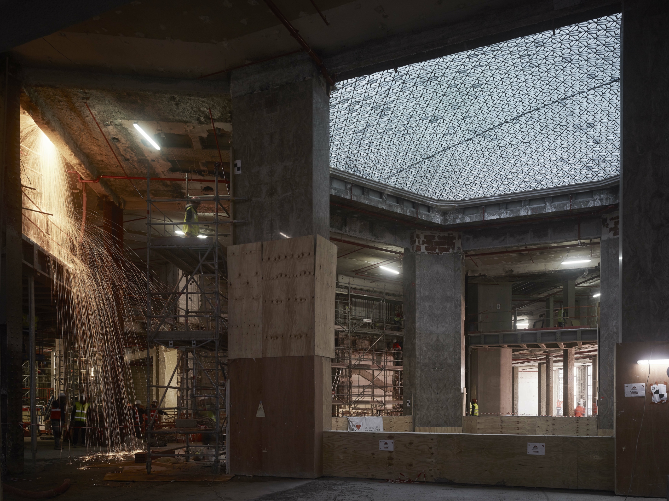 Différentes campagnes de travaux ont perturbé l’image du 52 Champs, notamment dans les années 1930 avec l’installation d’un Prisunic et d’un cinéma, puis 1960, qui voient la galerie et les aménagements de la terrasse détruits ou dénaturés À la fin des années 1980, avec le départ de la National City Bank et l’arrivée du Virgin Megastore, d’importants travaux d’aménagement, de façade et d’extension des surfaces de vente sont menés. Le bâtiment ne répondant aujourd’hui plus aux normes, une restructuration lourde était nécessaire, tout en soulignant les éléments patrimoniaux, qui sont remis en valeur, notamment l’escalier d’honneur et les décors intérieurs de la National City Bank, avec ses vases monumentaux, appliques à palmettes, balustres, habillages de marbre ou boiseries de Jacques-Émile Ruhlman. Les menuiseries remarquables de Raymond Subes en façade sont restituées. La grille majestueuse à l’entrée de la galerie sur les Champs est restaurée, son dessin devenant le modèle des nouvelles grilles. Les baies et vitrines sont reprises dans un dessin simplifié. La répartition du programme est clarifiée : commerces du sous-sol jusqu’au R+2 et bureaux du R+3 au R+7.