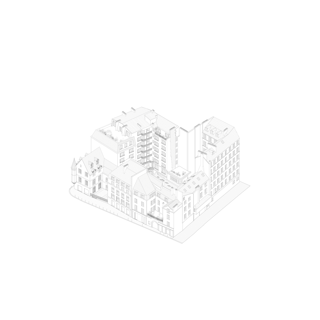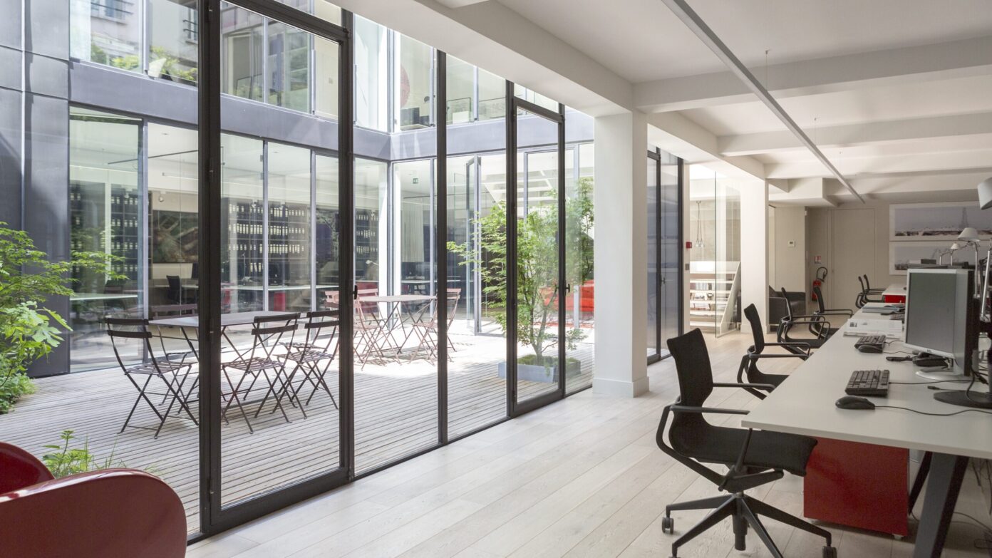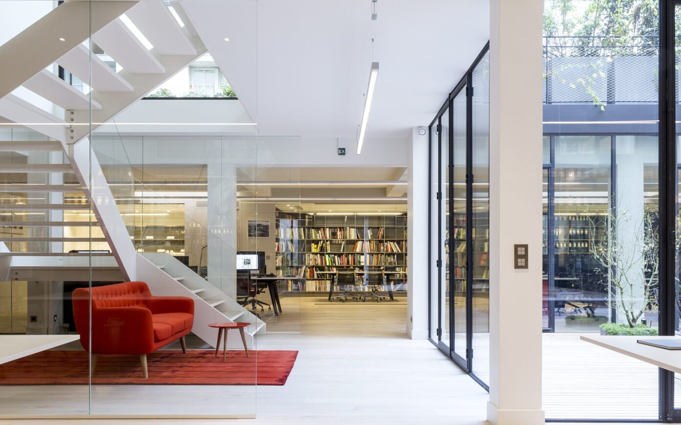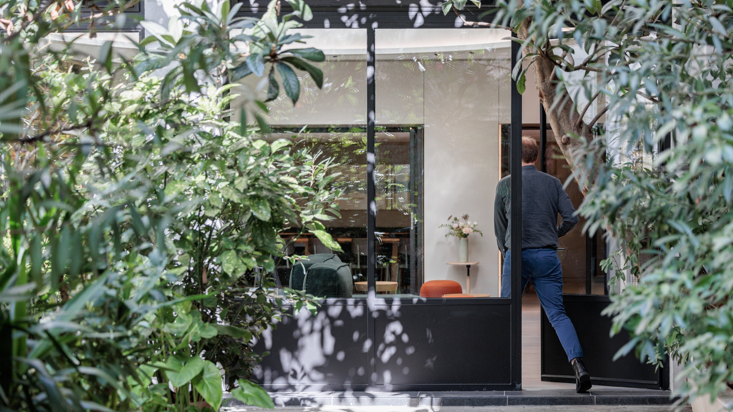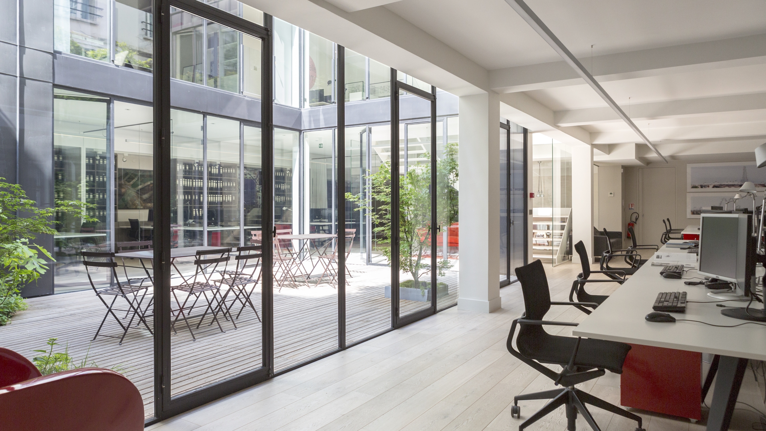 Le 56-58, rue Vieille-du-Temple prend place au cœur du Marais, dans le 3e arrondissement de Paris. Le quartier permet aux collaborateurs de profiter des musées, galeries, boutiques et restaurants proches. Sa position centrale favorise les transports en communs et modes de déplacements doux. En plein cœur du bouillonnement urbain mais secrètement nichée dans l’écrin d’une cour arborée, l’agence occupe l’emplacement d’une ancienne imprimerie dont PCA-STREAM a restructuré le pavillon et mené une démolition partielle des ateliers. Leurs sheds en béton, peu qualitatifs, ont été supprimés pour créer un patio au R-1. Les espaces de travail principaux s’implantent autour de ce vide qui fait office de puits de lumière. Le bâtiment neuf en L s’enroule au-dessus du patio. Son entrée présente un pignon vitré rappelant une maison stylisée. Le R+1 sur rue accueille les équipes chantiers, les garages en fond de cour l’atelier maquettes, surmonté au R+1 sur cour d’un appartement de réception polyvalent. Une seconde entrée sur cour mène au Stream Innovation Center. Au total, l’agence se déploie sur plus de 800 m2.